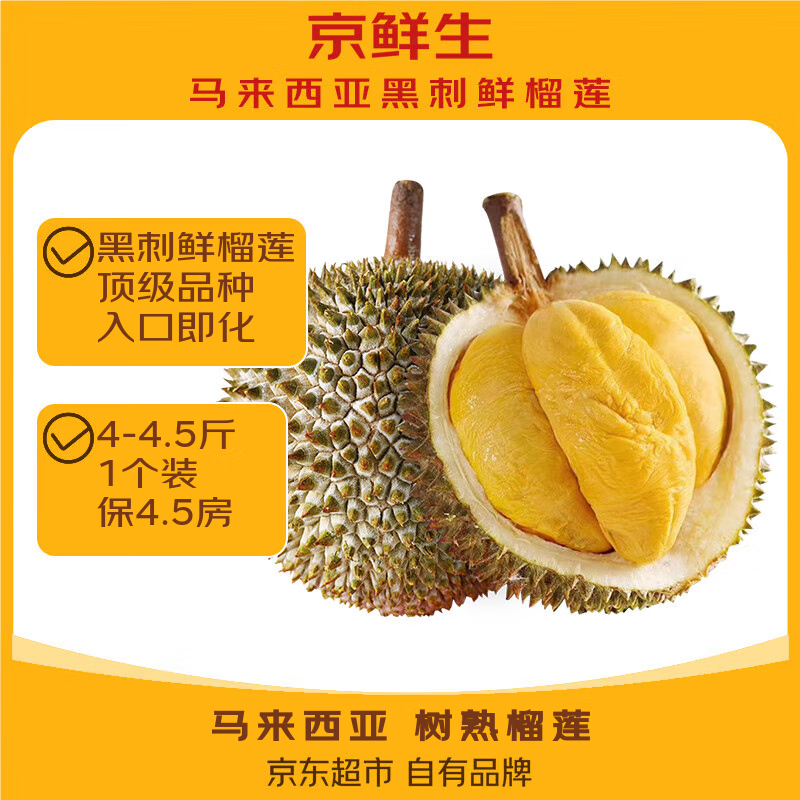 京鲜生 马来西亚黑刺鲜榴莲 4.0-4.5斤 1个装 保4.5房 源头直发 包邮