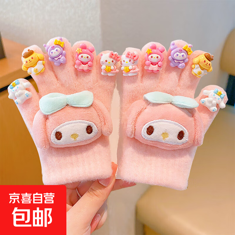 儿童卡通可爱手套冬季保暖防冻男女美甲DIY宝宝女孩加厚五指手套 粉美乐蒂 3-12岁