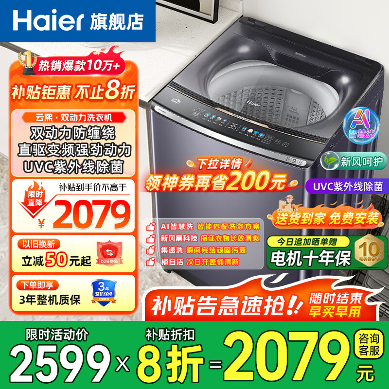海尔(Haier)波轮洗衣机双动力防缠绕直驱变频10公斤全自动家用大容量杀菌新风一级能效以旧换新补贴云熙358S 【门店同款BZ358S】高颜彩屏+羽绒洗+智慧洗