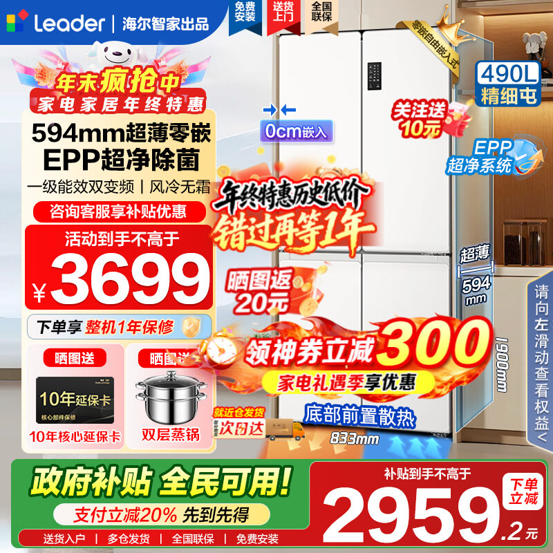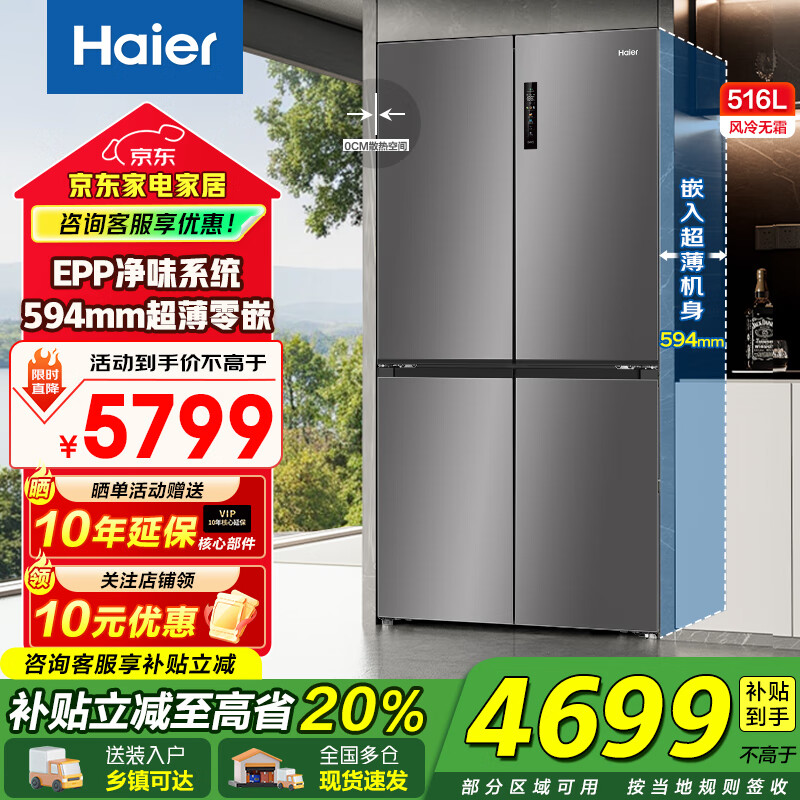 海尔冰箱出品516超薄Leader零嵌入式490升四开门双开门十字门家用风冷无霜一级能效底部散热国家补贴 490升零嵌+594mm超薄+EPP超净+干湿分储
