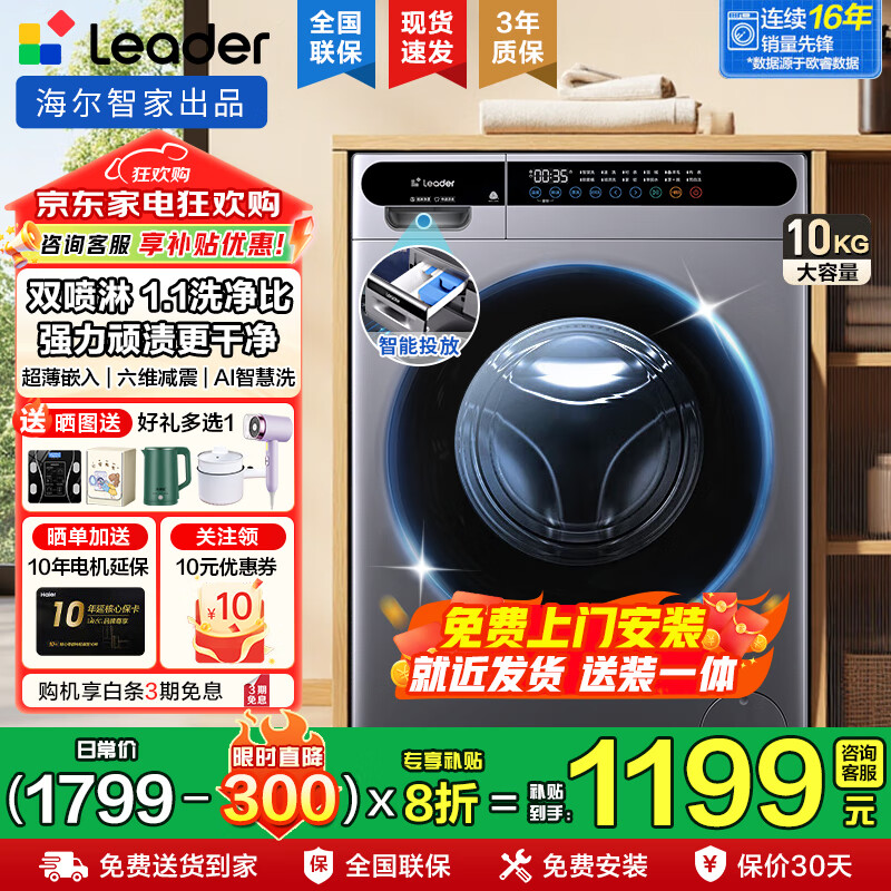 海尔洗衣机洗烘一体带烘干10公斤全自动滚筒洗衣机容量一级能效节能超薄嵌入除菌螨统帅以旧换新补贴 【旗舰款】洗脱一体丨高洗净比丨六维减震