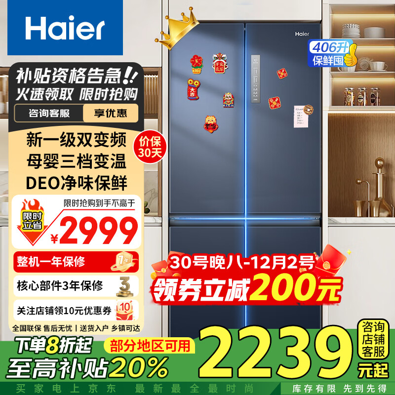海尔(Haier)冰箱四开门一级能效风冷无霜超薄嵌入式电冰箱十字门家用大容量双门冰箱对开门以旧换新 406升星石蓝【一级双变频+风冷无霜+母婴空间】