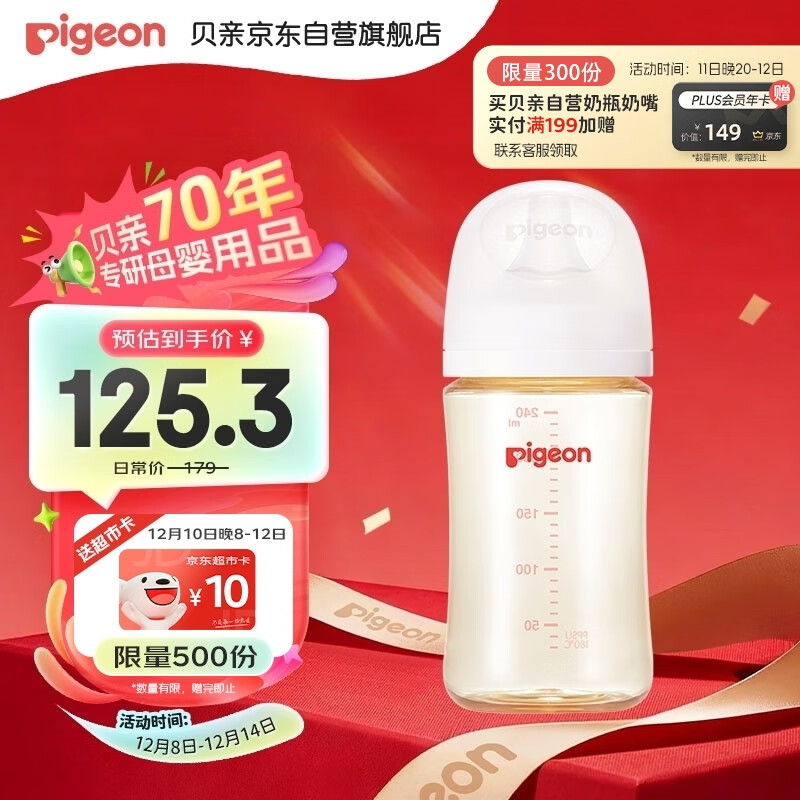 贝亲(Pigeon)PPSU宽口径防胀气奶瓶240ml L号奶嘴 6个月+ AA192