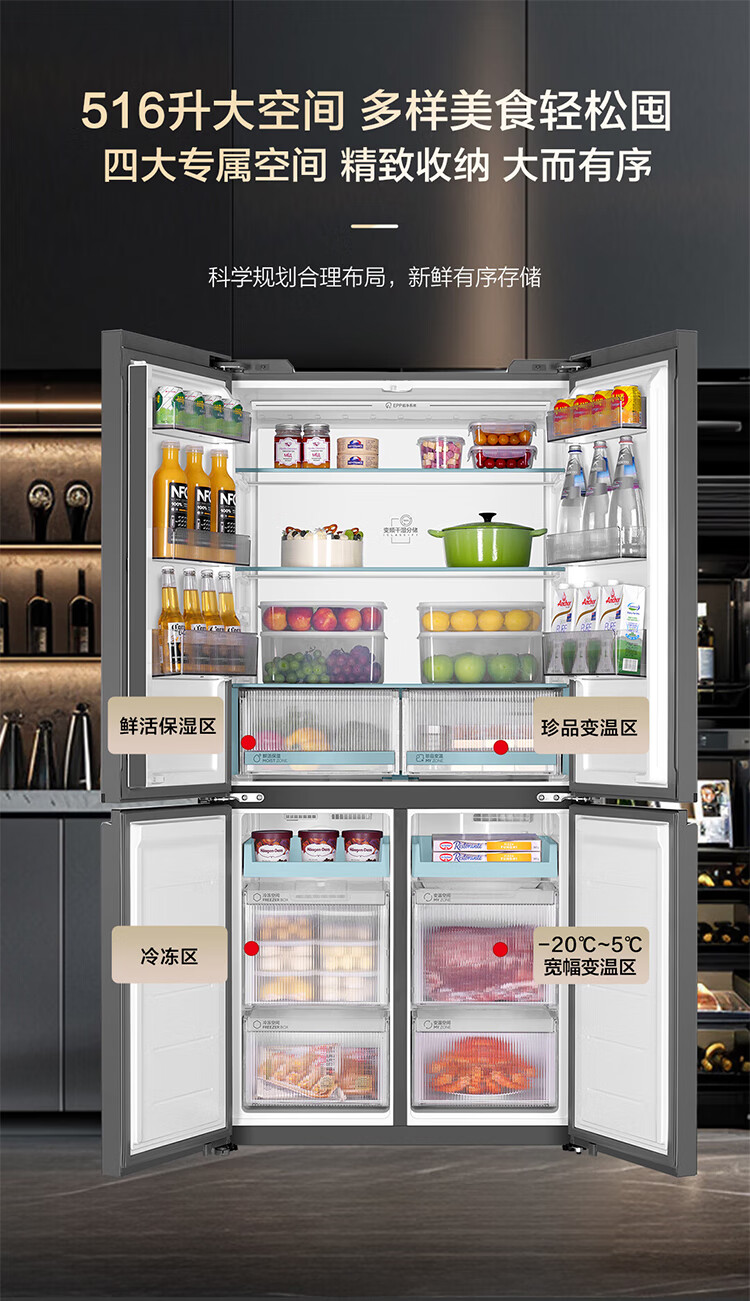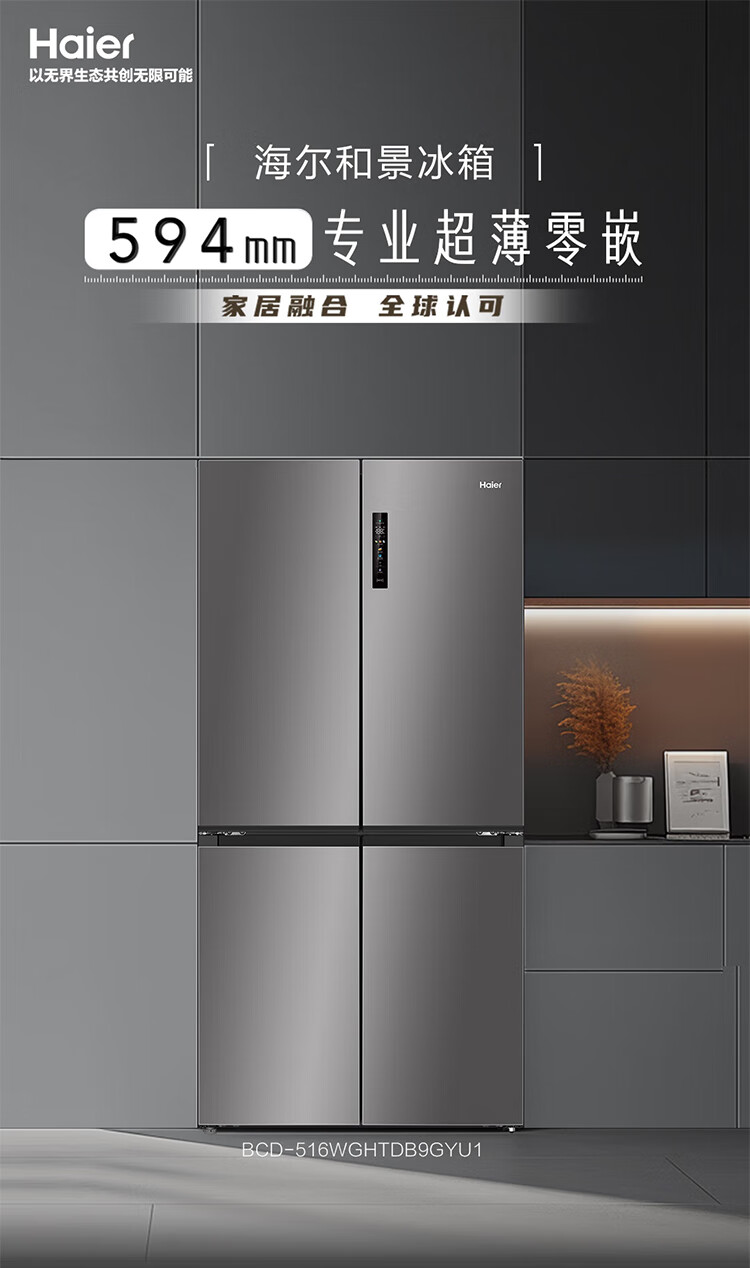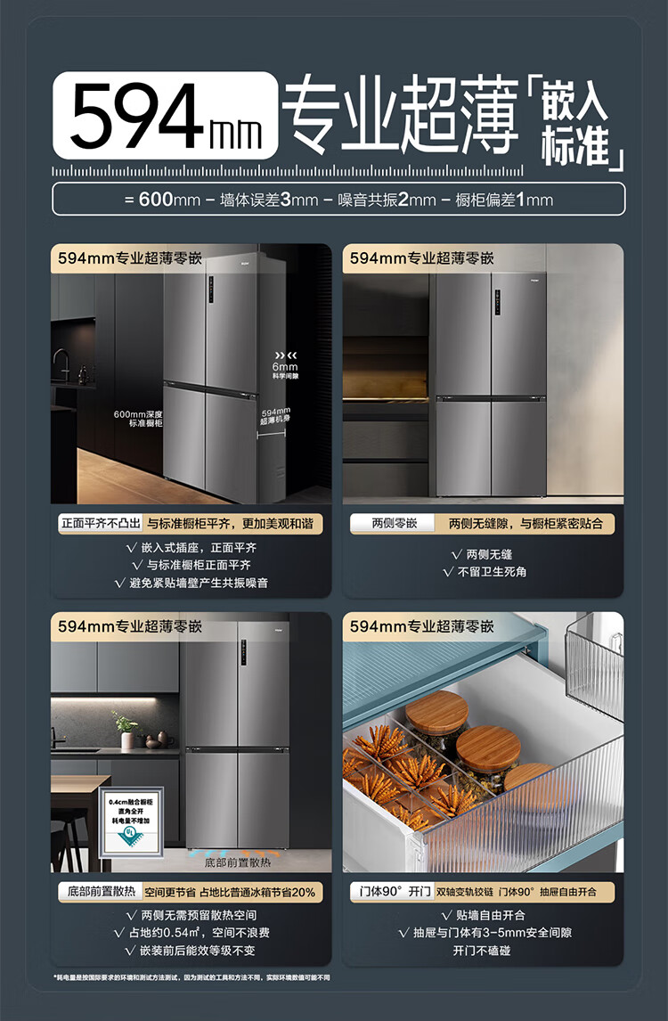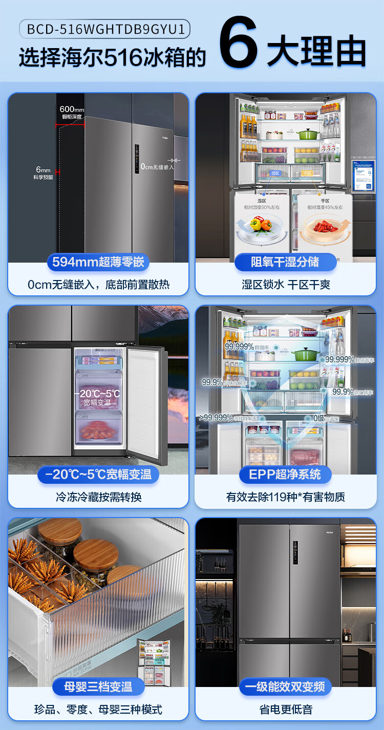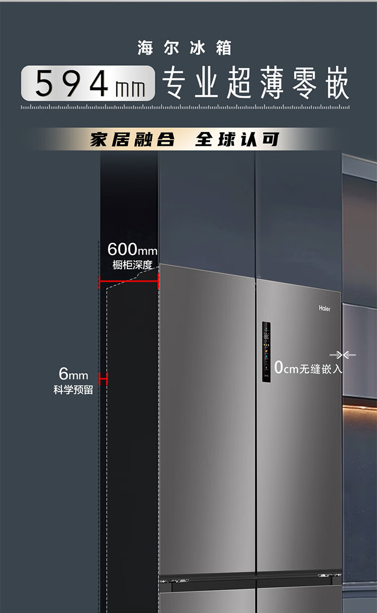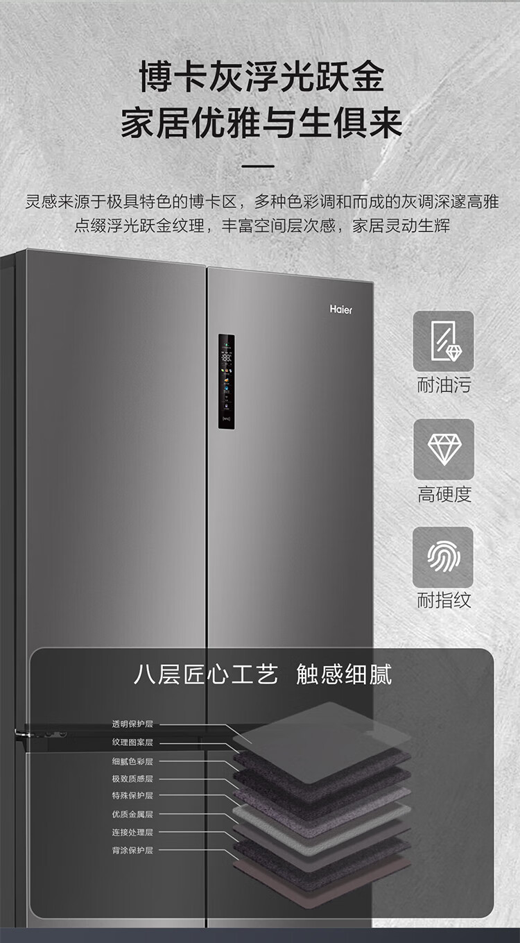 海尔(Haier)冰箱516升十字对开门T型四开门超薄零嵌入式一级能效干湿分储除菌家用大容量电冰箱国家补贴20% 博卡灰+594mm专业超薄零嵌+母婴三档变温