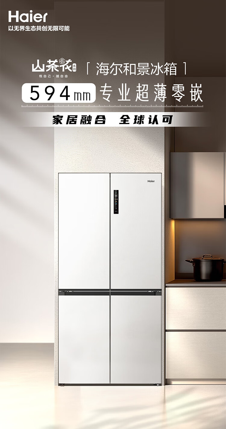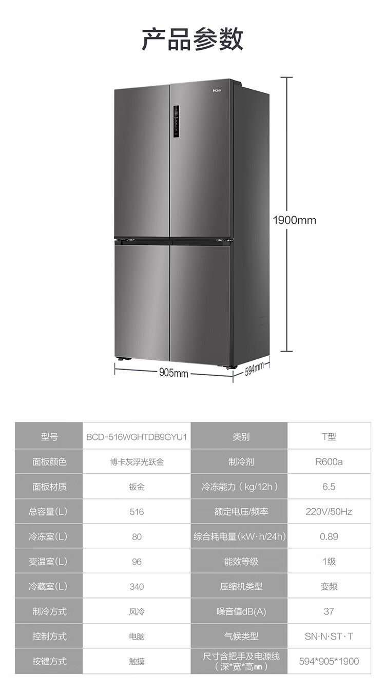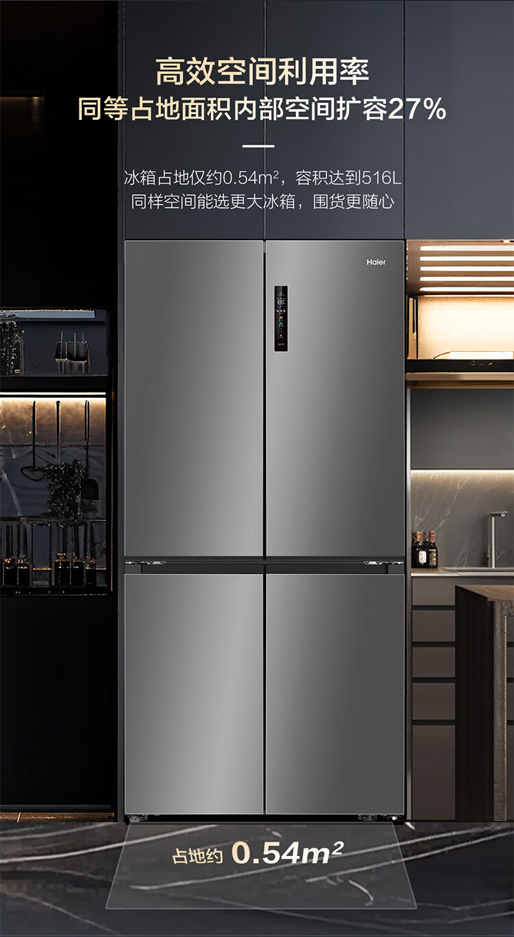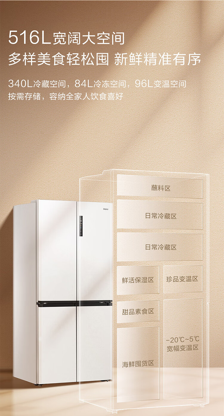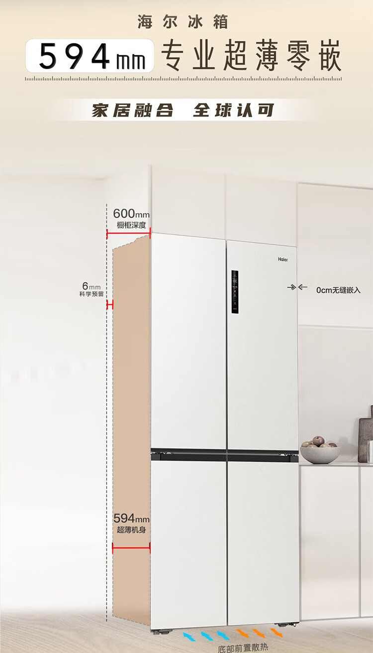 海尔(Haier)冰箱516升十字对开门T型四开门超薄零嵌入式一级能效干湿分储除菌家用大容量电冰箱国家补贴20% 博卡灰+594mm专业超薄零嵌+母婴三档变温