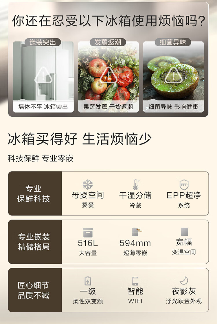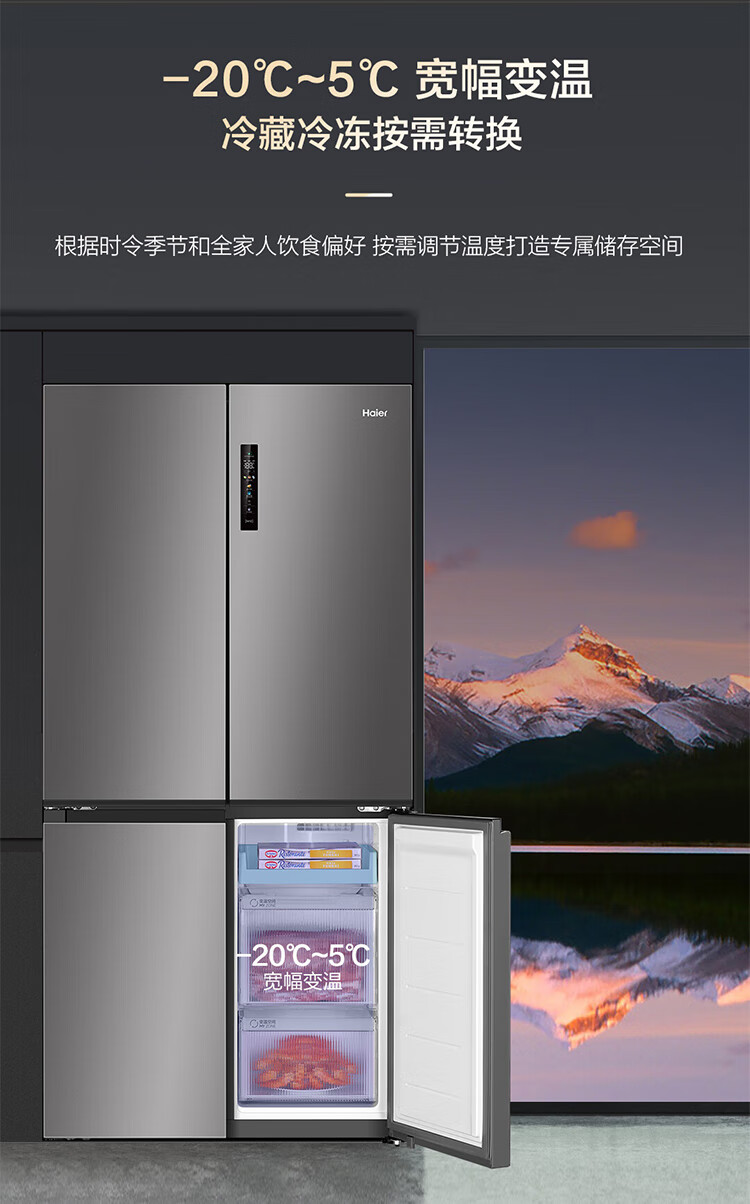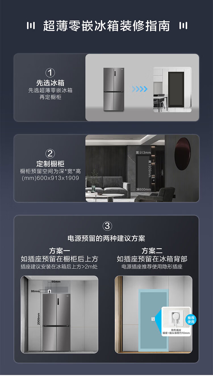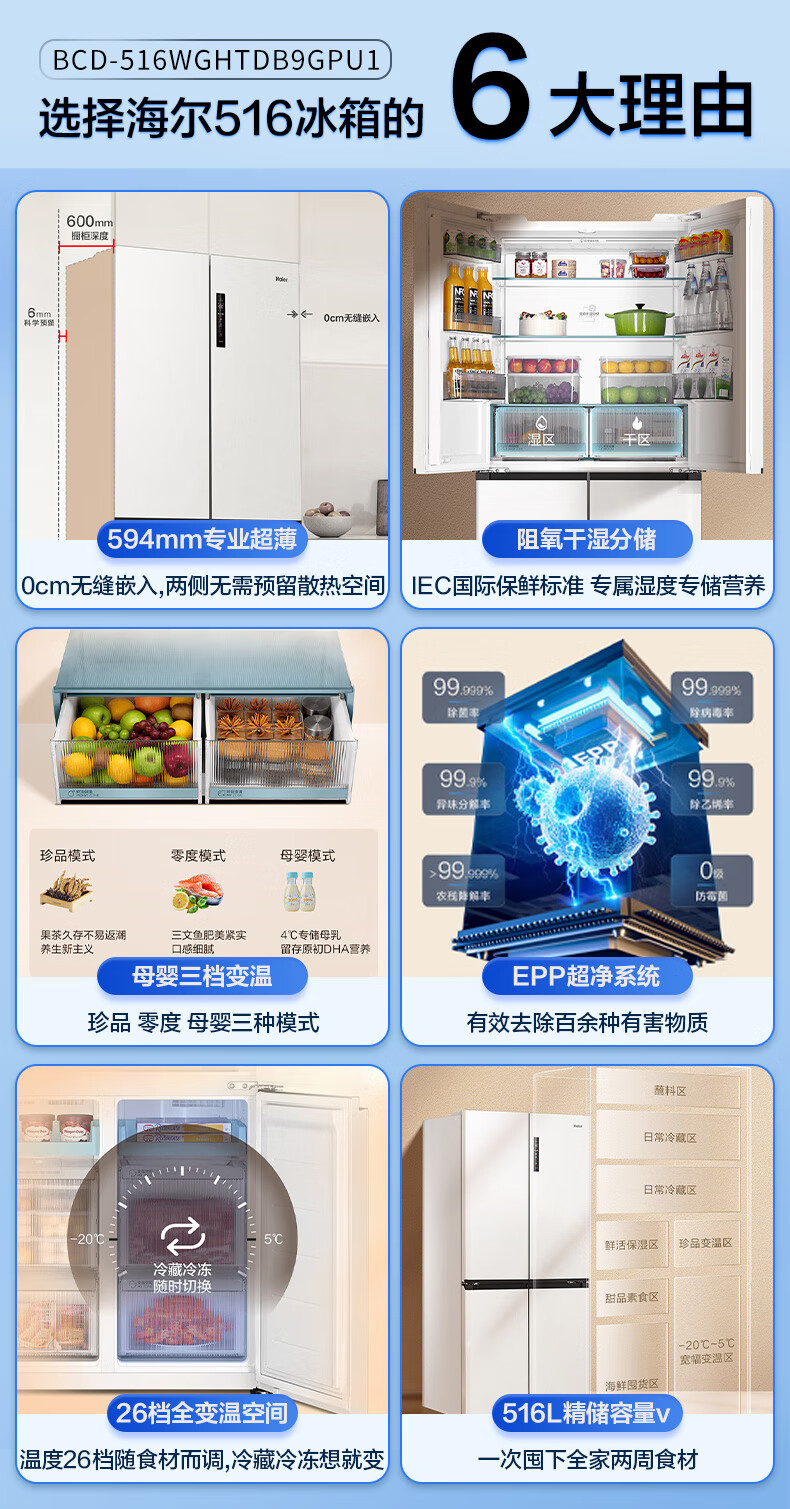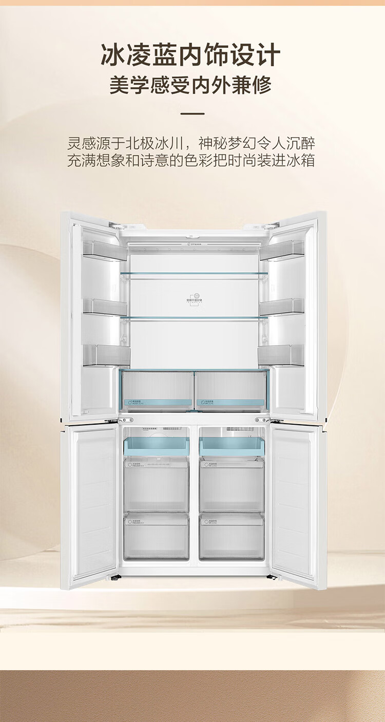 海尔(Haier)冰箱516升十字对开门T型四开门超薄零嵌入式一级能效干湿分储除菌家用大容量电冰箱国家补贴20% 博卡灰+594mm专业超薄零嵌+母婴三档变温
