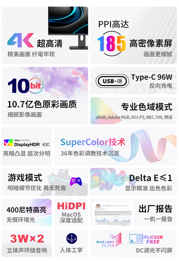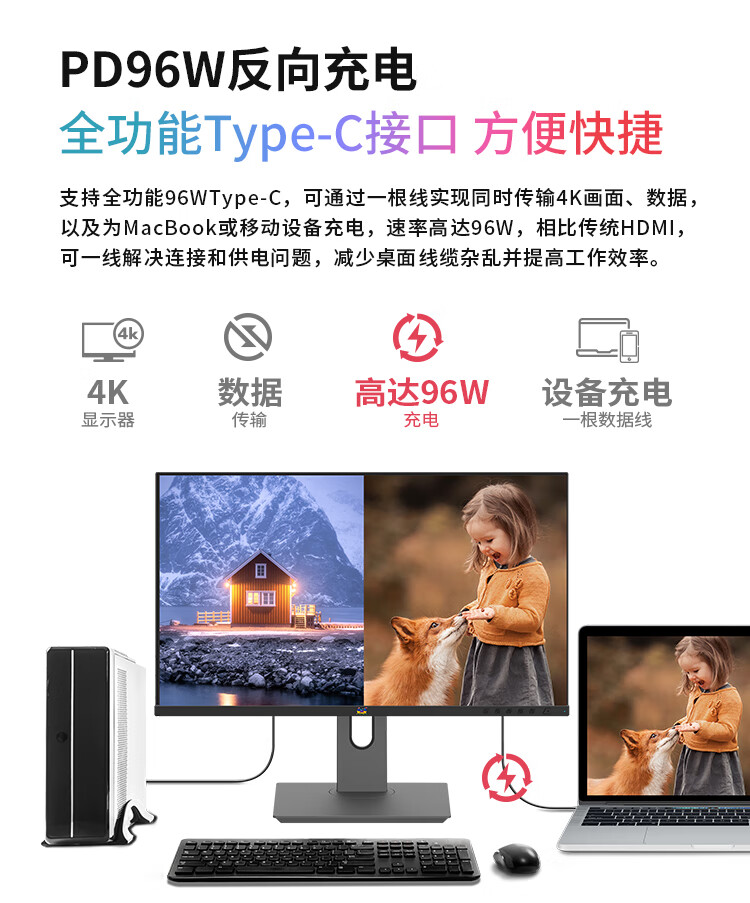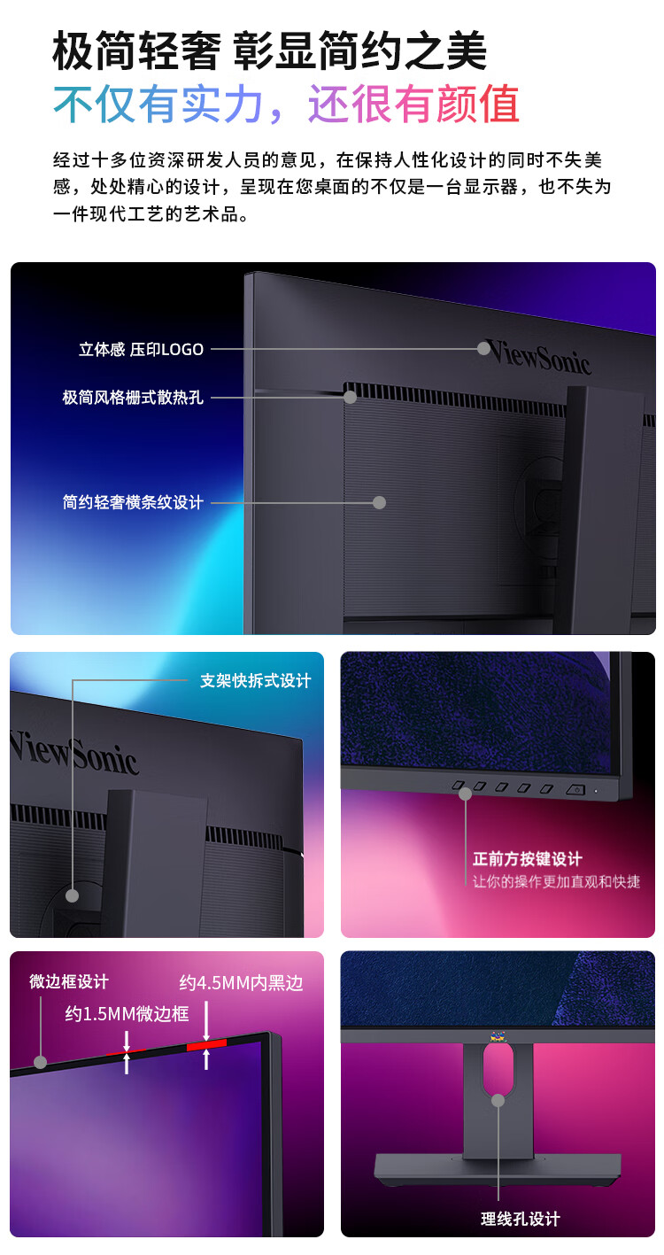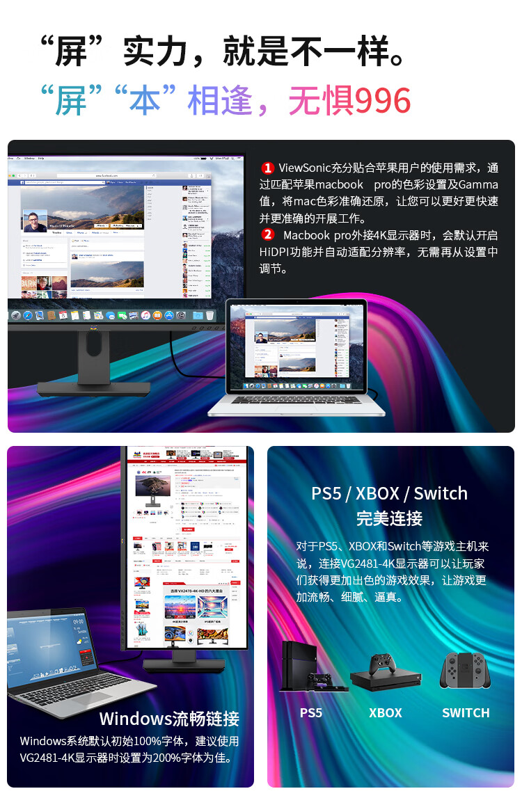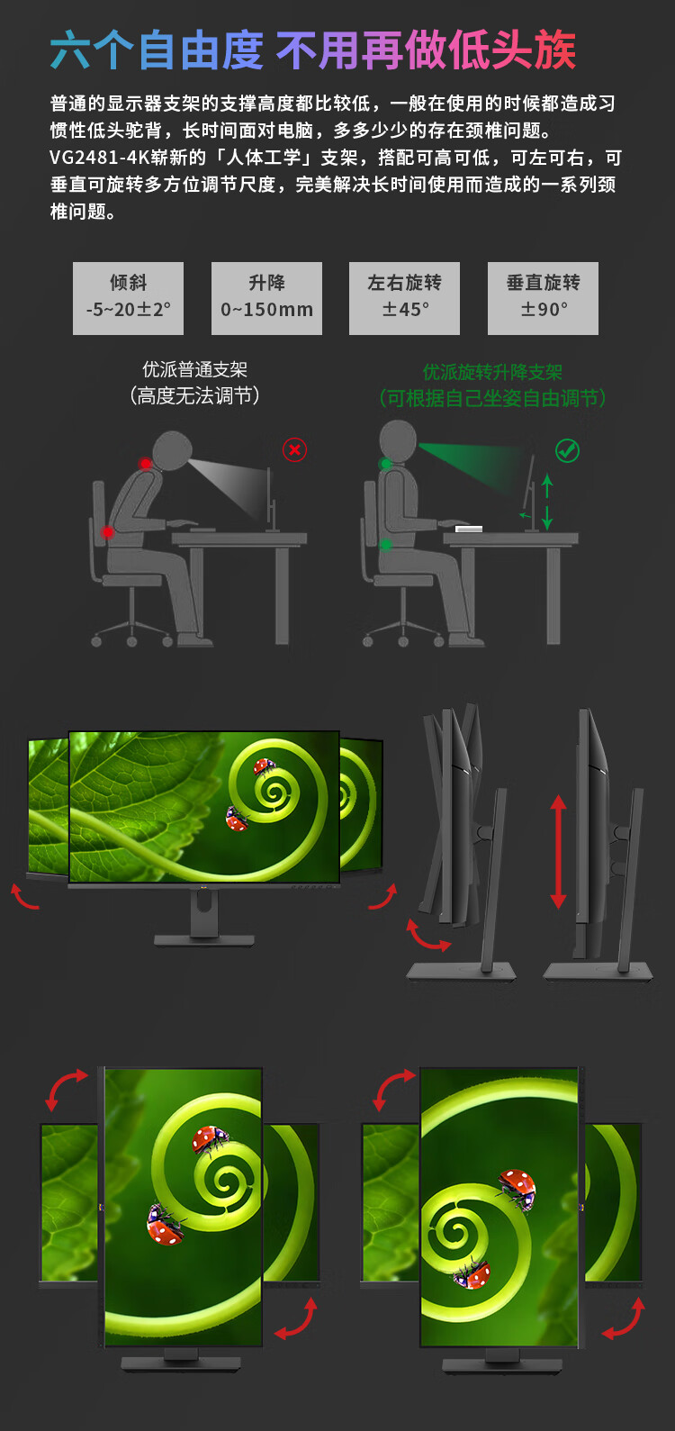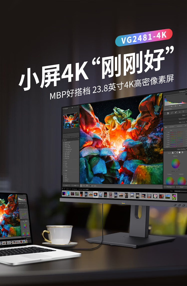 优派 23.8英寸 4K超清IPS显示器 HDR400 TypeC96W 10bit 旋转升降 微边广色域专业设计显示屏VG2481-4K