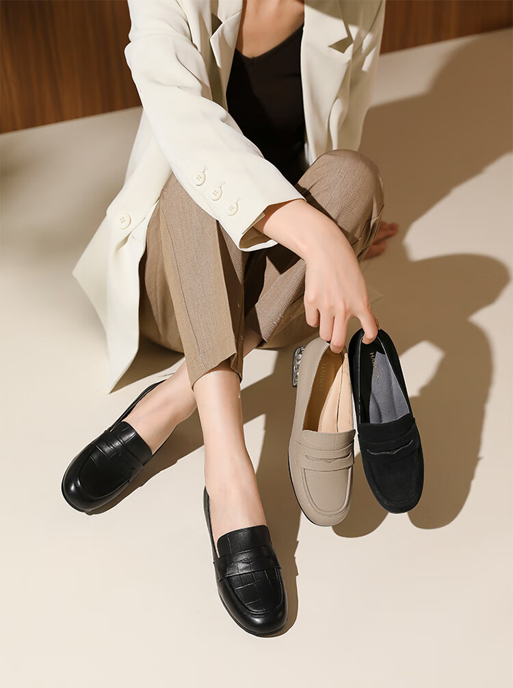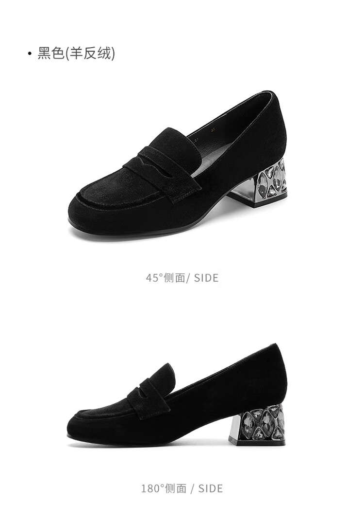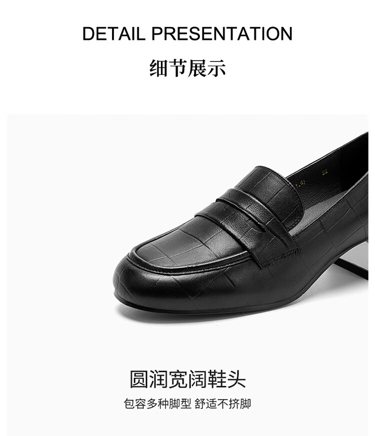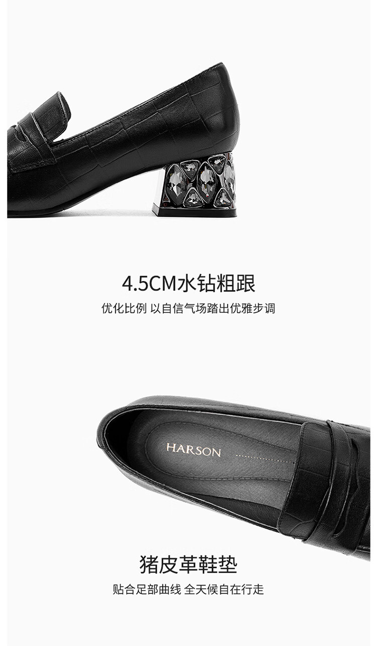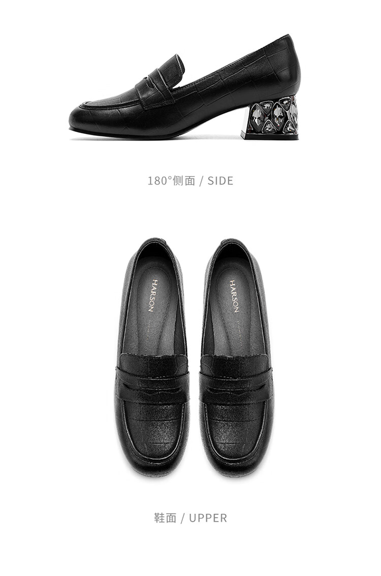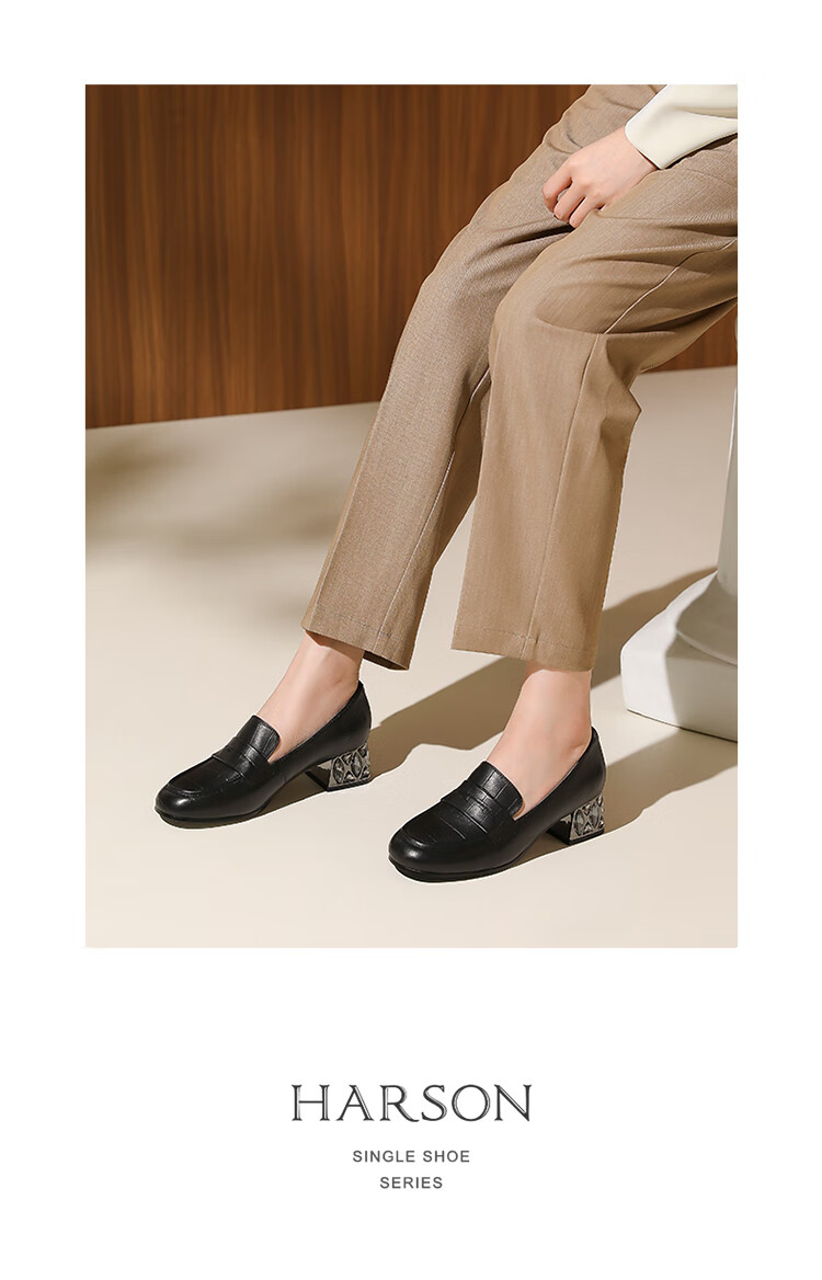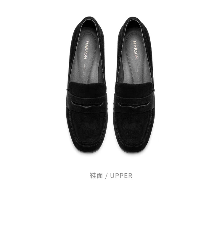 哈森(Harson)2025新款秋季休闲粗跟圆头乐福鞋商务通勤压花单鞋HL259019 黑色 羊反绒 36