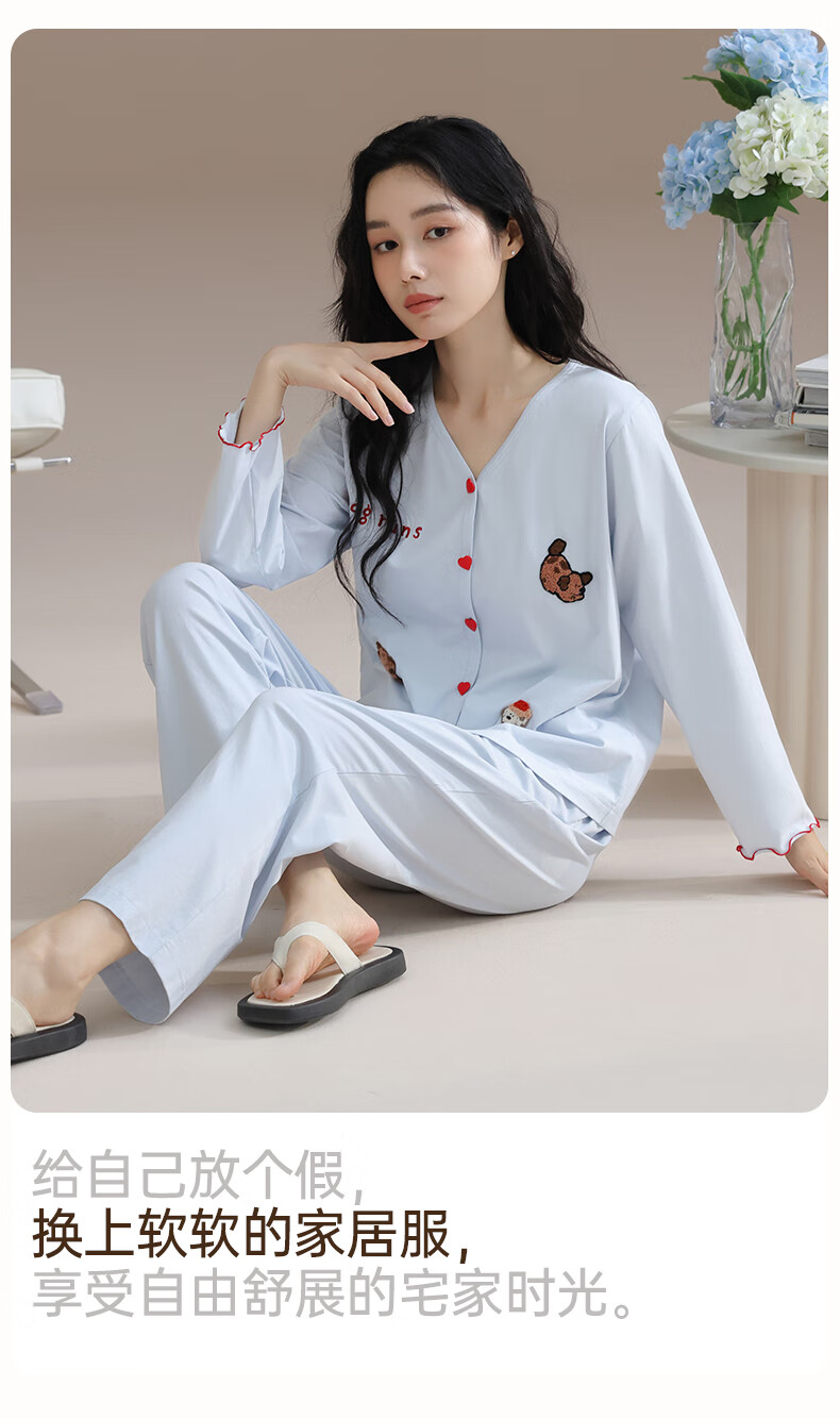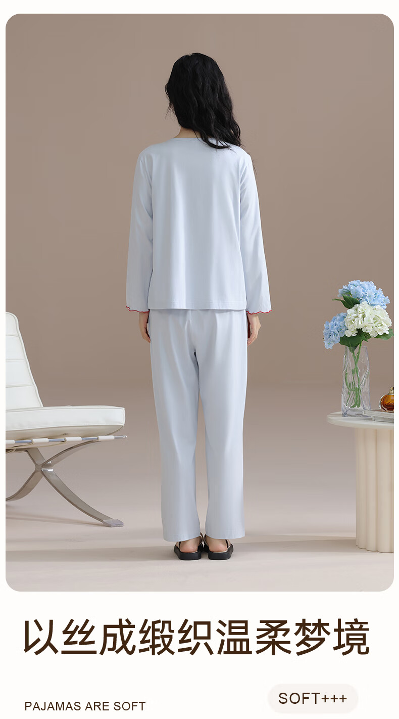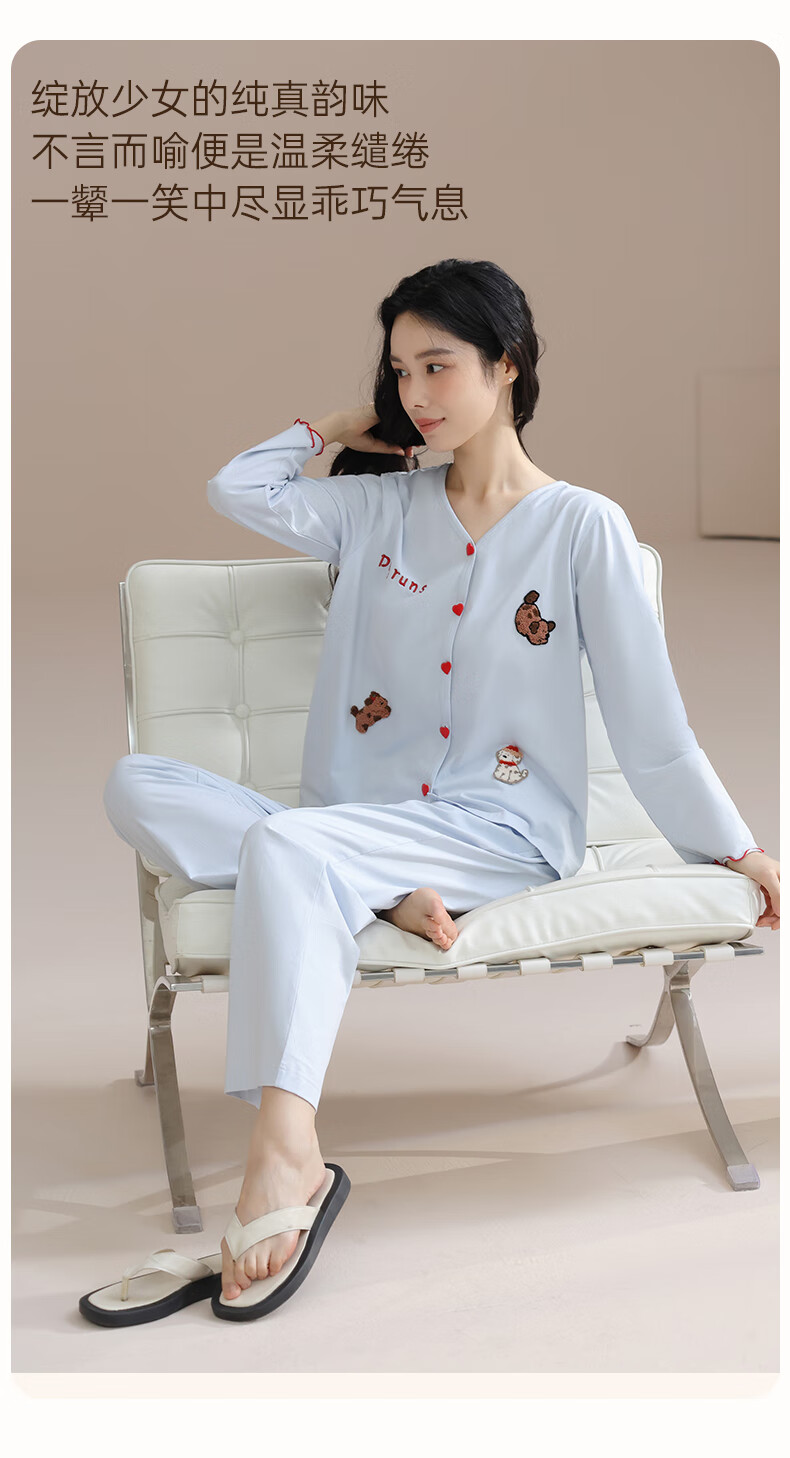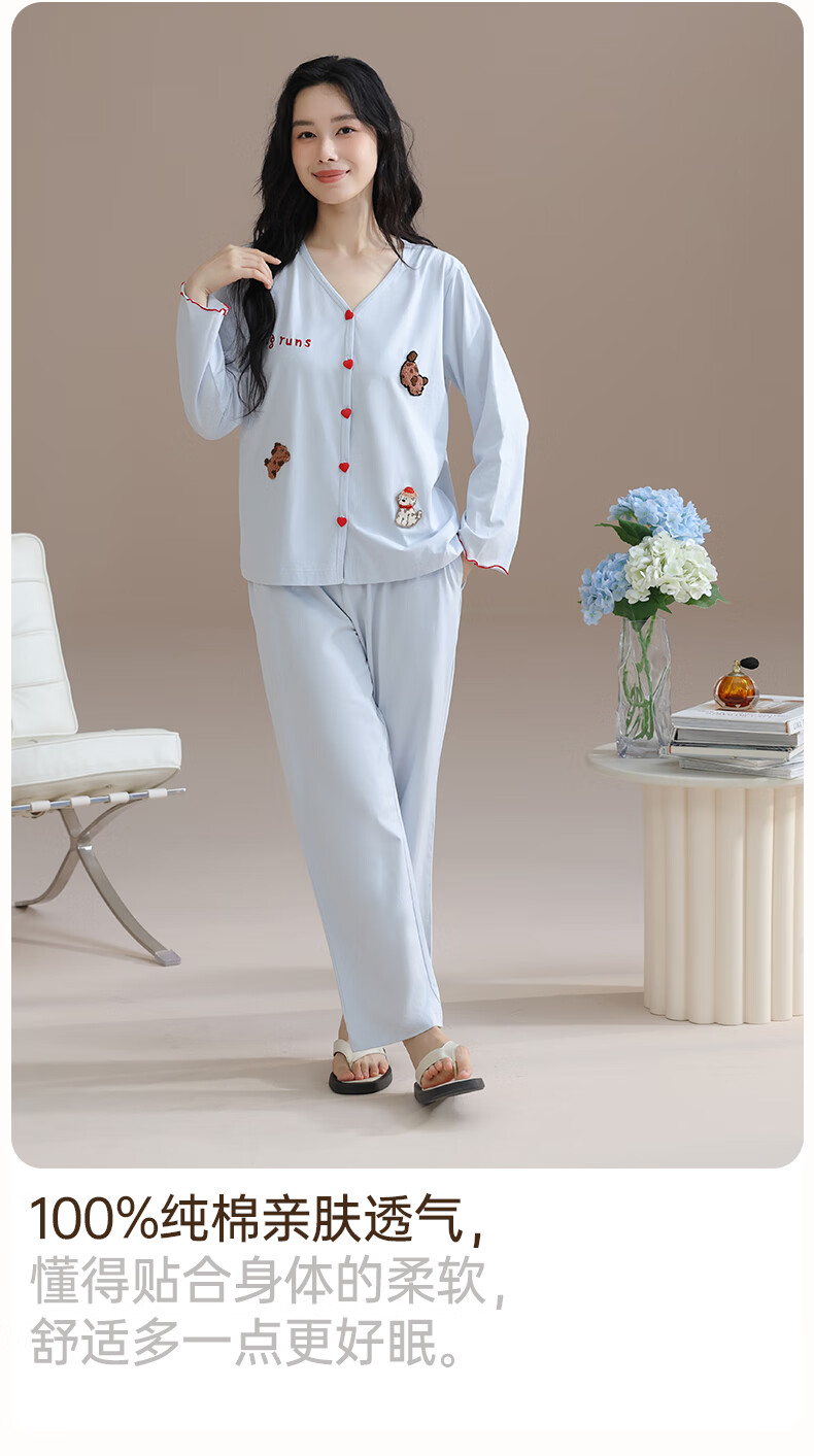 玛伦萨100%纯棉睡衣女春秋季2025新款可外穿长袖长裤大码女士家居服套装 浅兰 M