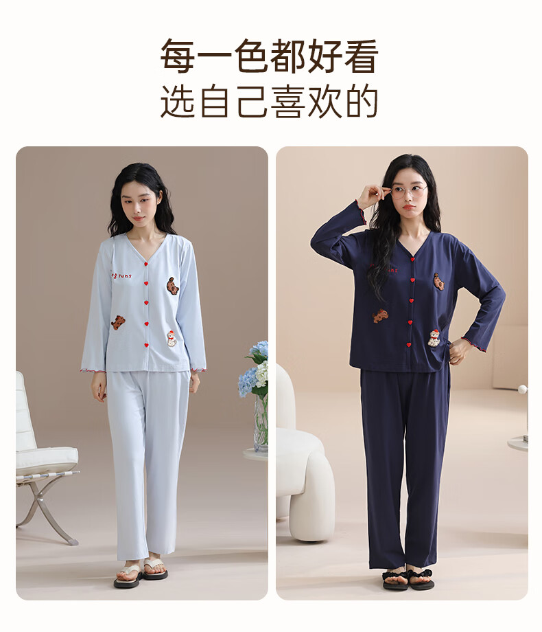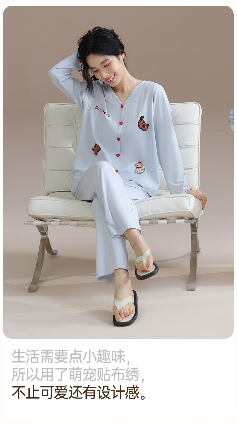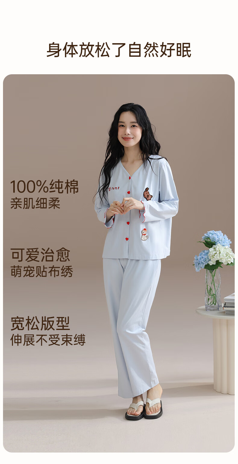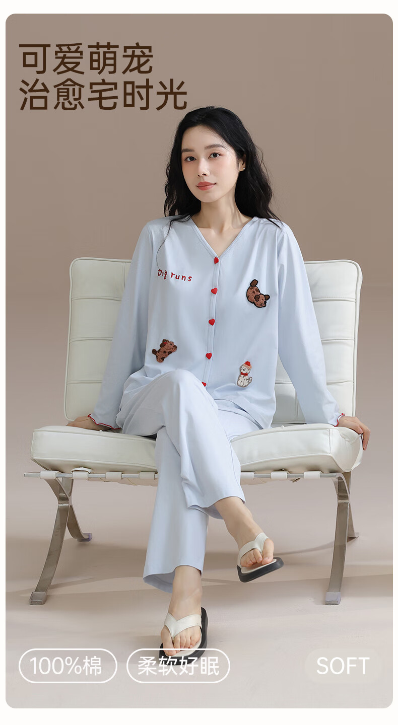 玛伦萨100%纯棉睡衣女春秋季2025新款可外穿长袖长裤大码女士家居服套装 浅兰 M