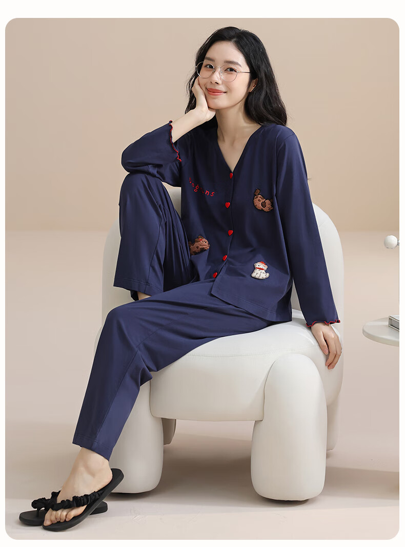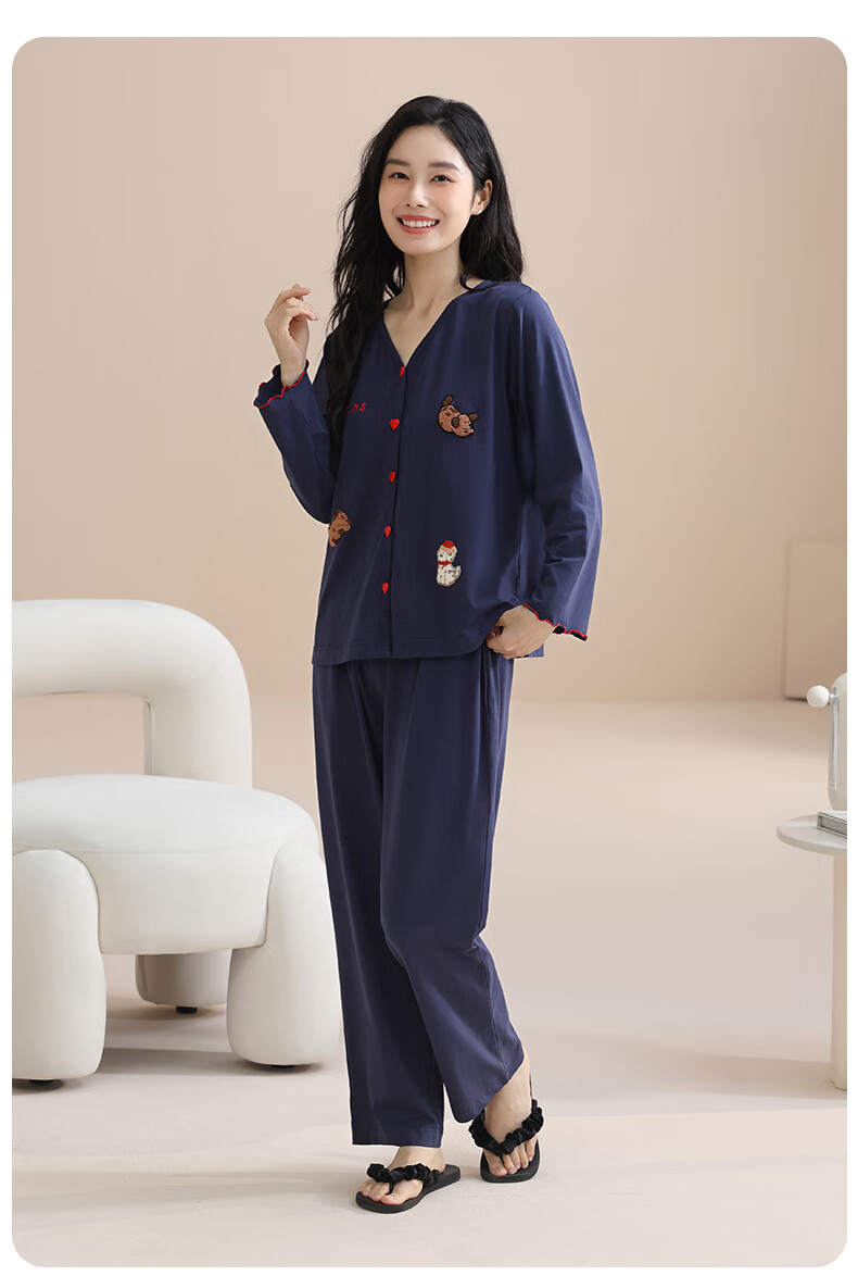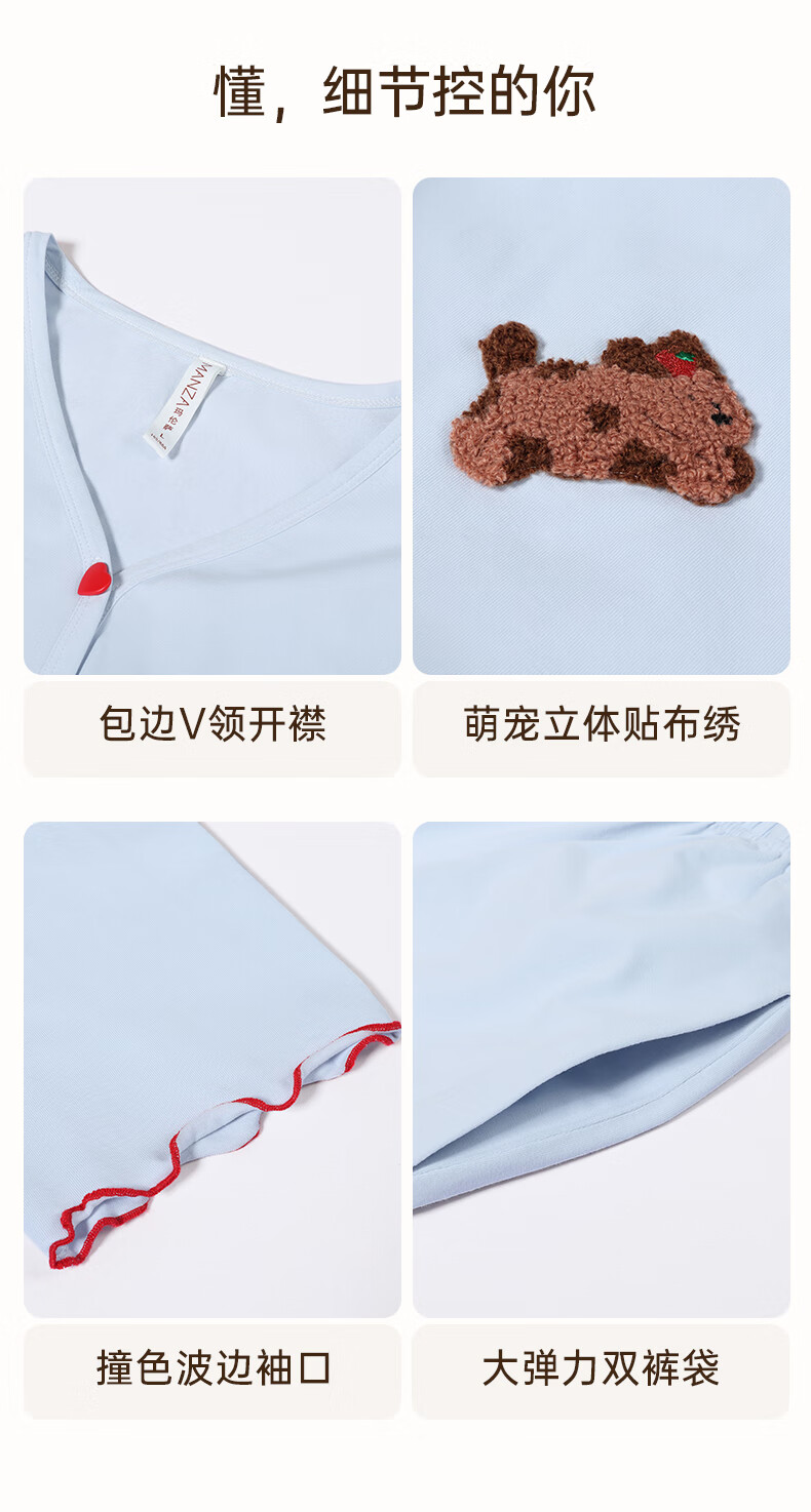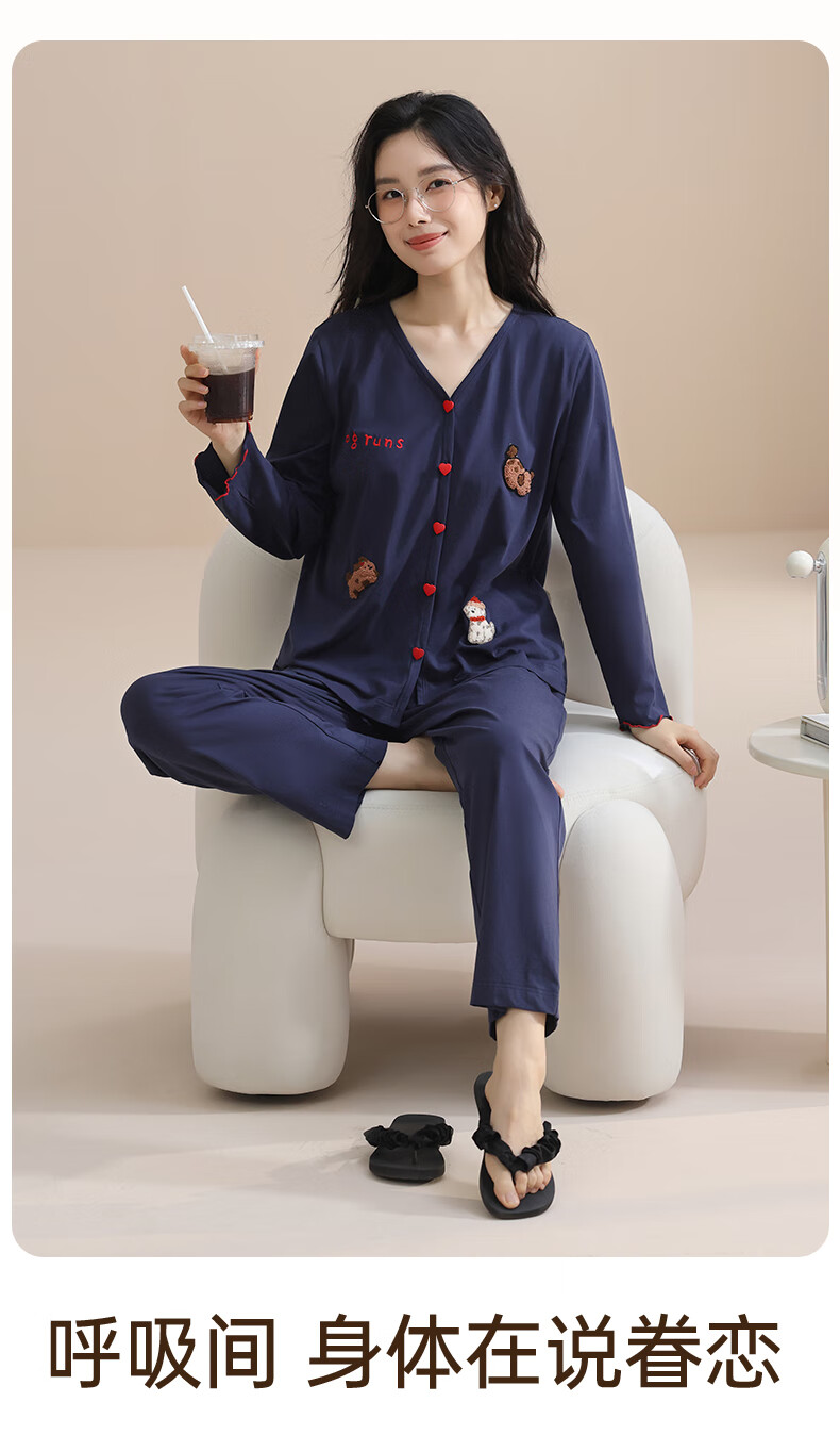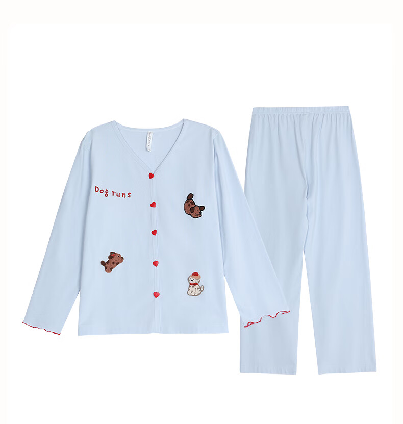 玛伦萨100%纯棉睡衣女春秋季2025新款可外穿长袖长裤大码女士家居服套装 浅兰 M