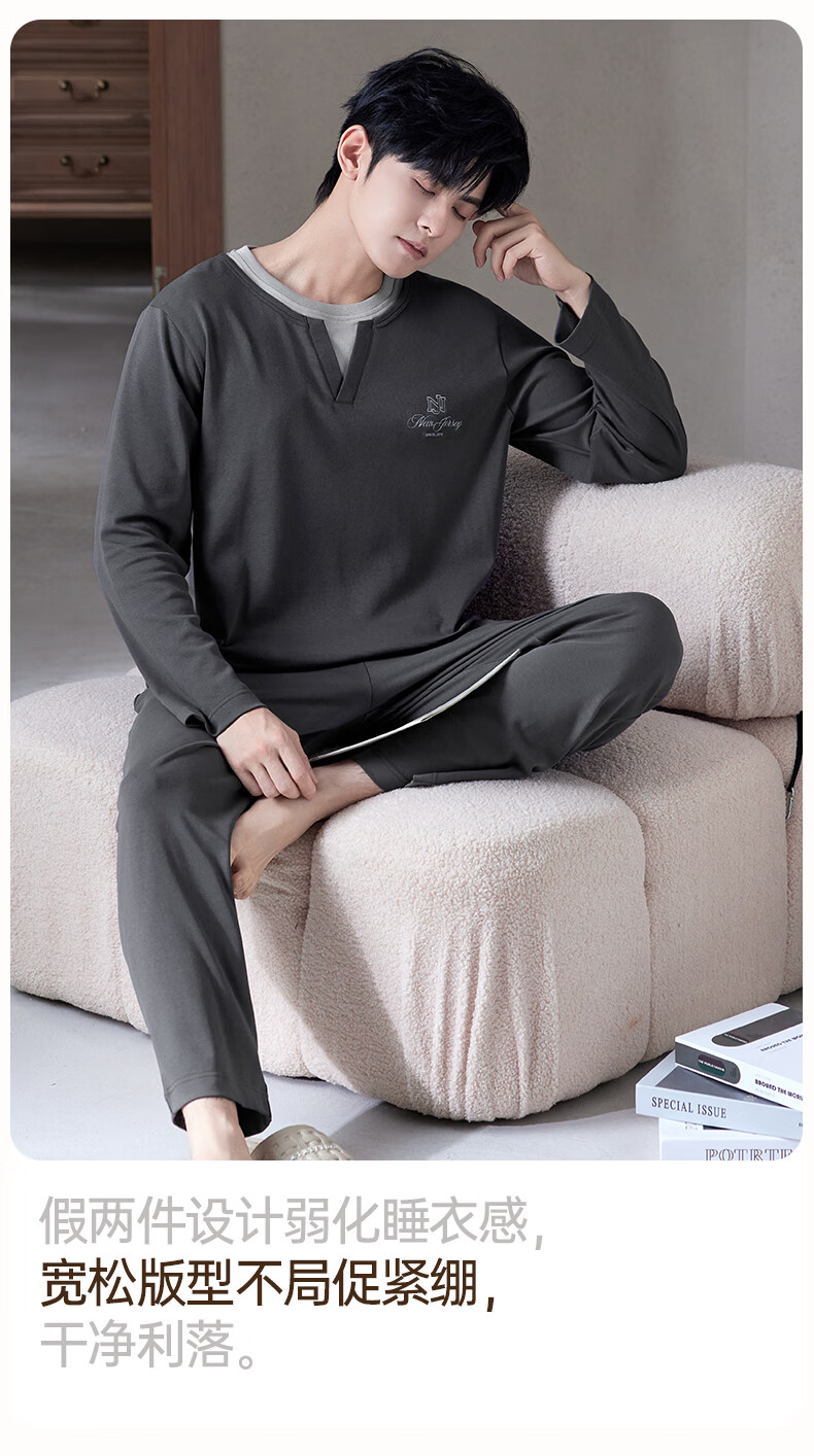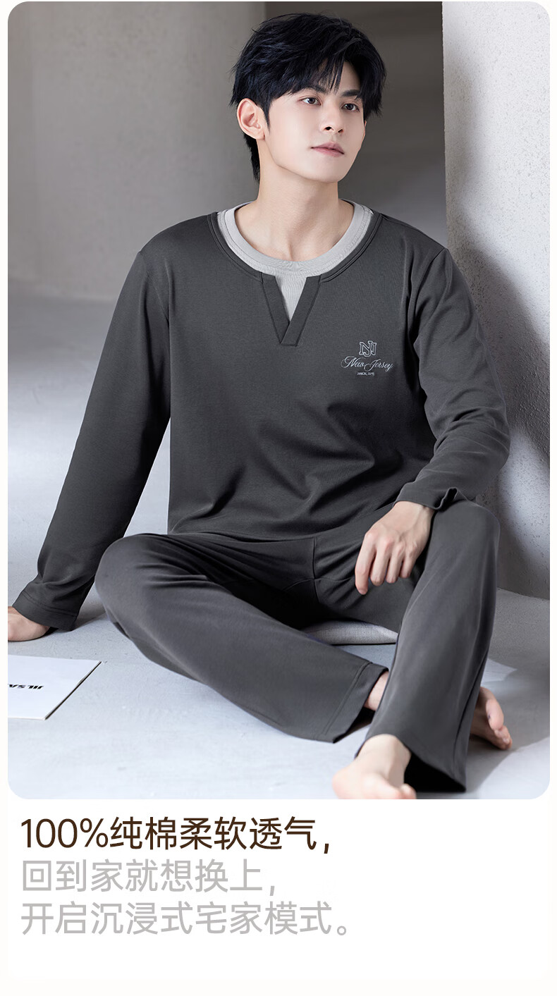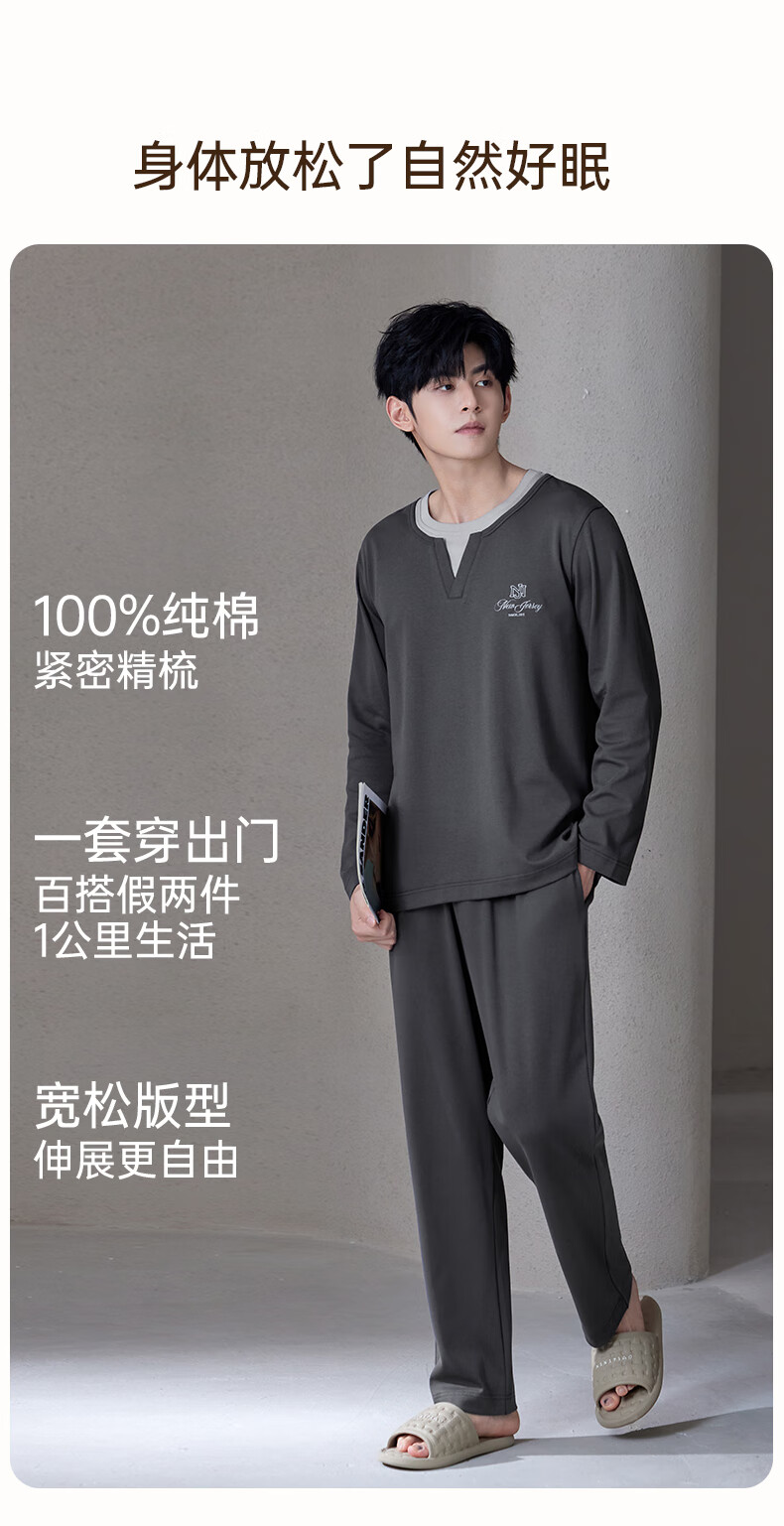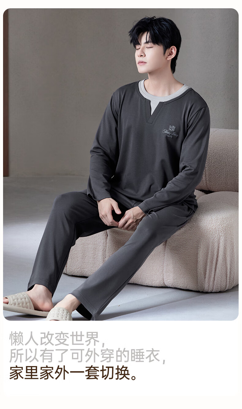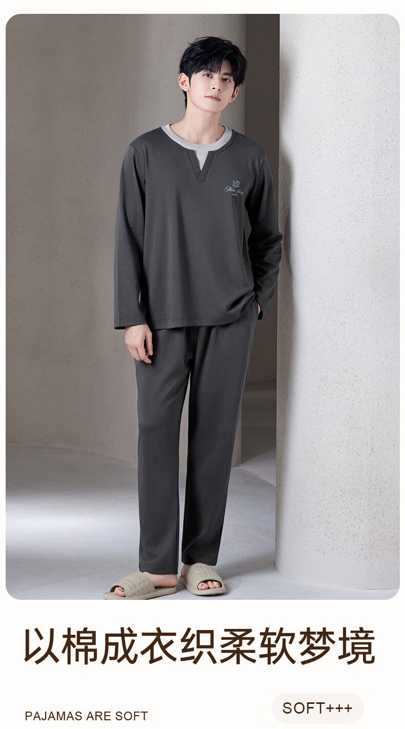 玛伦萨100%纯棉睡衣男春秋季2025新款可外穿全棉长袖长裤男士家居服套装 灰色 L