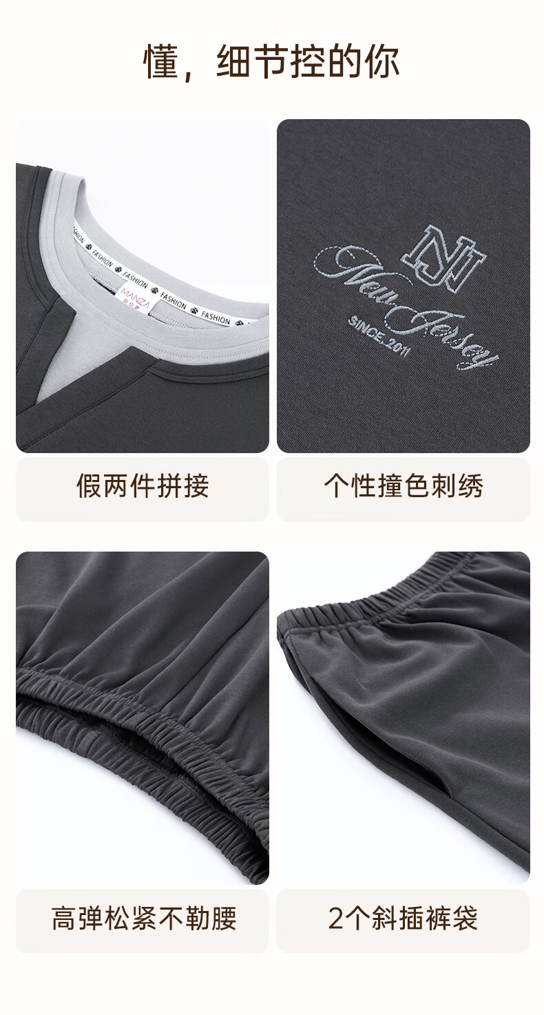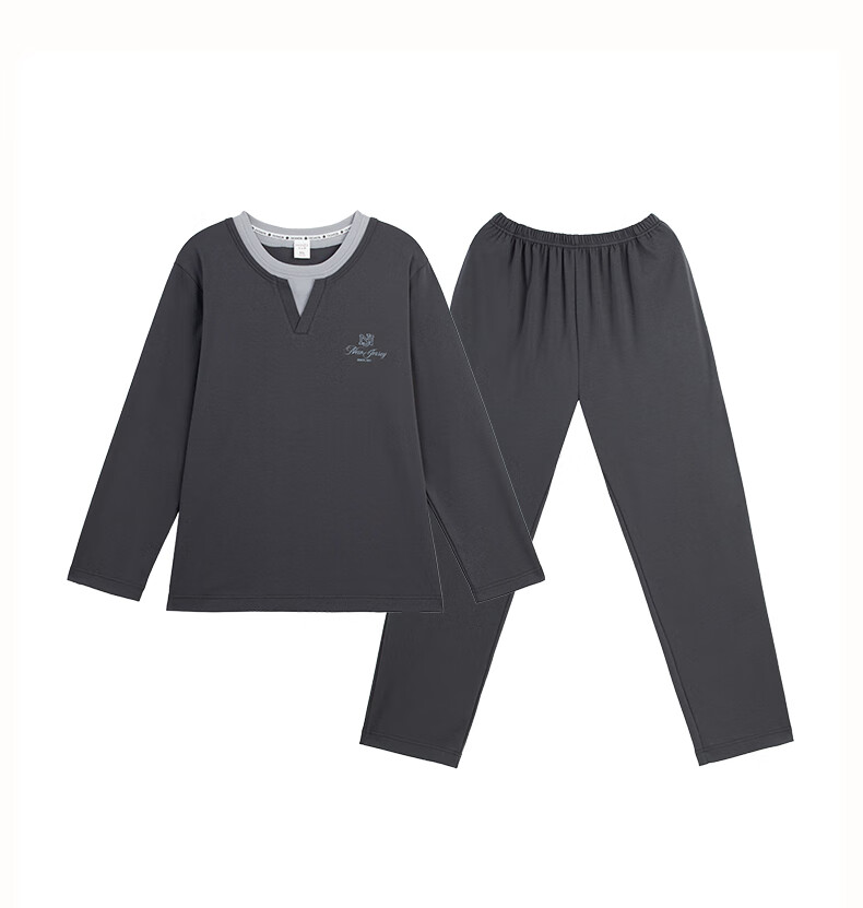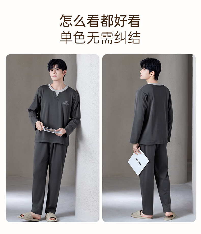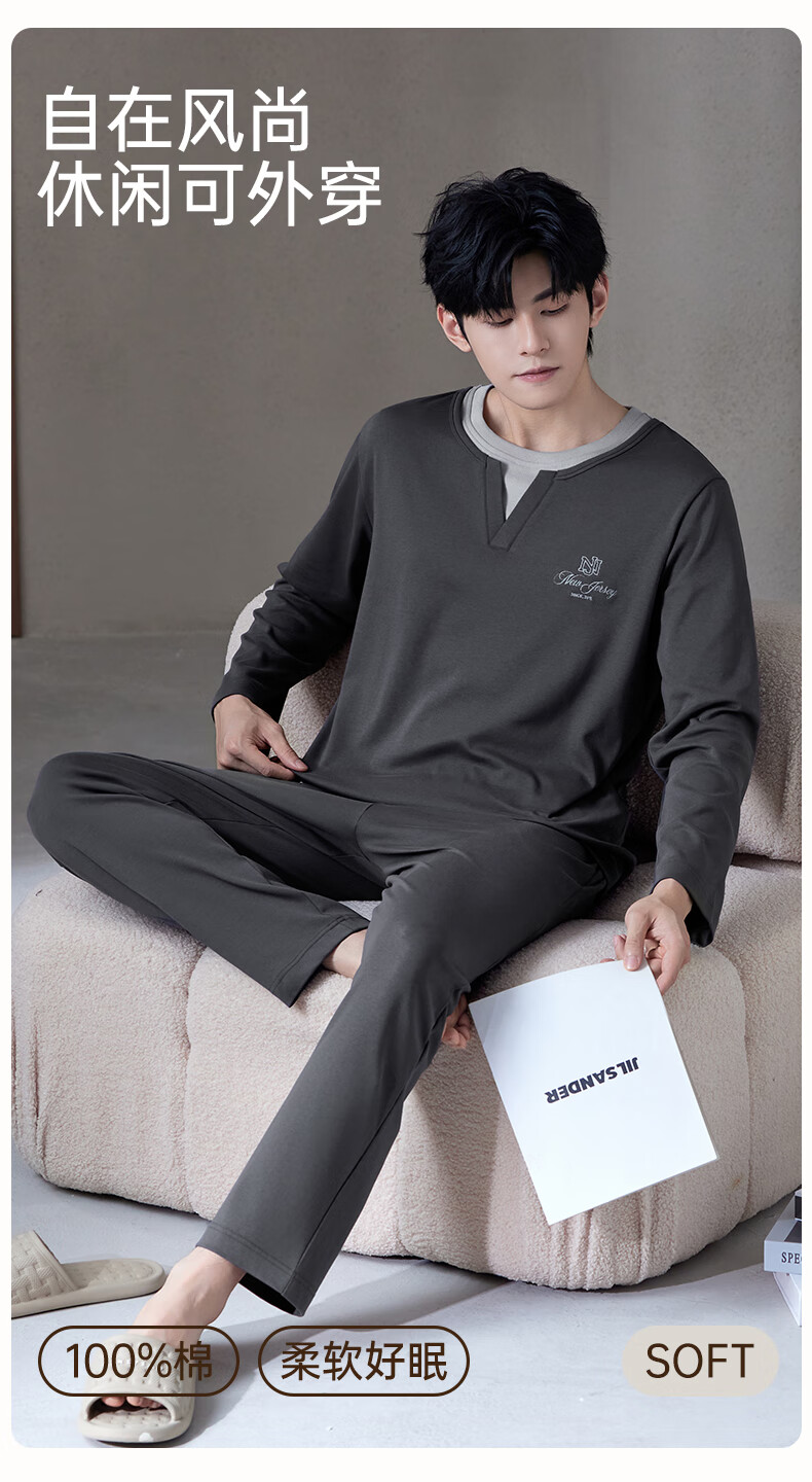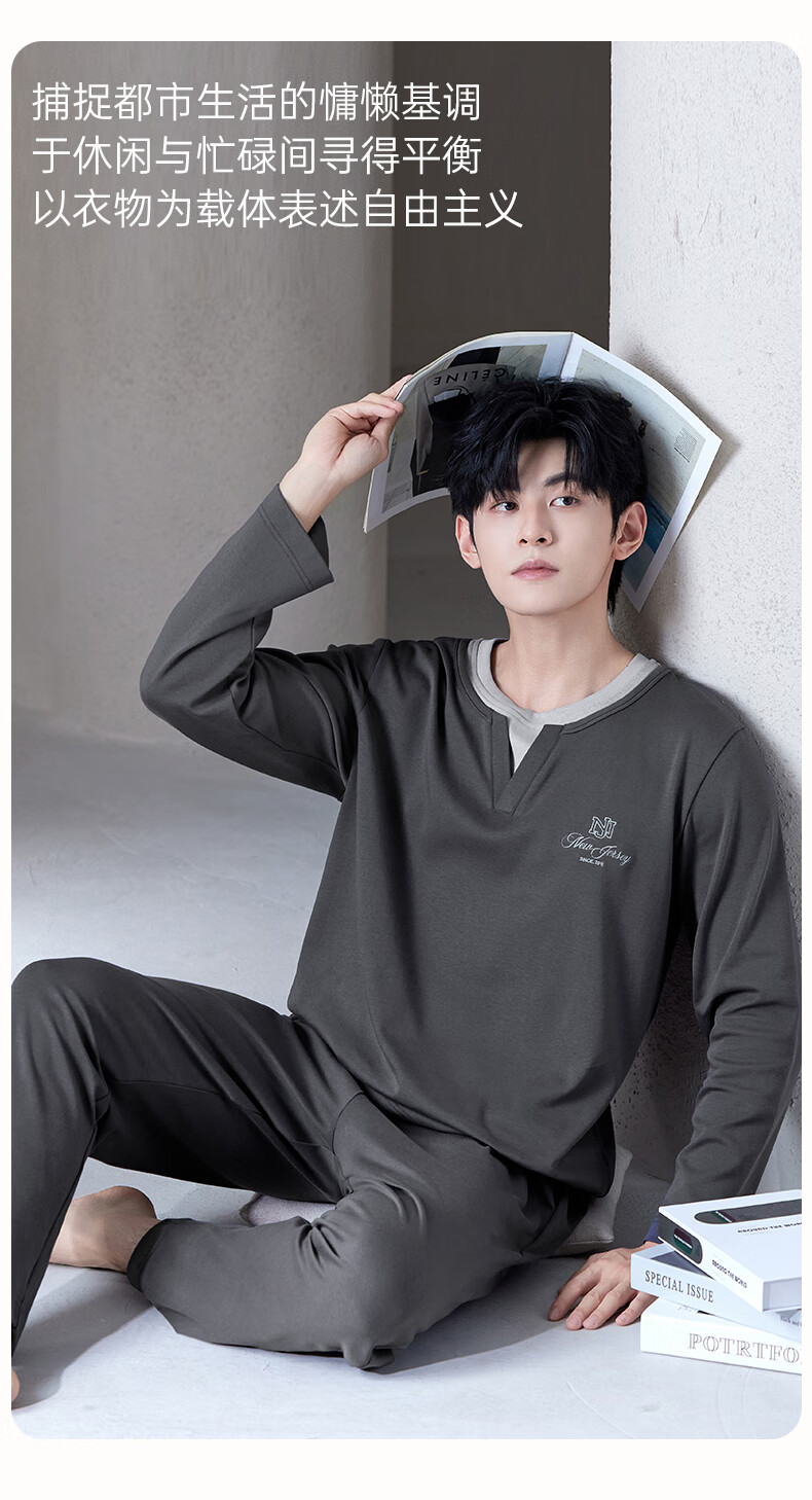玛伦萨100%纯棉睡衣男春秋季2025新款可外穿全棉长袖长裤男士家居服套装 灰色 L