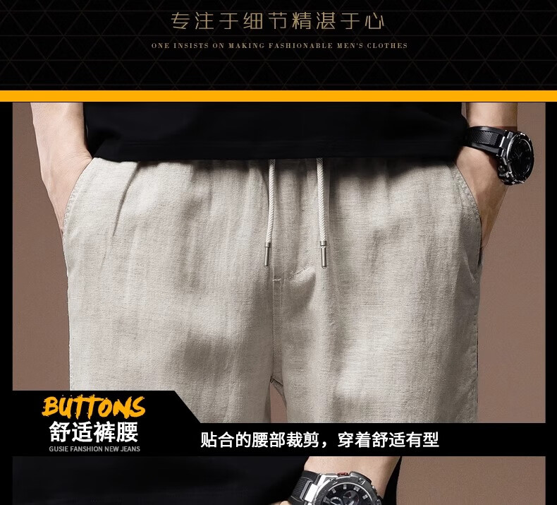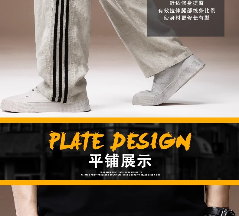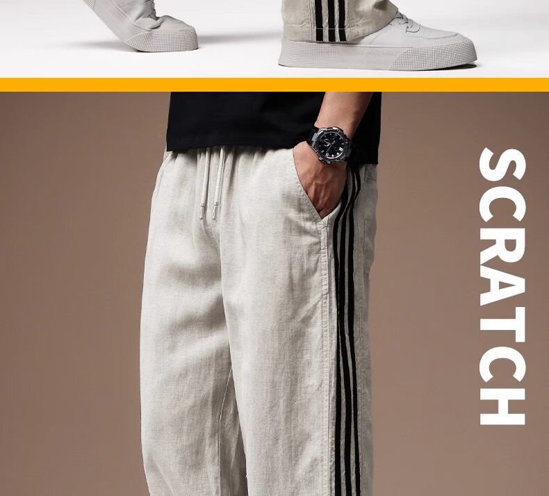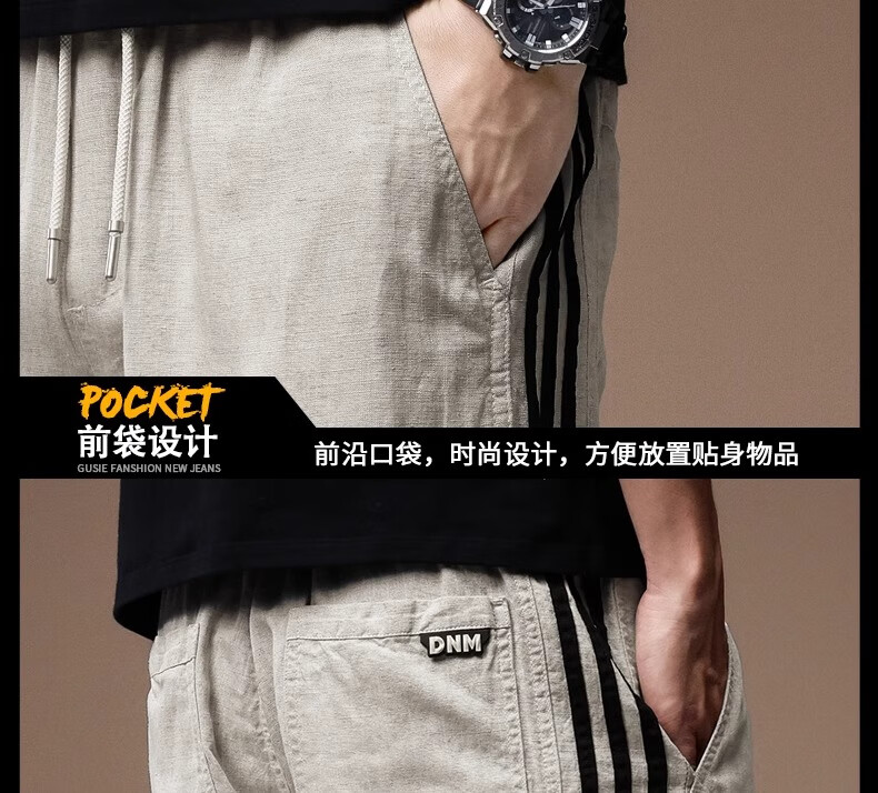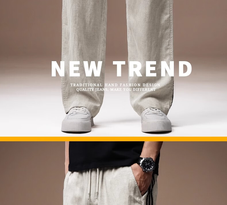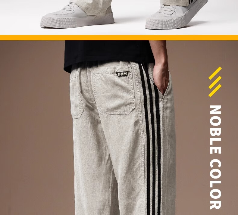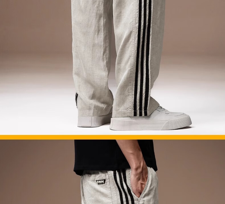 新百伦高端亚麻条纹休闲裤男秋季新款垂感男裤简约直筒长裤子男 杏色+运费险 2XL 【建议170-190斤】