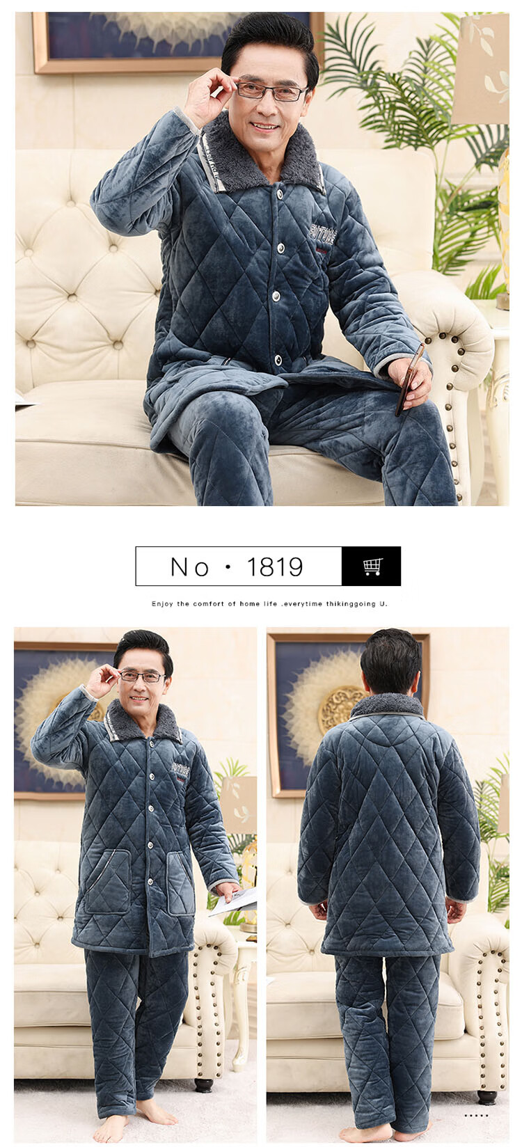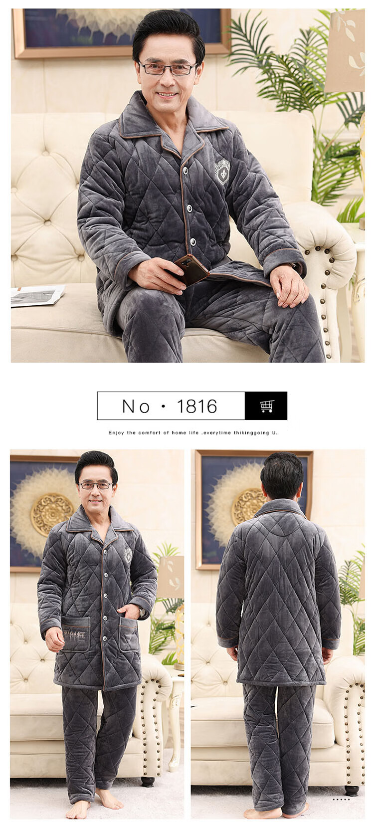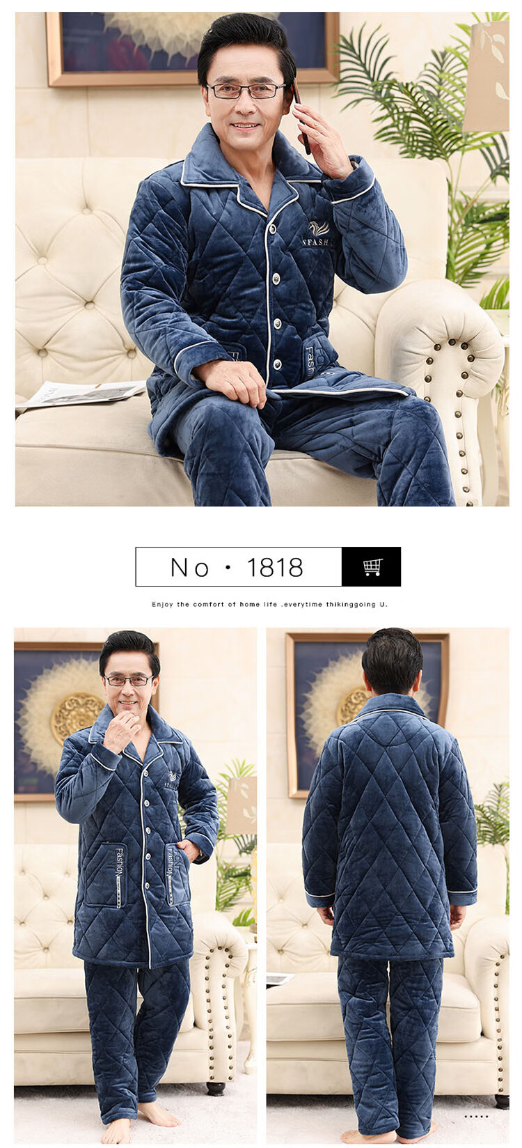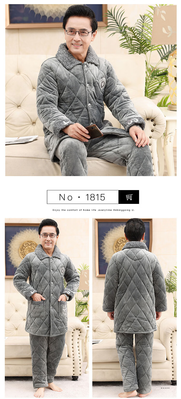 LangSha男士睡衣秋冬季珊瑚绒三层加厚夹棉中长款超厚爸爸保暖加绒家居服 1815 L