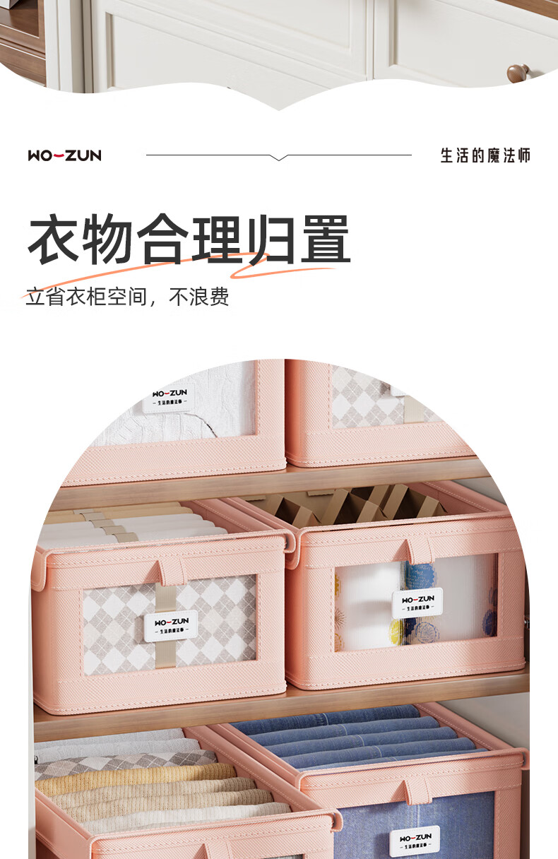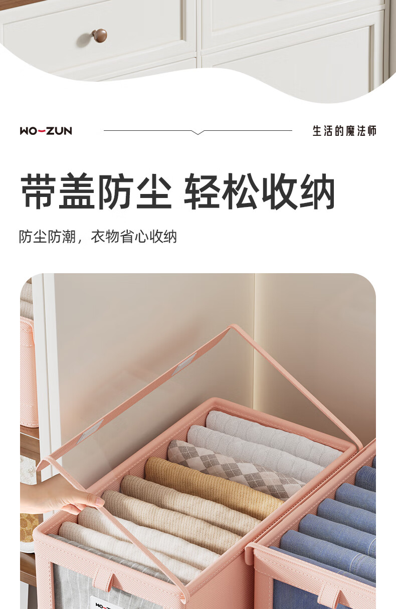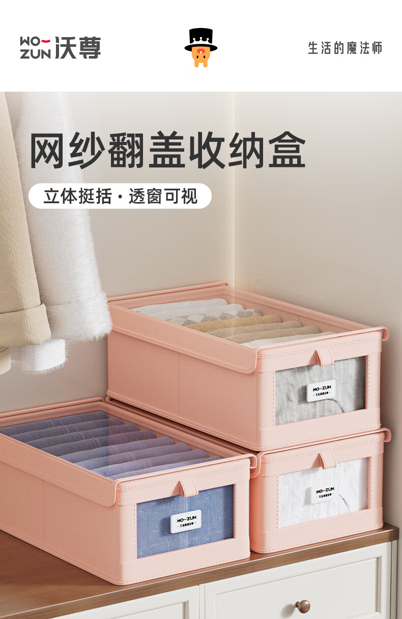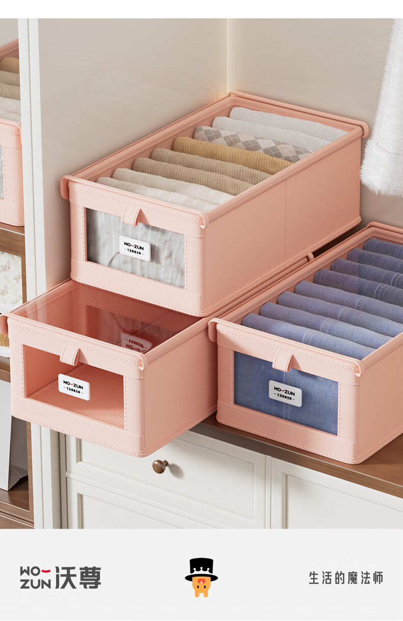 沃尊收纳盒衣柜大容量整理盒专用四件套裤子收纳神器透窗衣物收纳筐 粉色【中号】升级带盖款 1个装:25年新款 立省衣柜空间