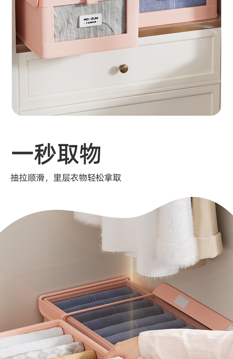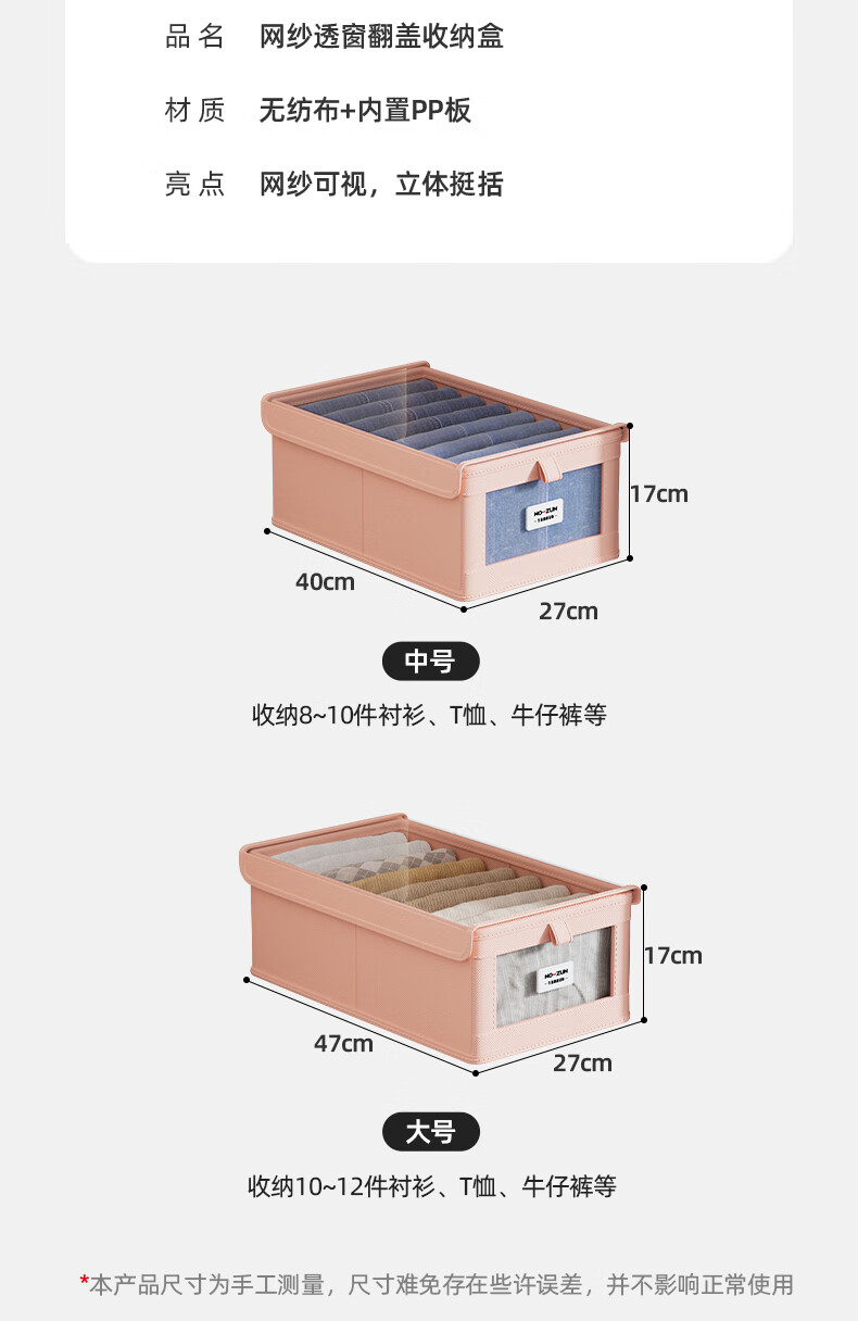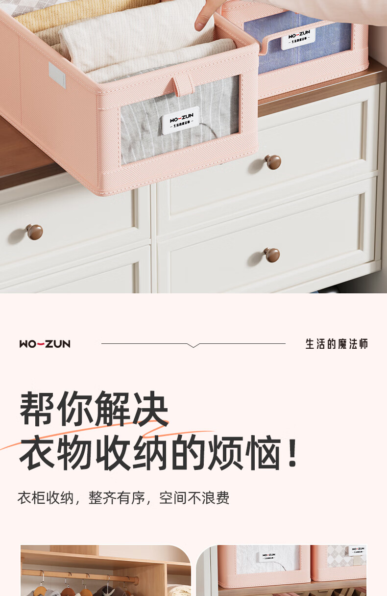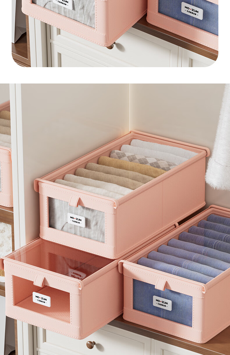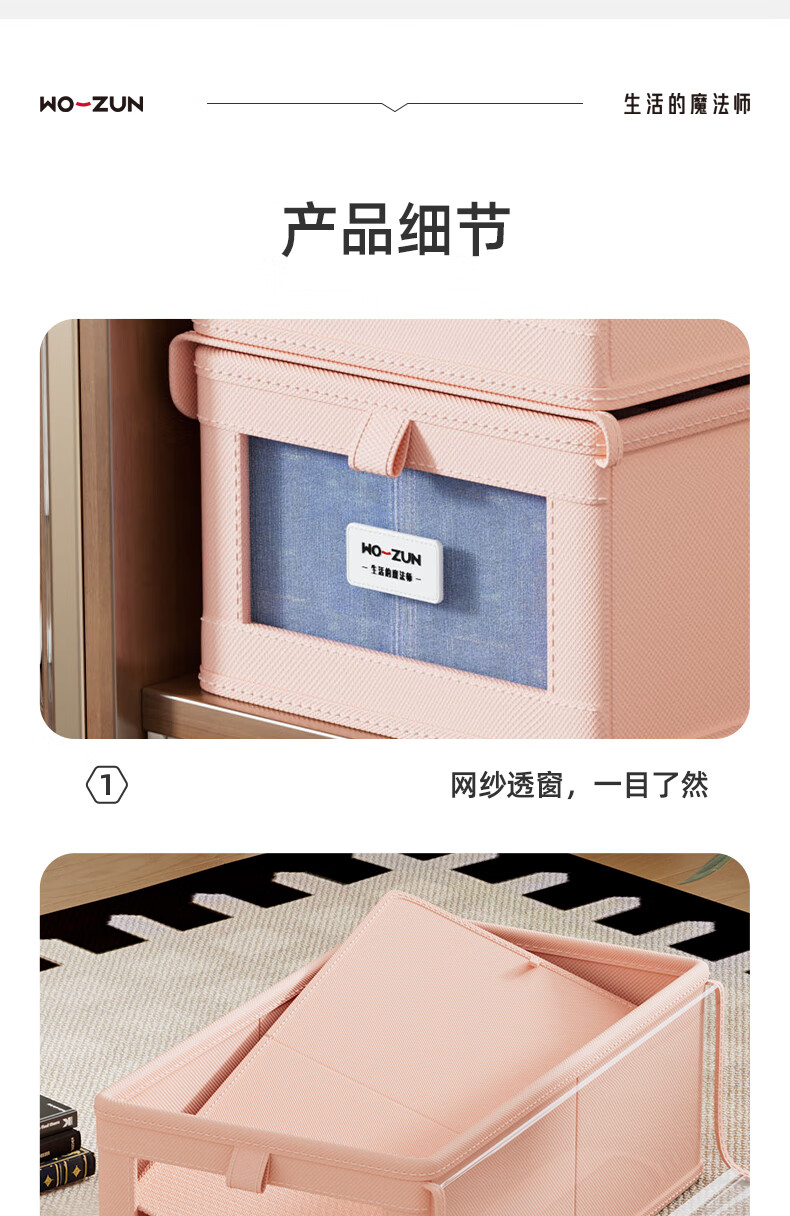 沃尊收纳盒衣柜大容量整理盒专用四件套裤子收纳神器透窗衣物收纳筐 粉色【中号】升级带盖款 1个装:25年新款 立省衣柜空间