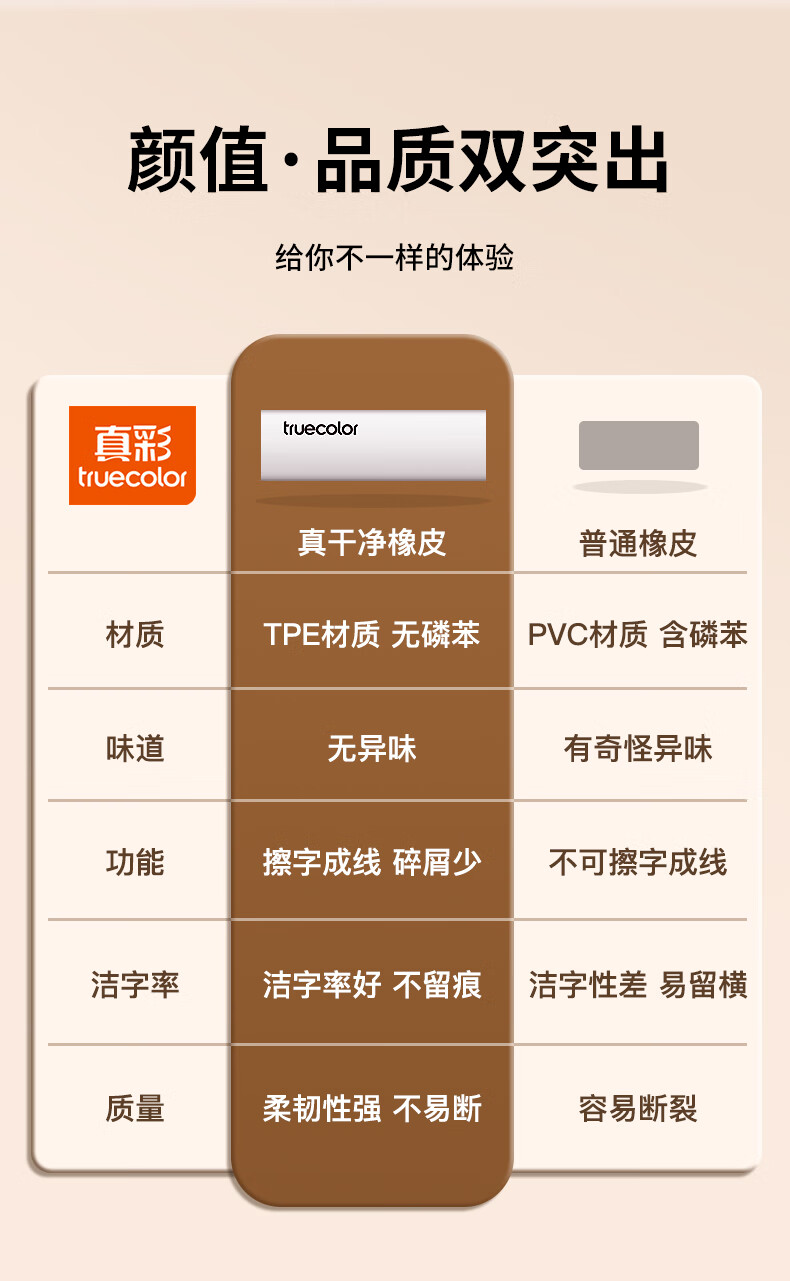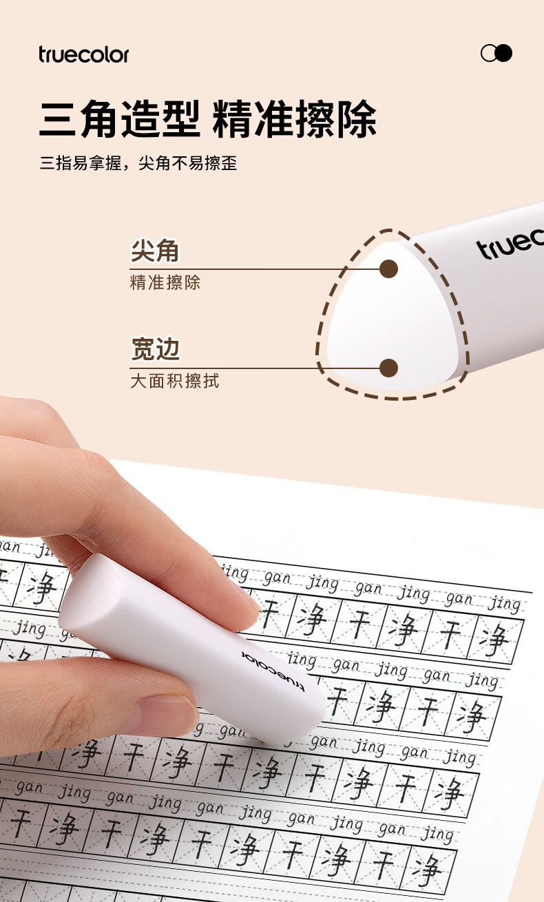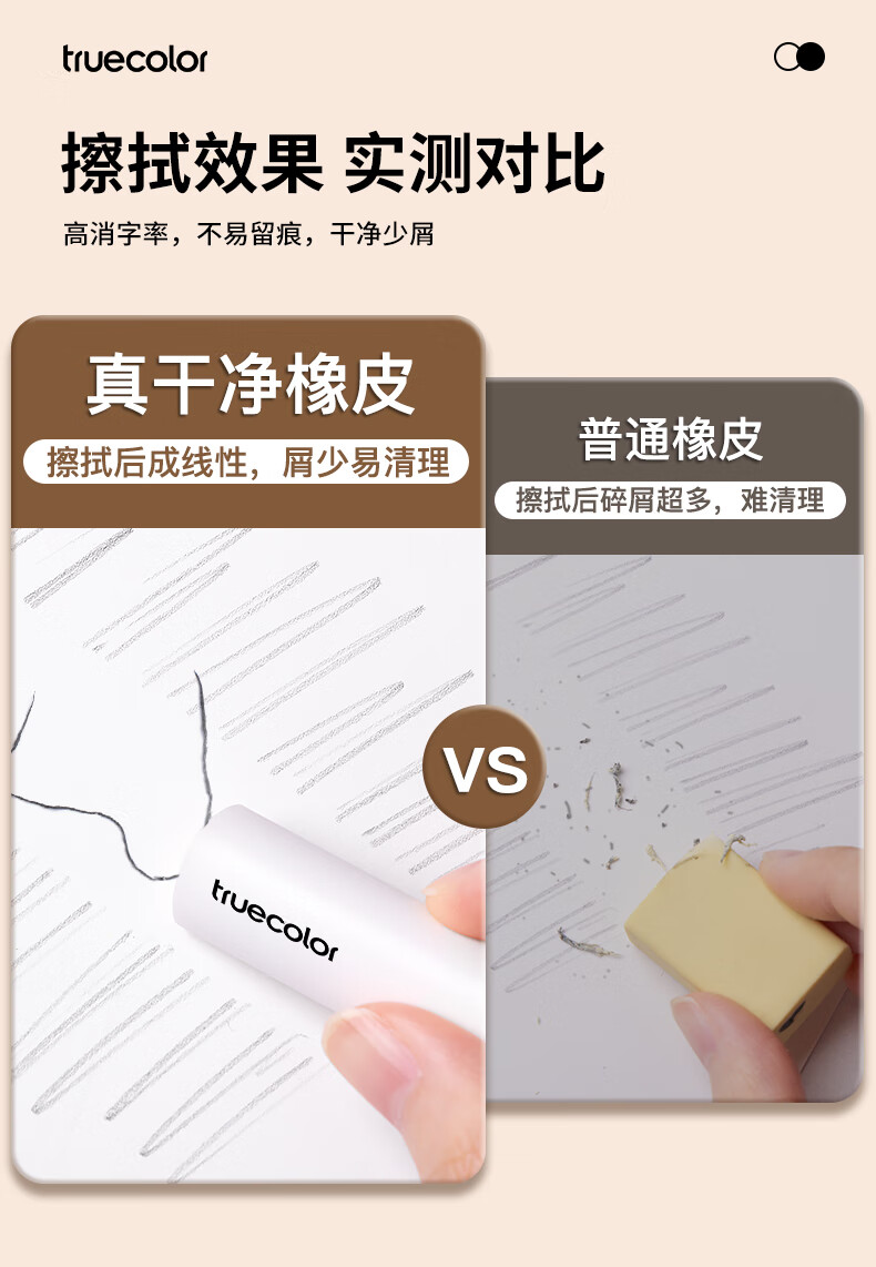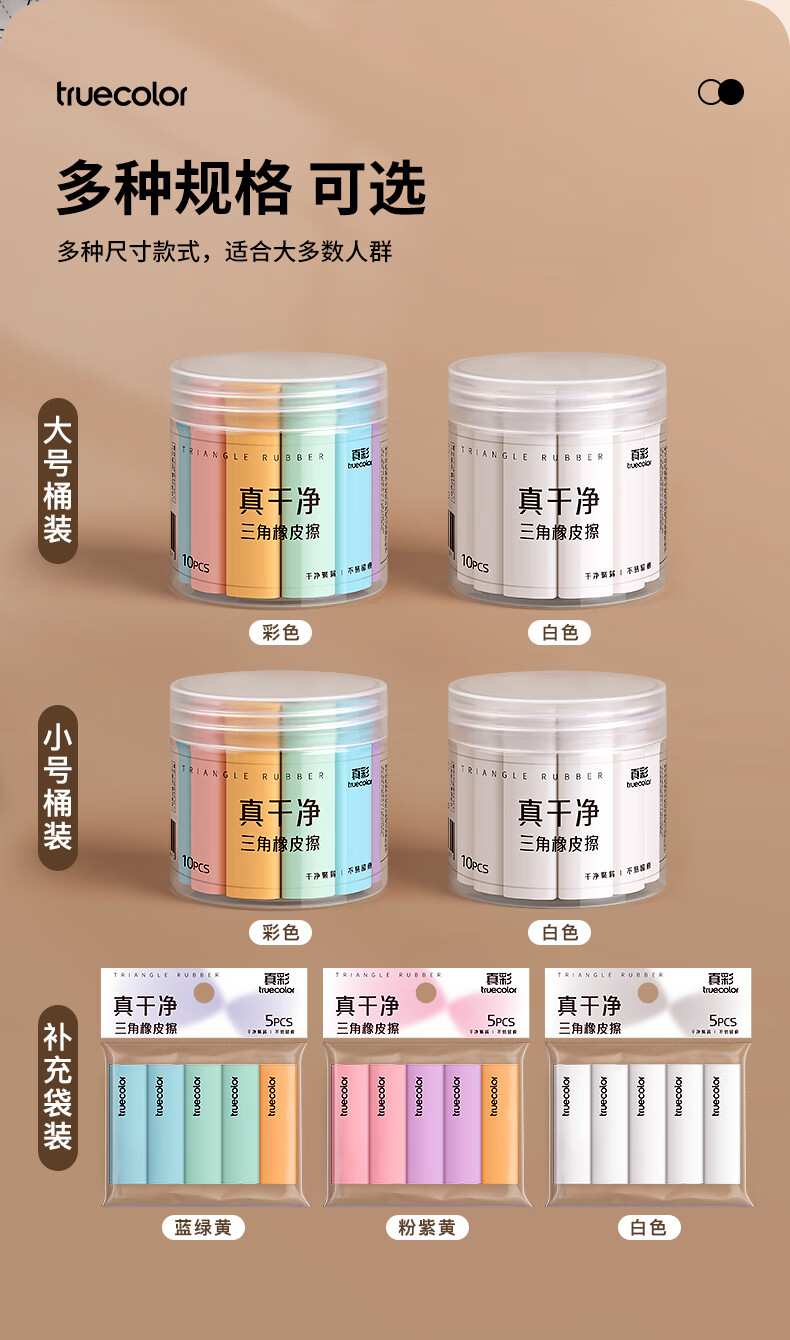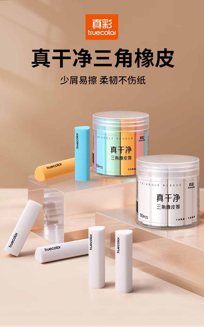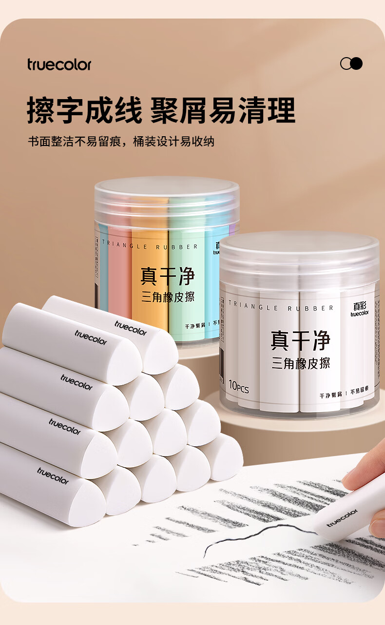 真彩集屑三角橡皮擦无屑超干净小学生专用擦拭成条擦字干净不留痕2B少屑橡皮儿童写字素描美术橡皮擦 彩色-10个桶(中号)