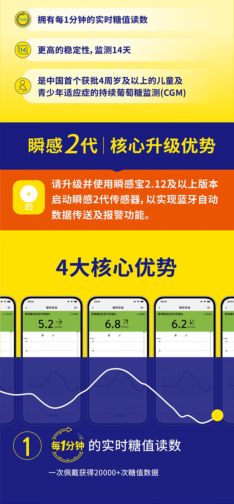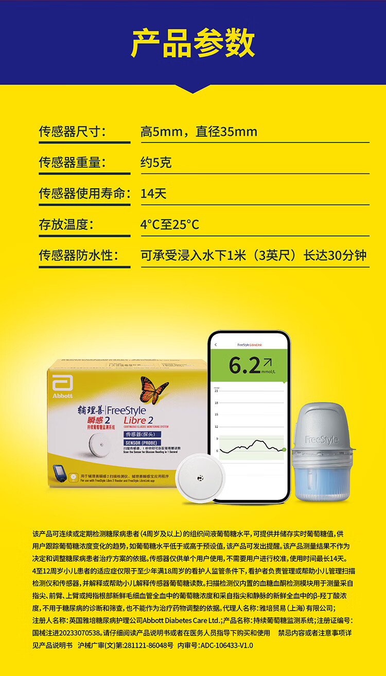 雅培动态血糖仪瞬感2代 免血糖试纸 进口医用高精准血糖动态监测仪1枚