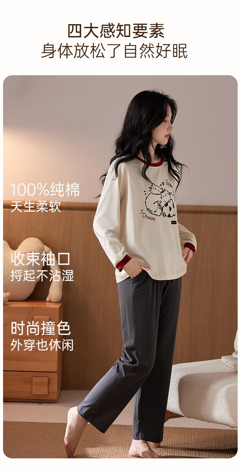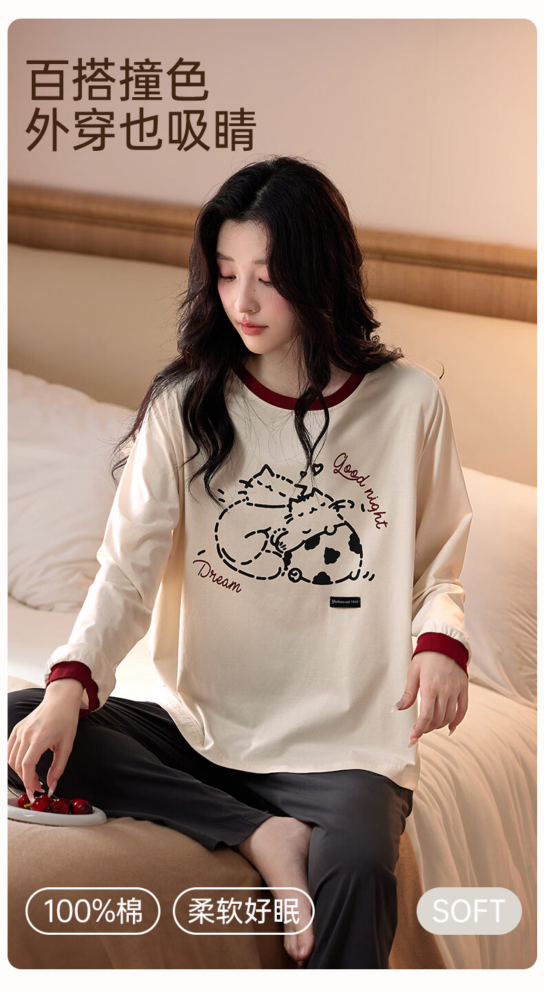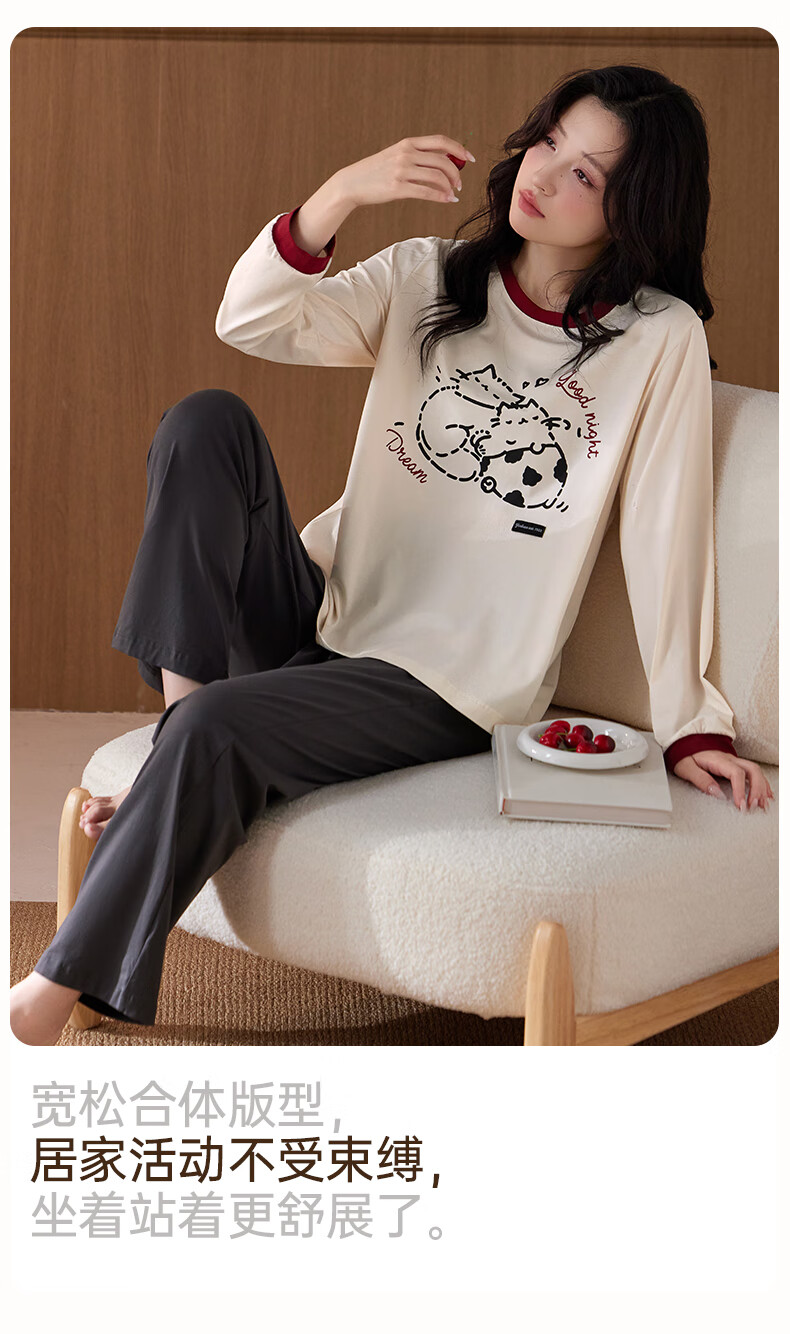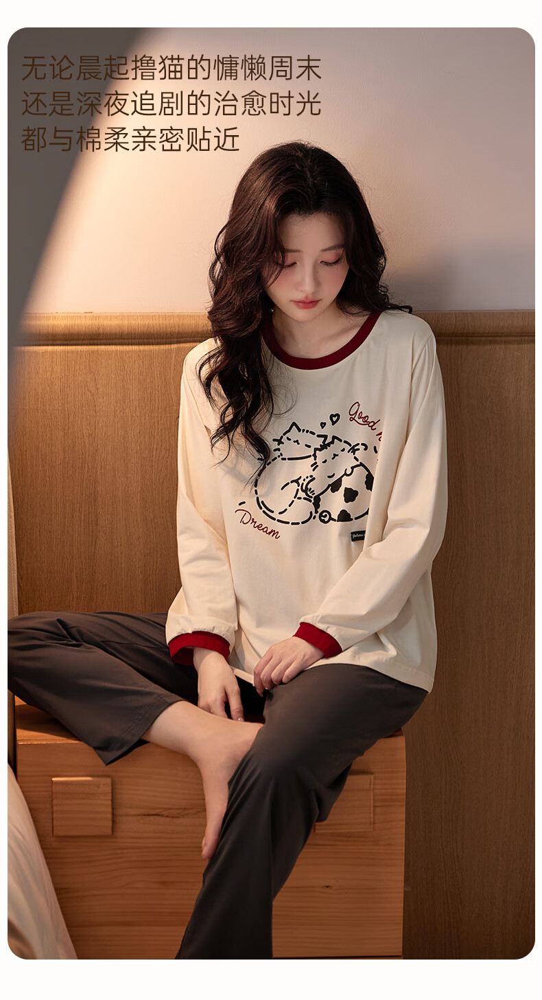 玛伦萨纯棉睡衣女春秋季2025新款可外穿柔软长袖长裤圆领女士家居服套装 米白 M