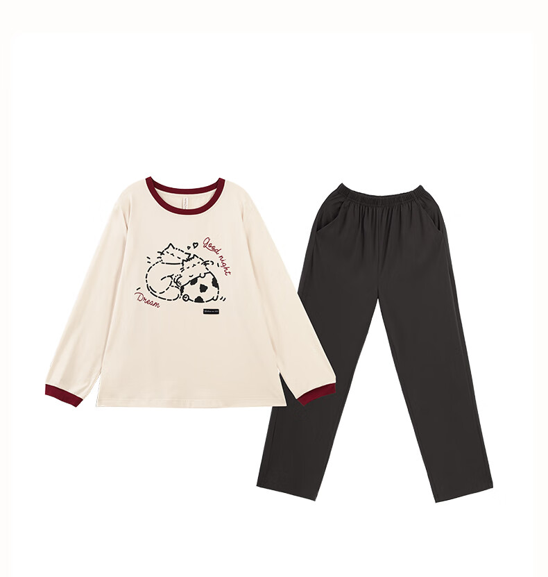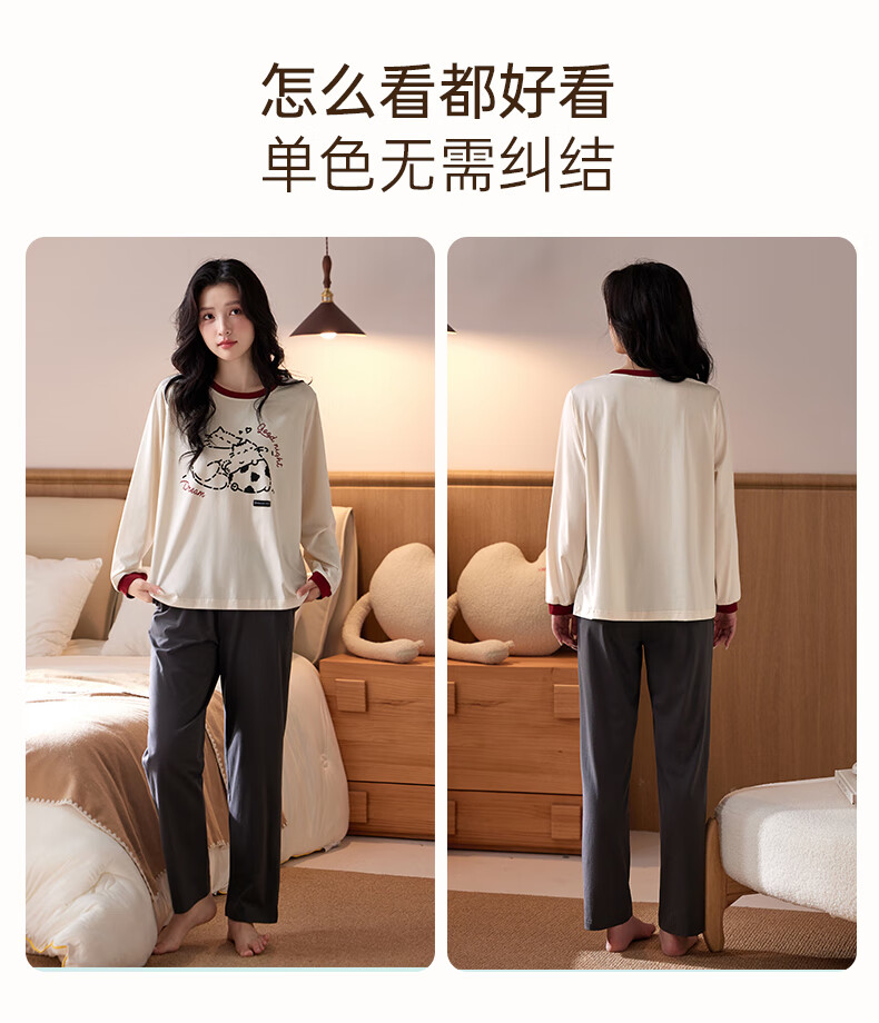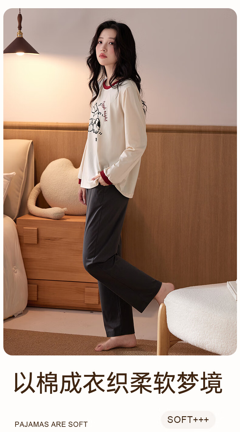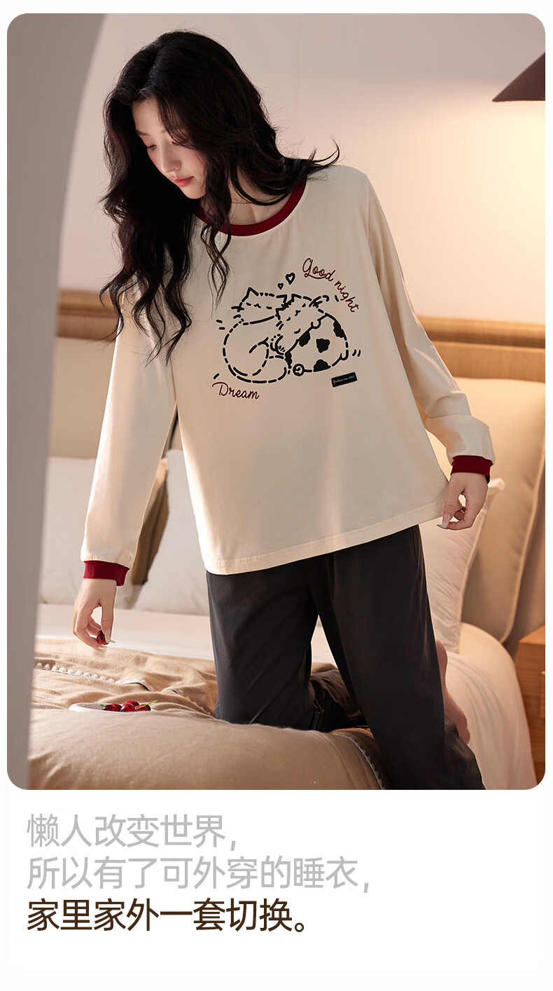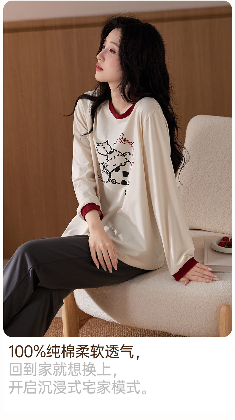 玛伦萨纯棉睡衣女春秋季2025新款可外穿柔软长袖长裤圆领女士家居服套装 米白 M