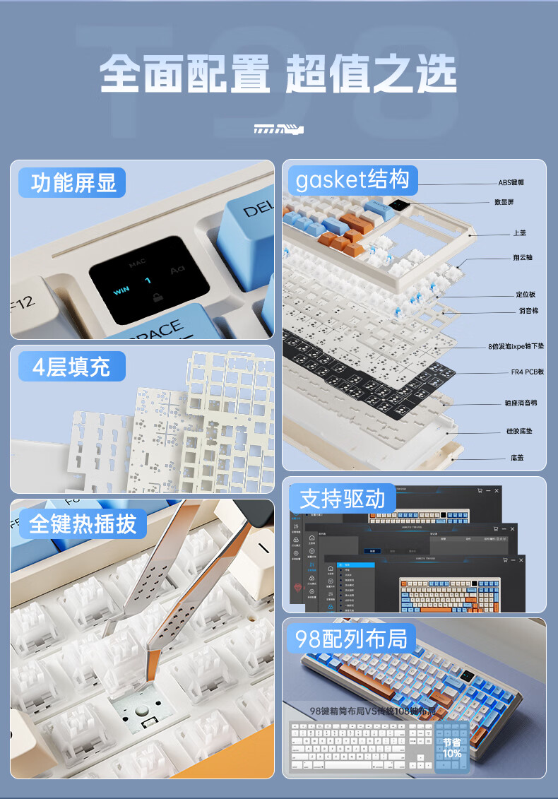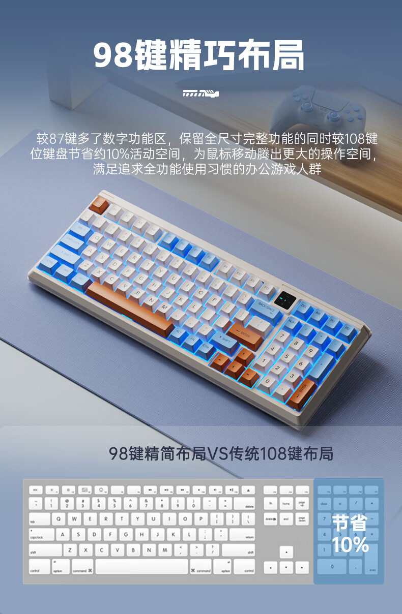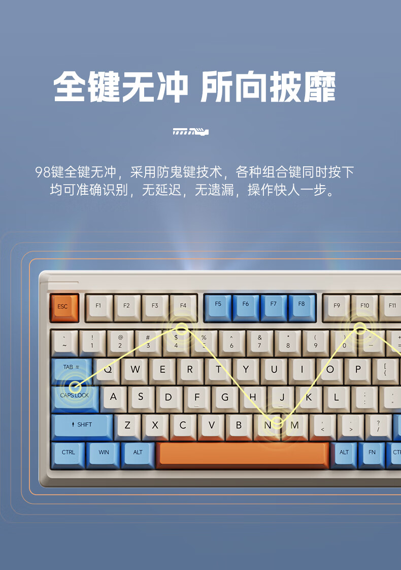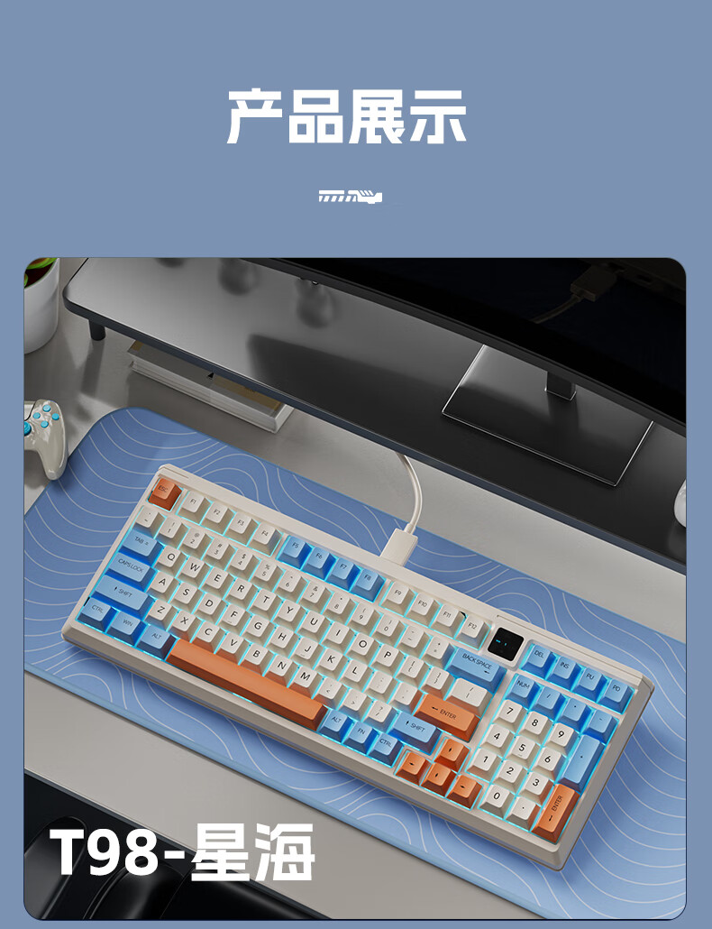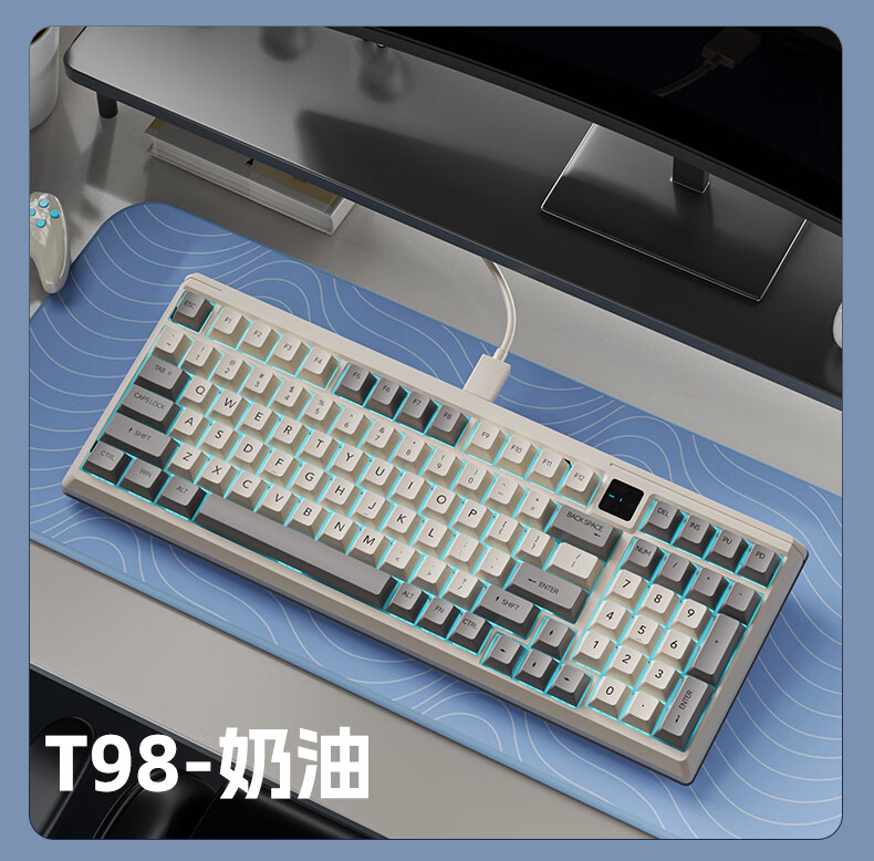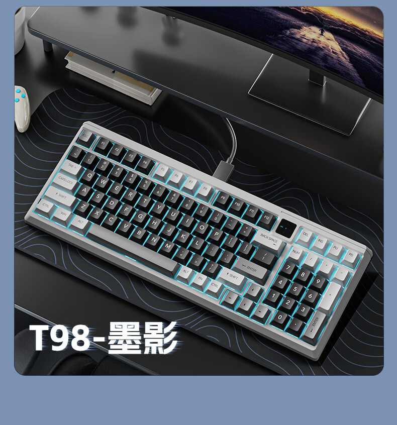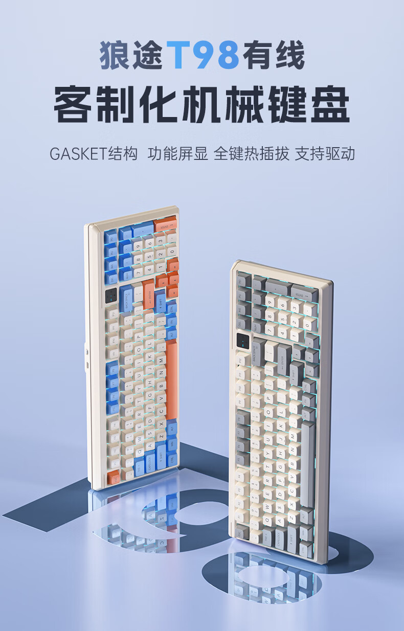 狼途T98有线机械键盘客制化全键热插拔Gasket结构三模无线蓝牙2.4G电竞游戏办公码字键盘98键配列 【有线】墨影+金轴