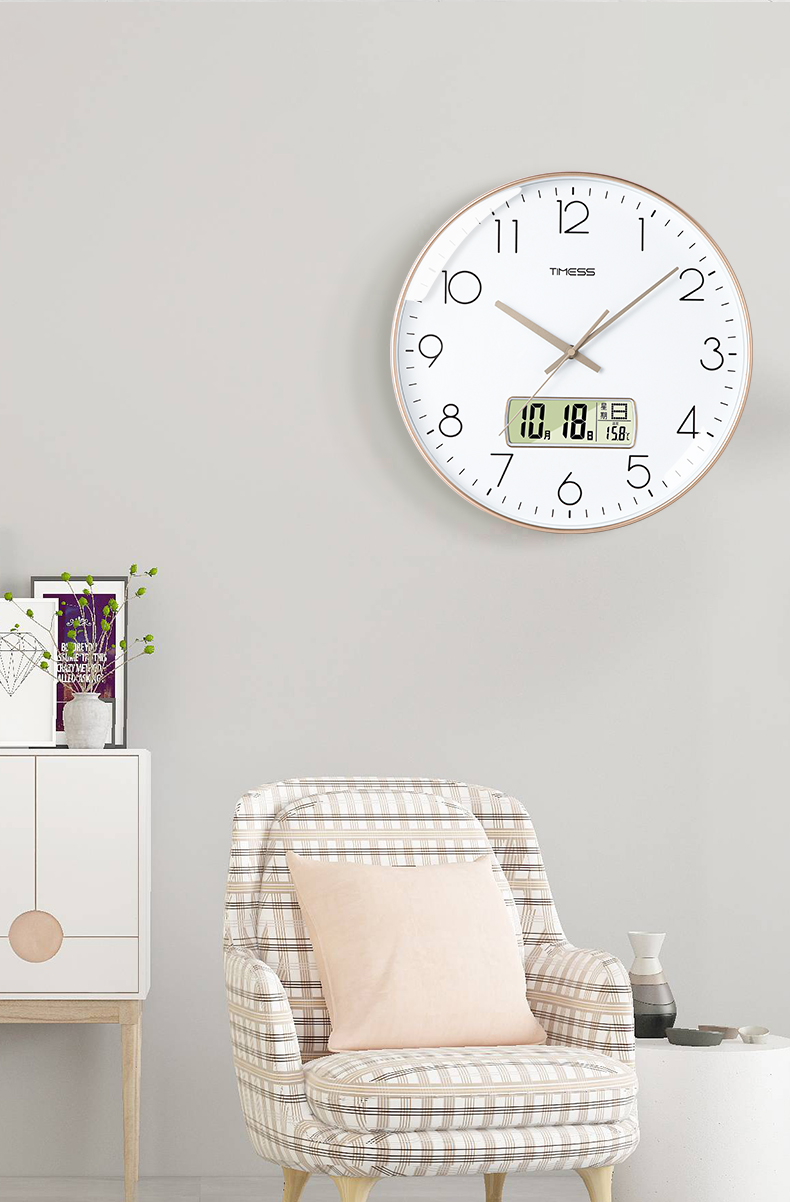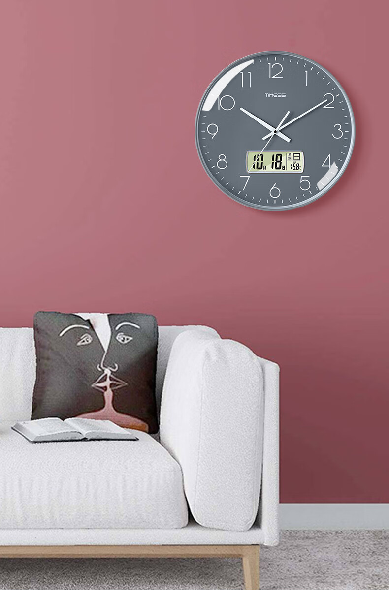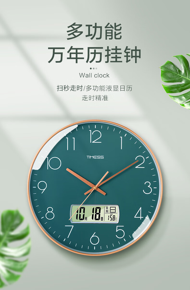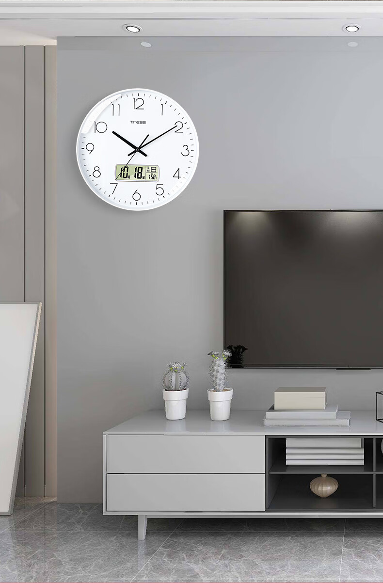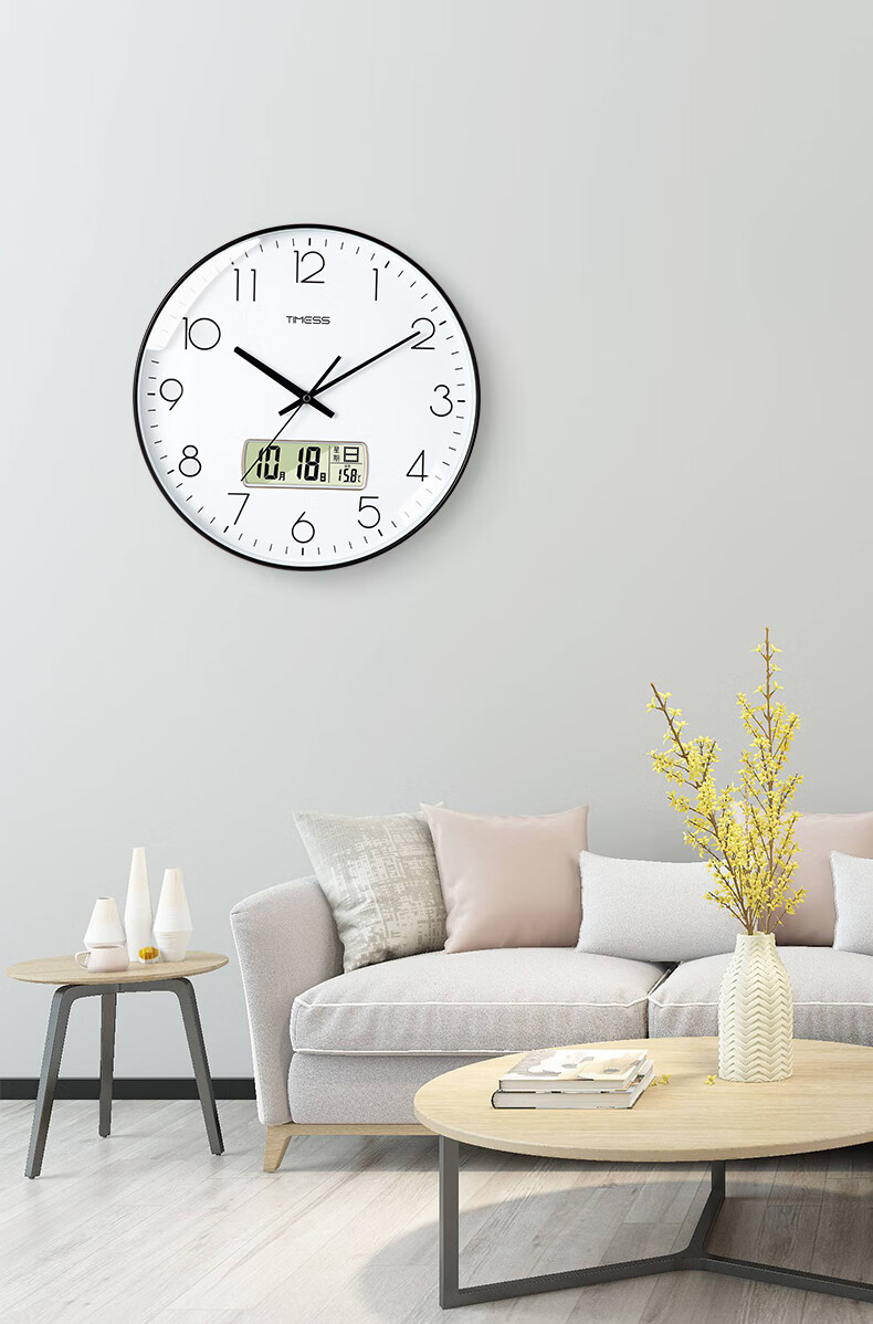 Timess液晶显示万年历挂钟客厅圆形钟表家用时钟扫秒机芯石英钟30cm