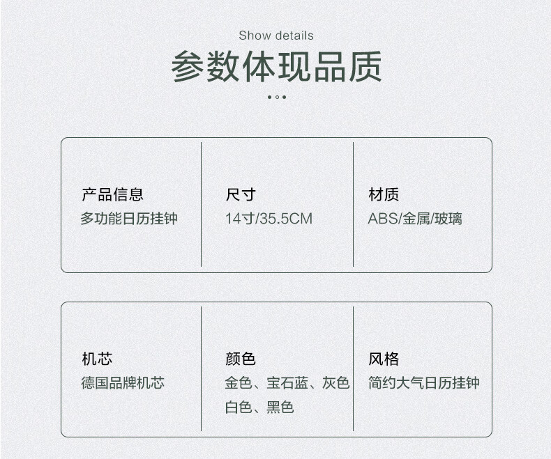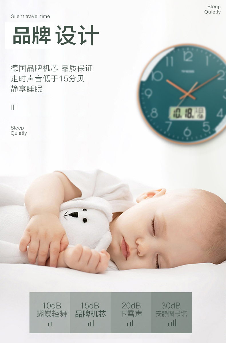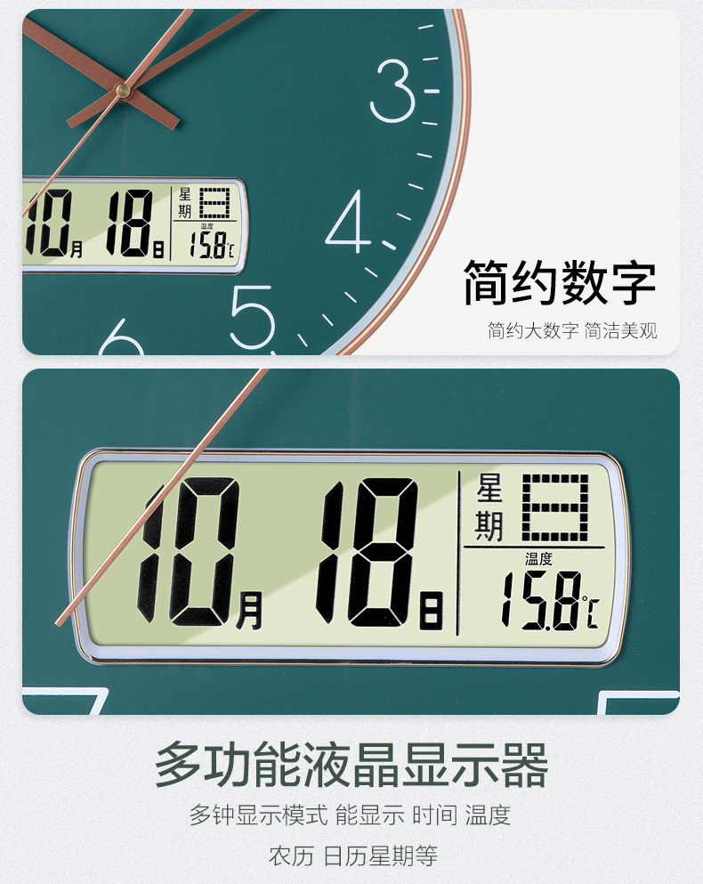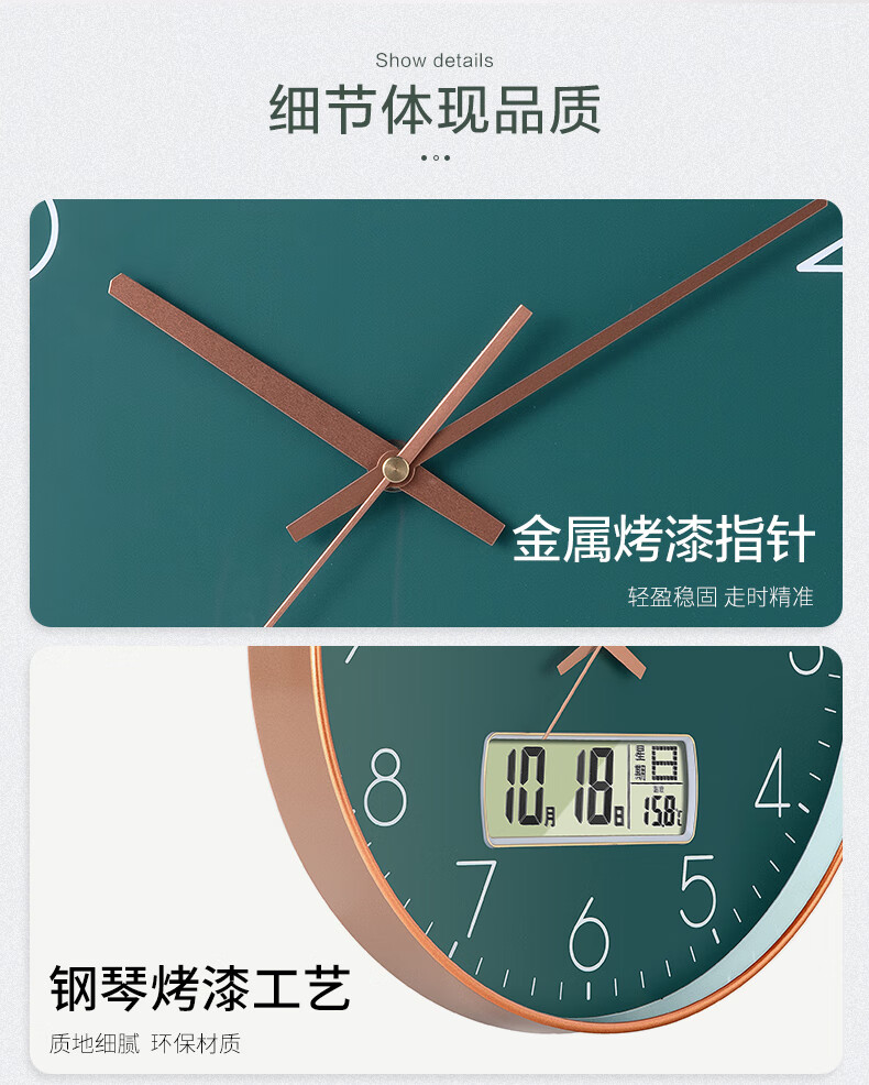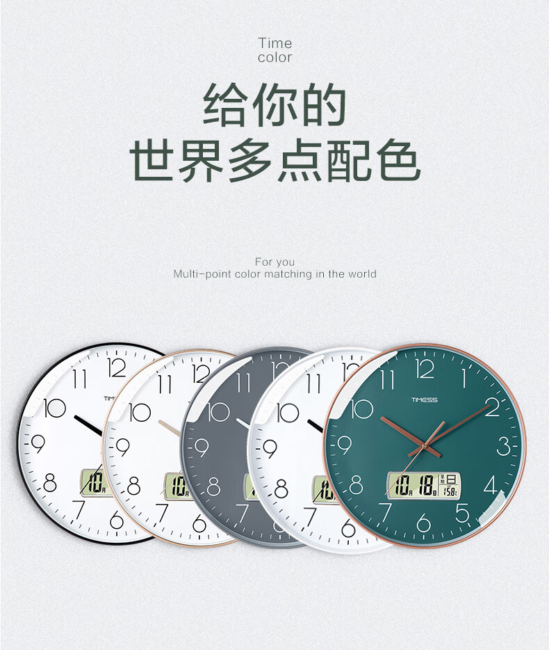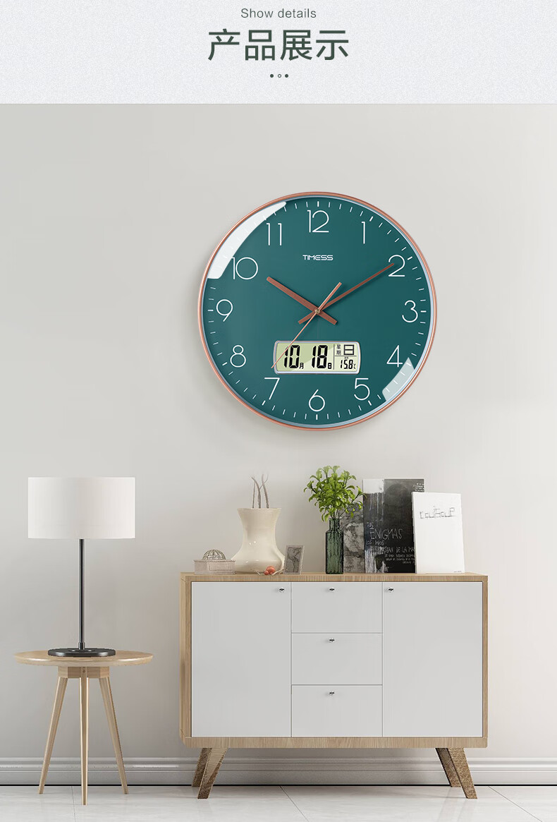 Timess液晶显示万年历挂钟客厅圆形钟表家用时钟扫秒机芯石英钟30cm
