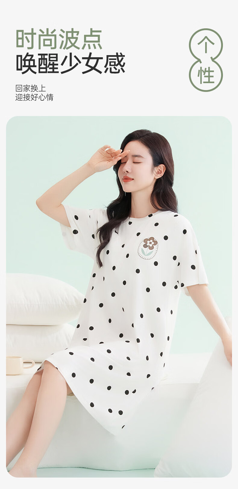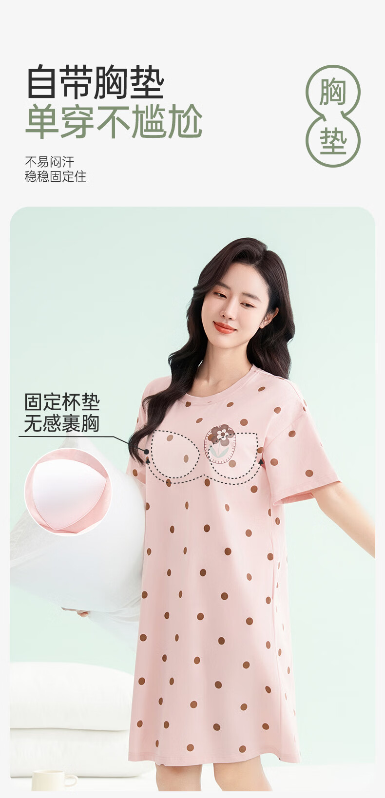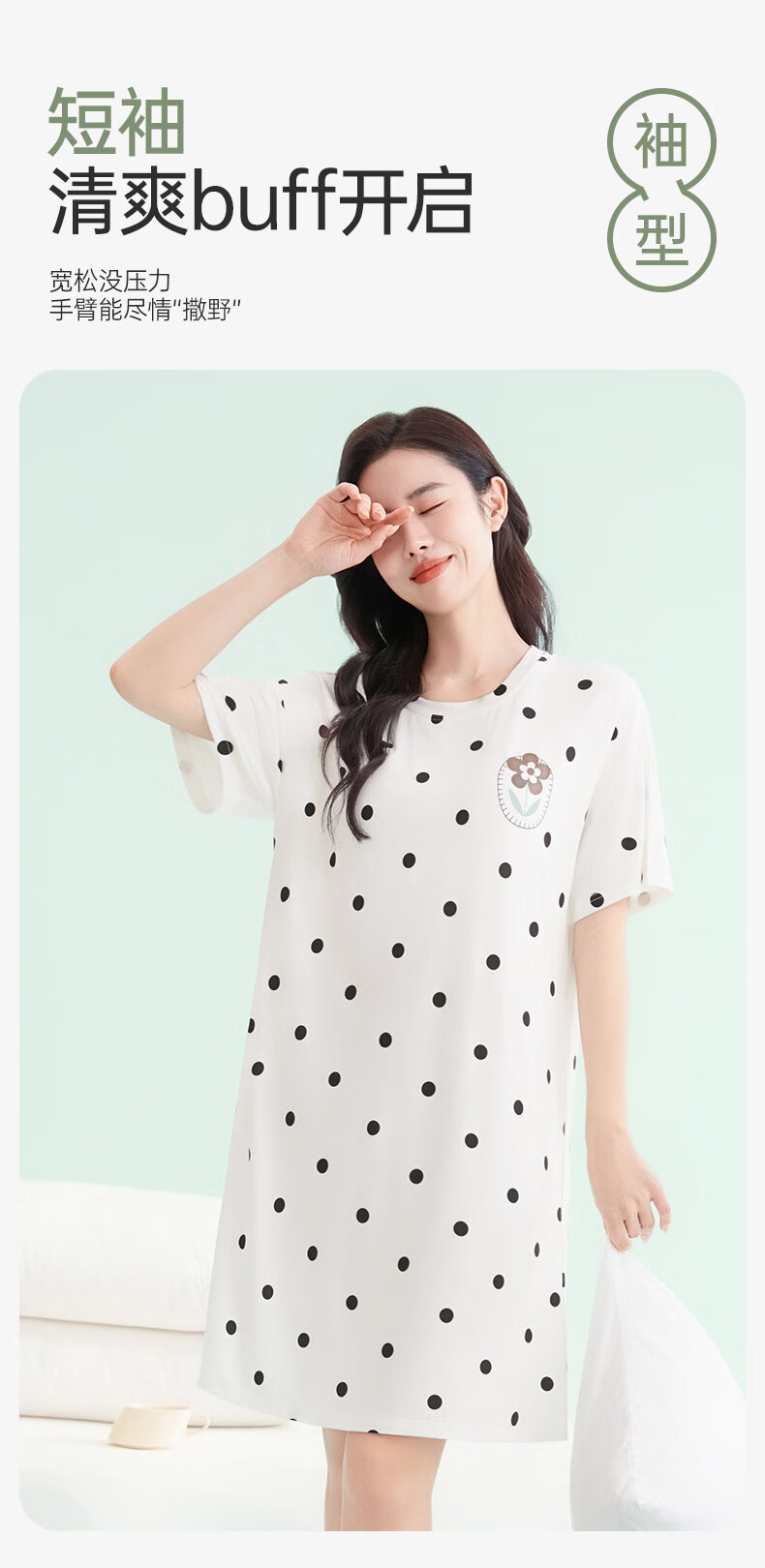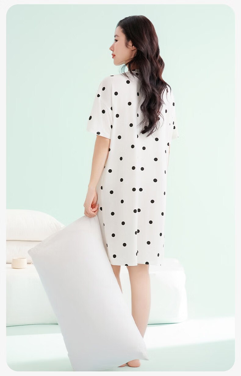 芬腾可安睡衣女【自带胸垫 】2025休闲圆领短袖裙波点女士家居服透气睡裙 白色 2XL