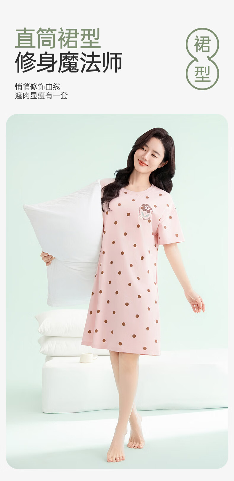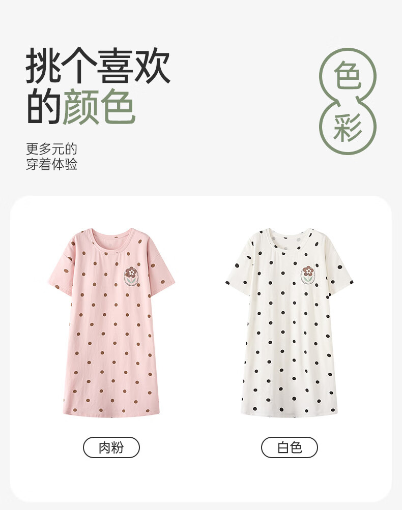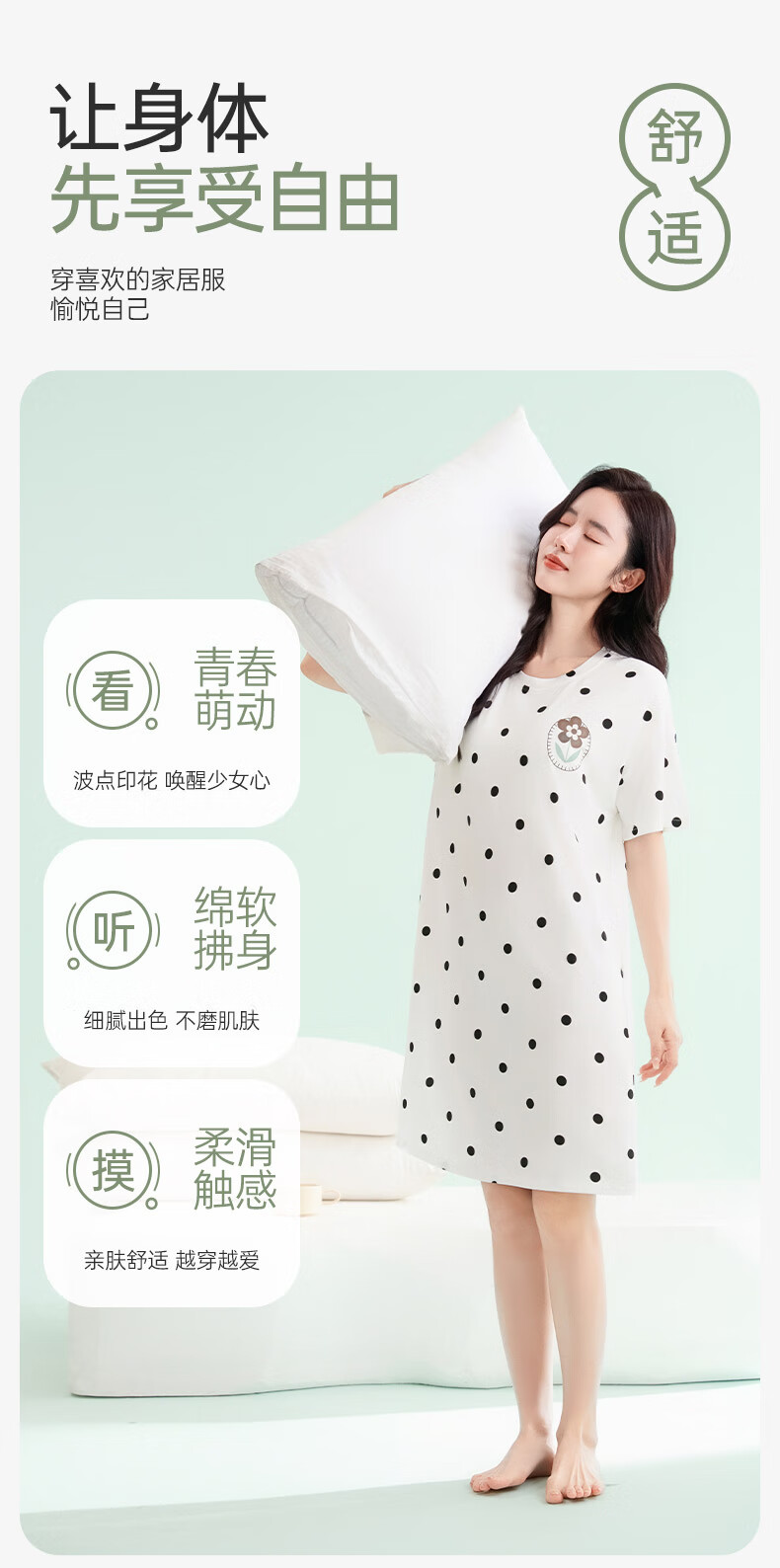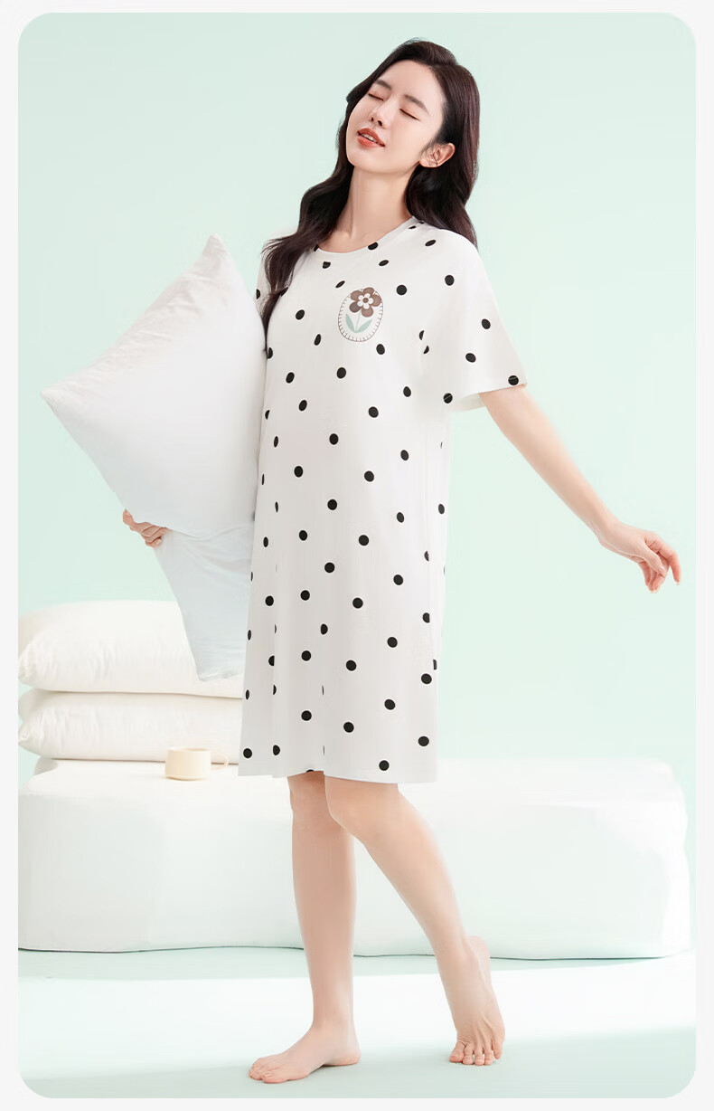 芬腾可安睡衣女【自带胸垫 】2025休闲圆领短袖裙波点女士家居服透气睡裙 白色 2XL