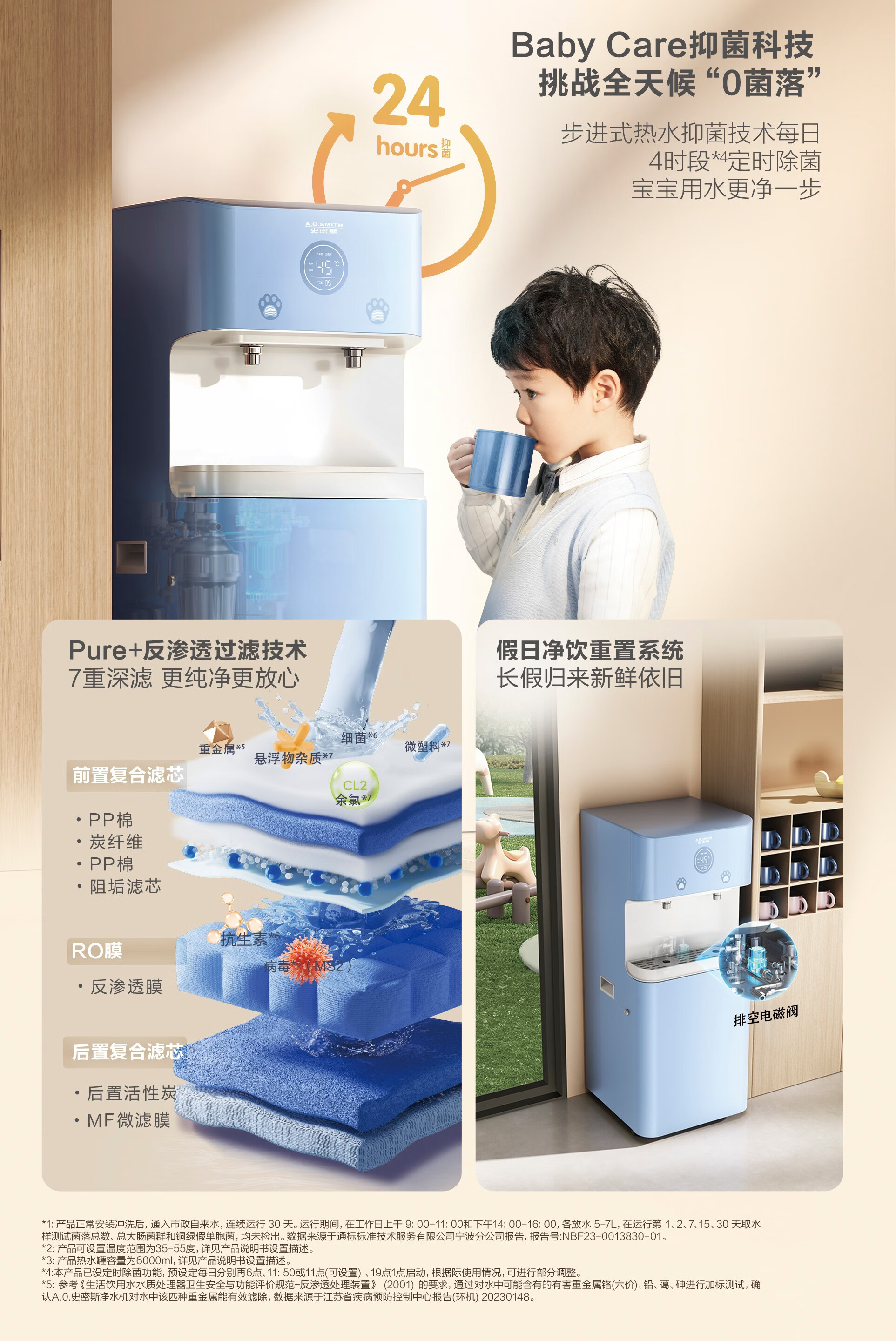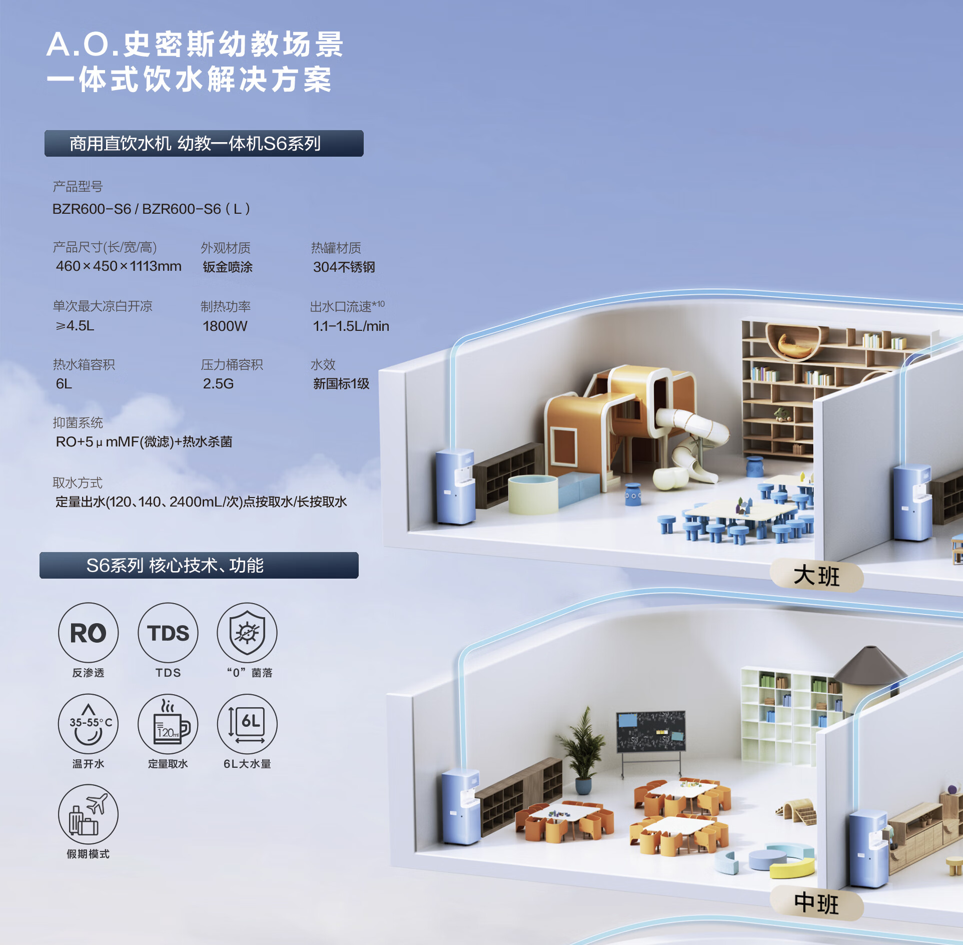 AO商用反渗透净水器幼儿园600G大流量双龙头温水直饮机多功能商务 BZR600-S6