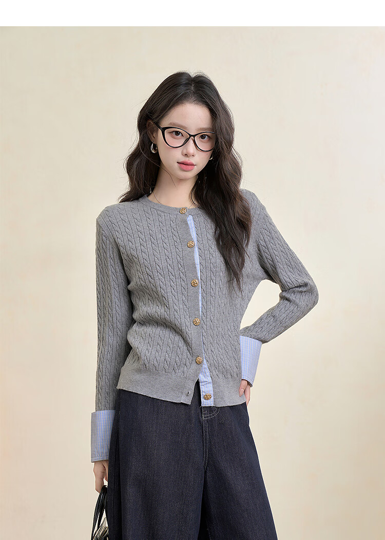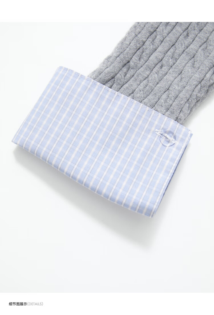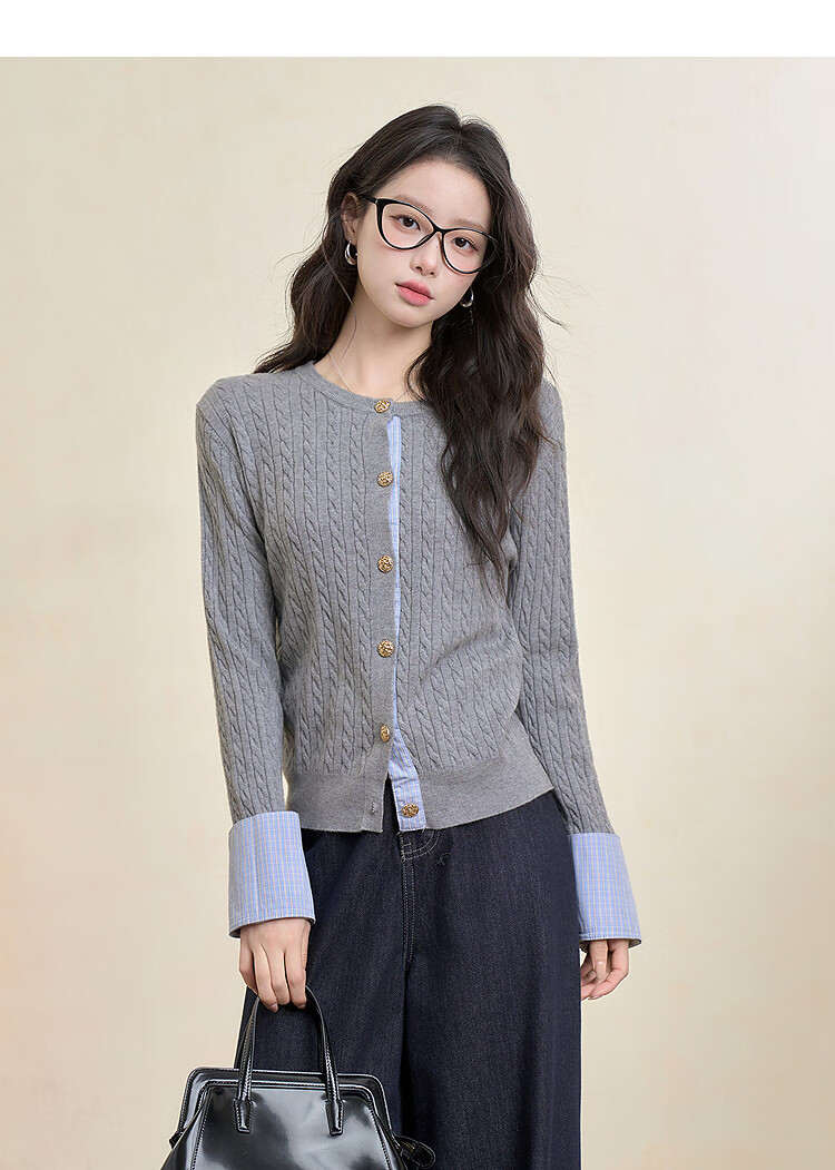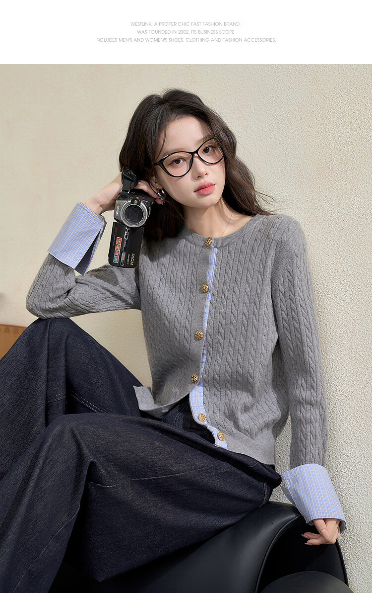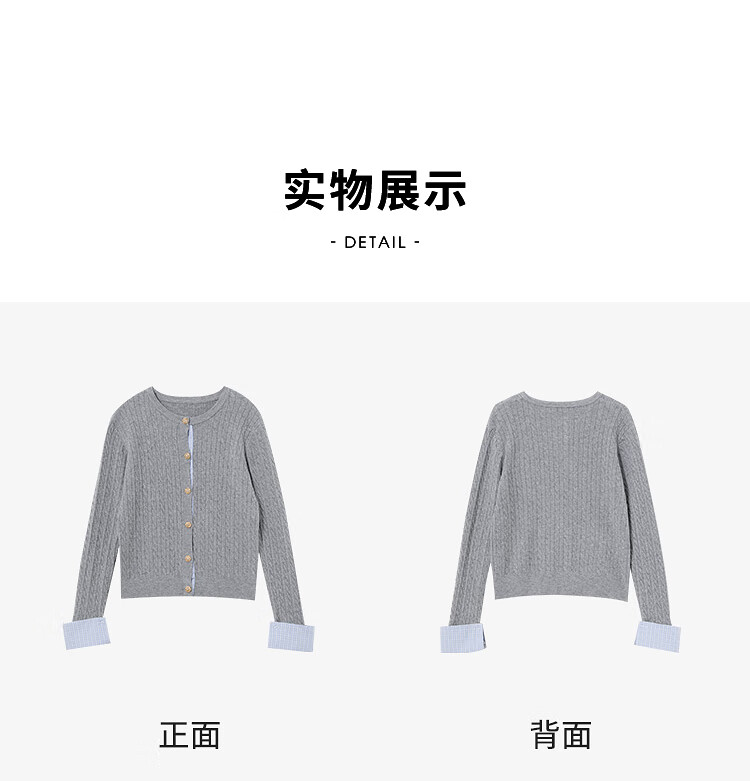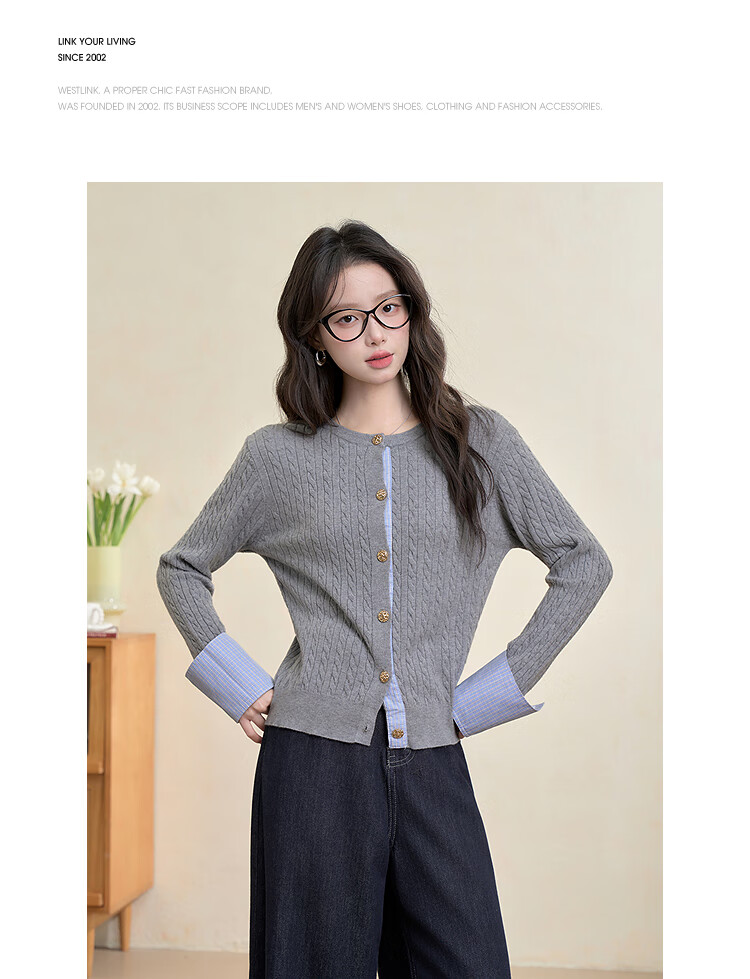 西遇(Westlink)通勤短款针织开衫女秋季新款圆领撞色格纹拼接毛衣外套 灰色 (预售15天) M (160)