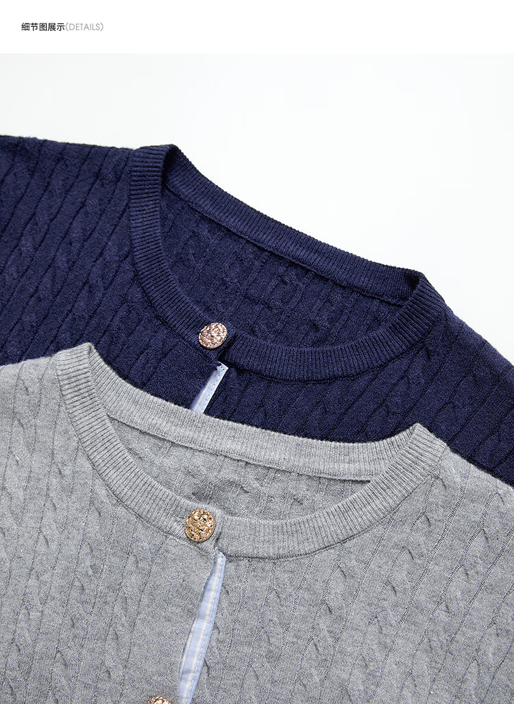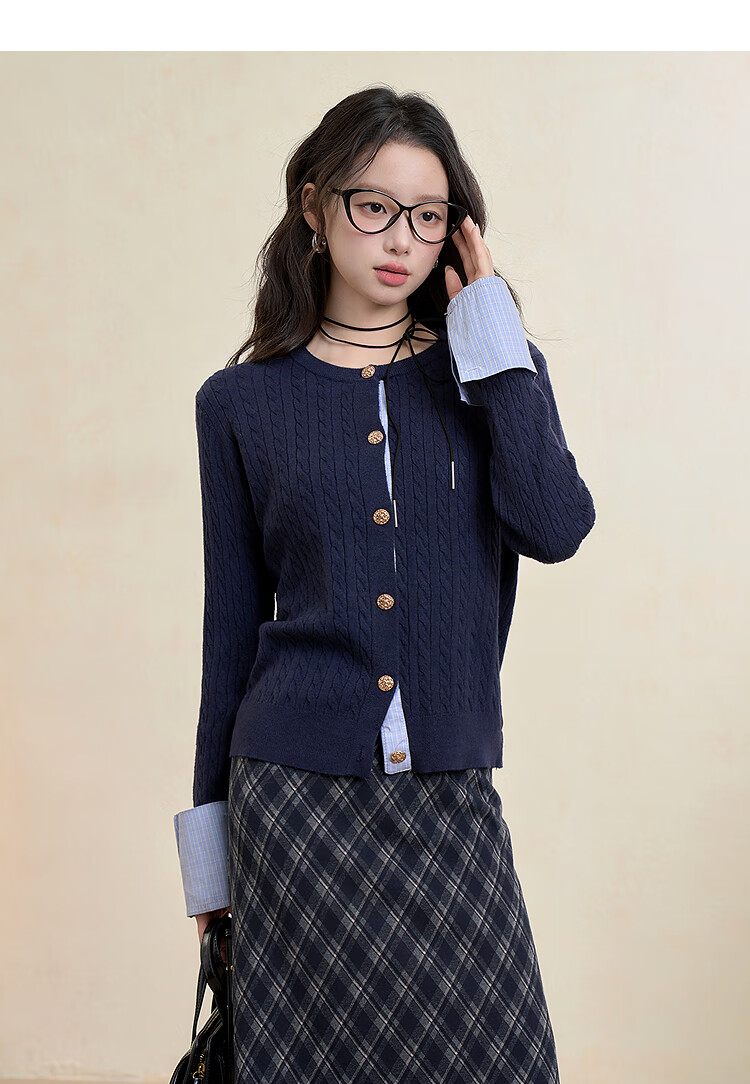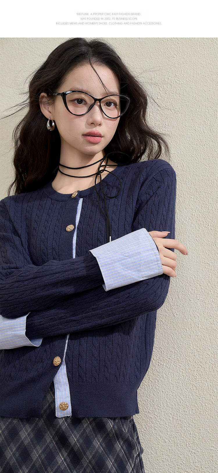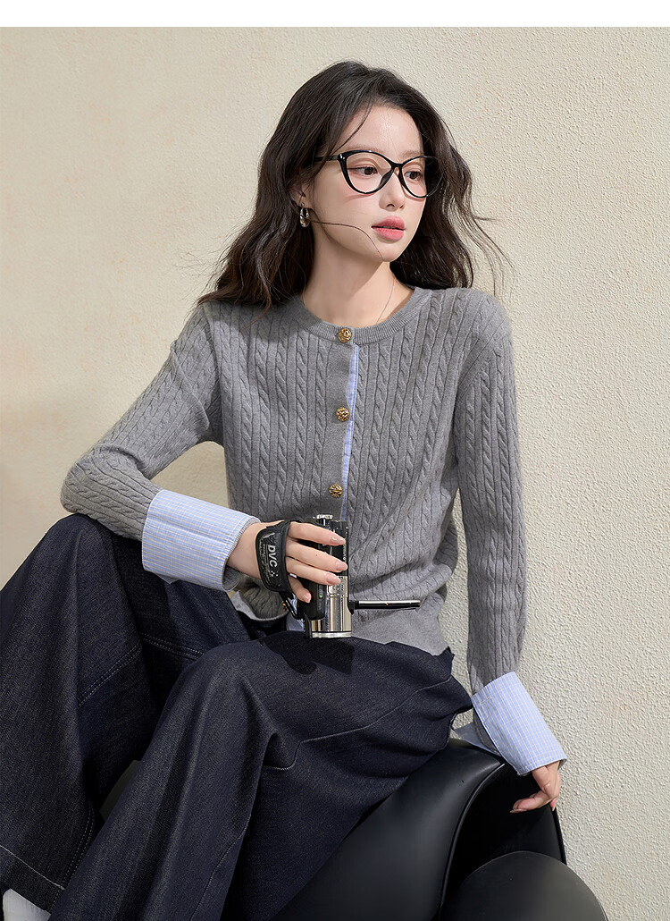西遇(Westlink)通勤短款针织开衫女秋季新款圆领撞色格纹拼接毛衣外套 灰色 (预售15天) M (160)