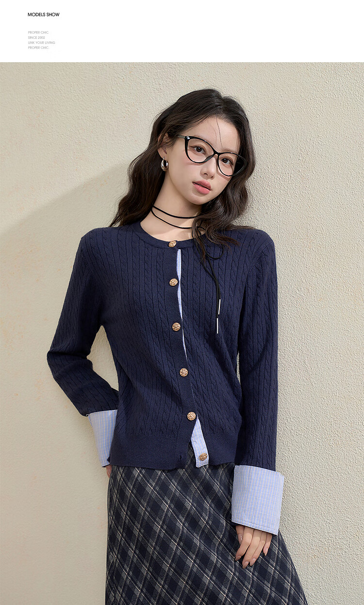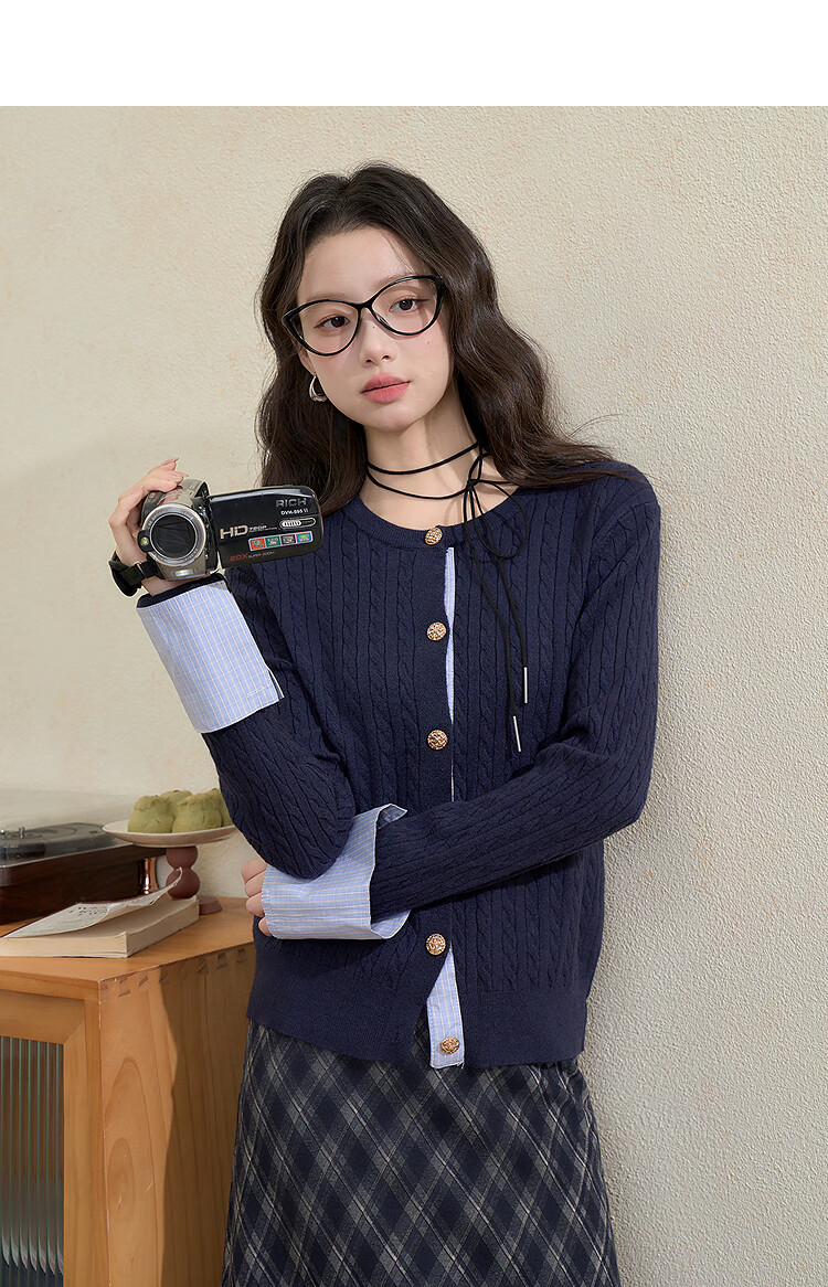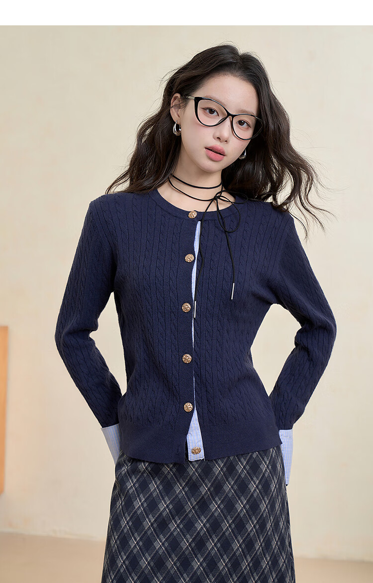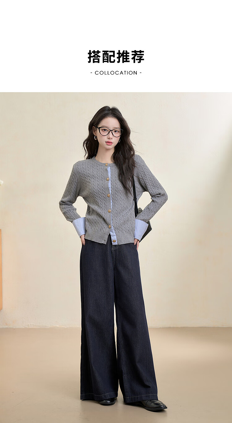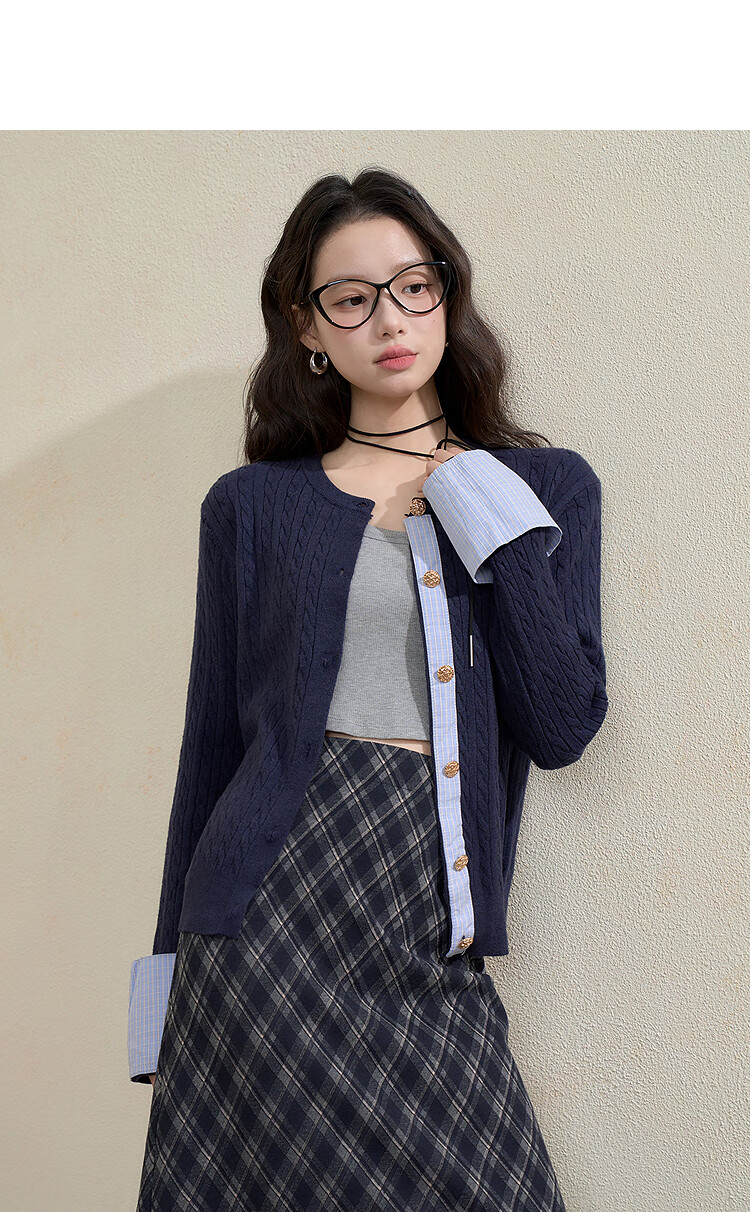 西遇(Westlink)通勤短款针织开衫女秋季新款圆领撞色格纹拼接毛衣外套 灰色 (预售15天) M (160)