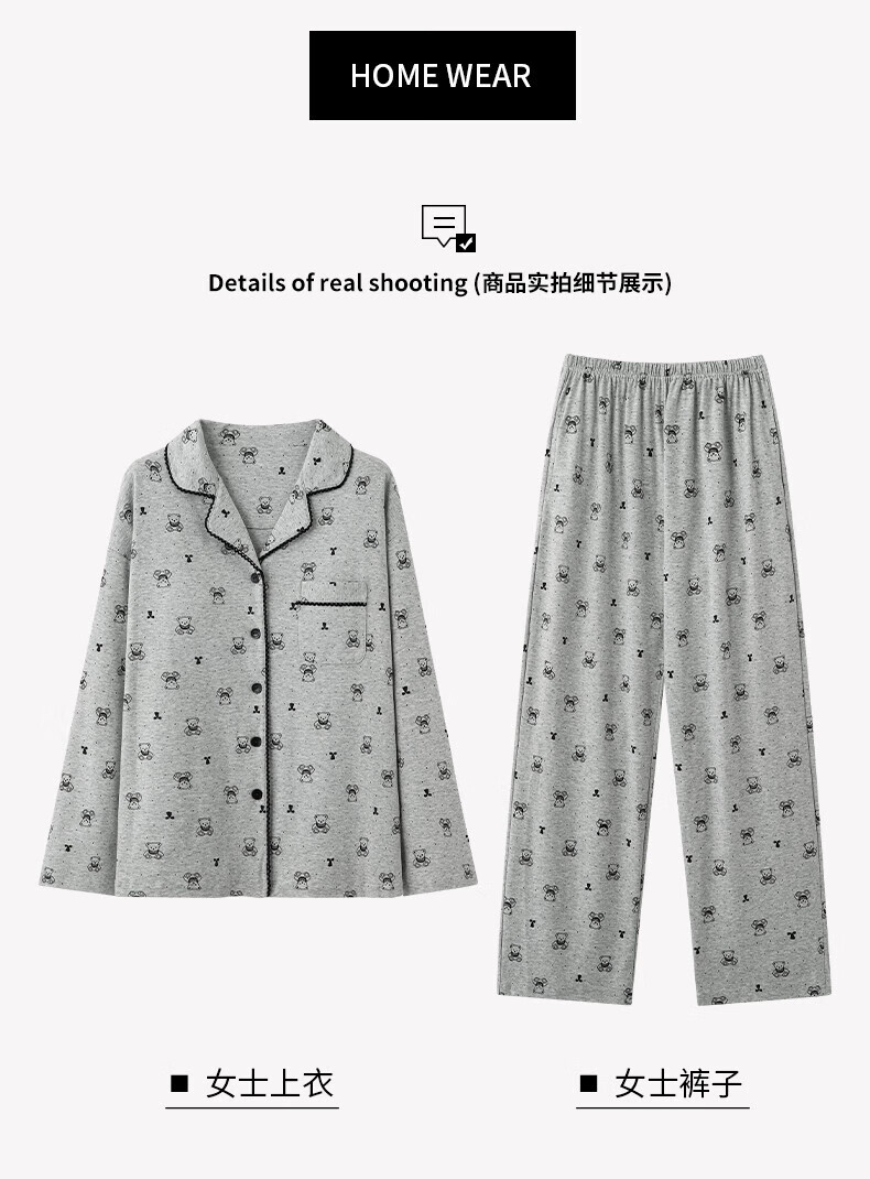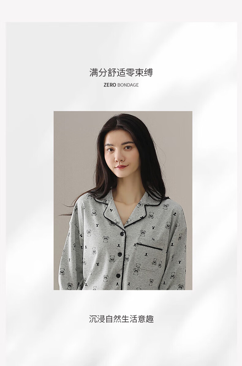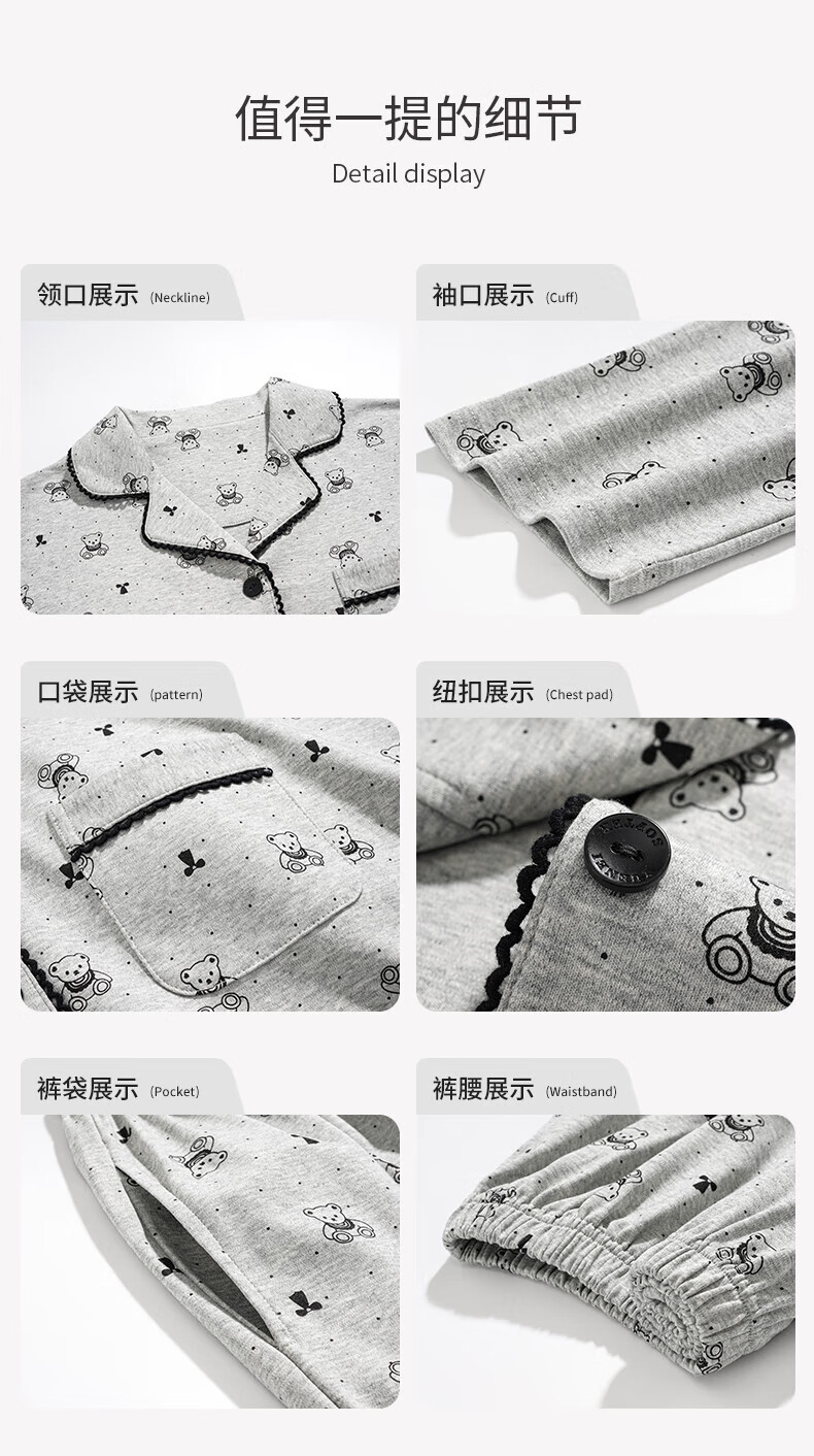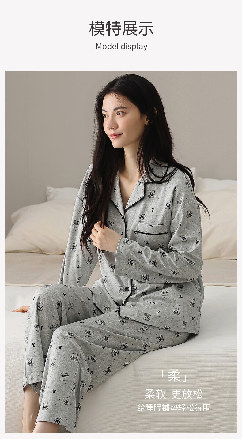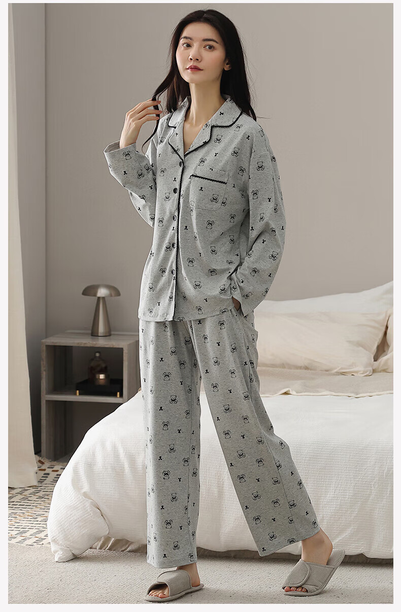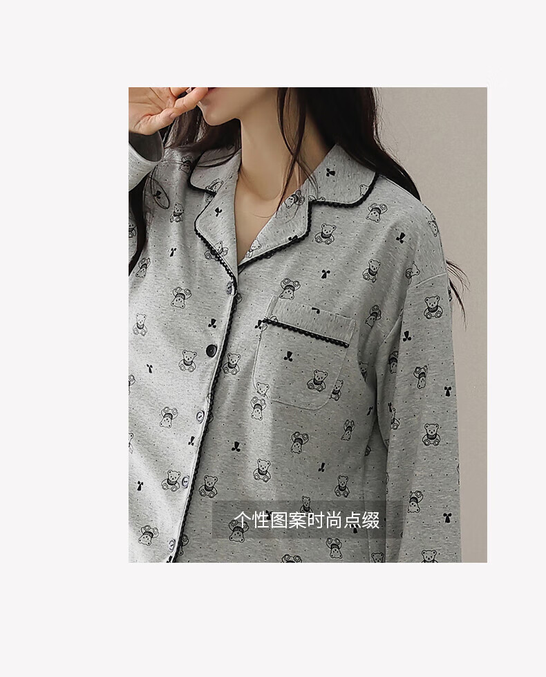 芬腾睡衣女纯棉2025秋新款亲肤柔软翻领翻领卡通宽松家居服套装 灰色 L