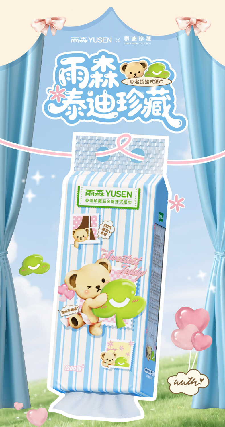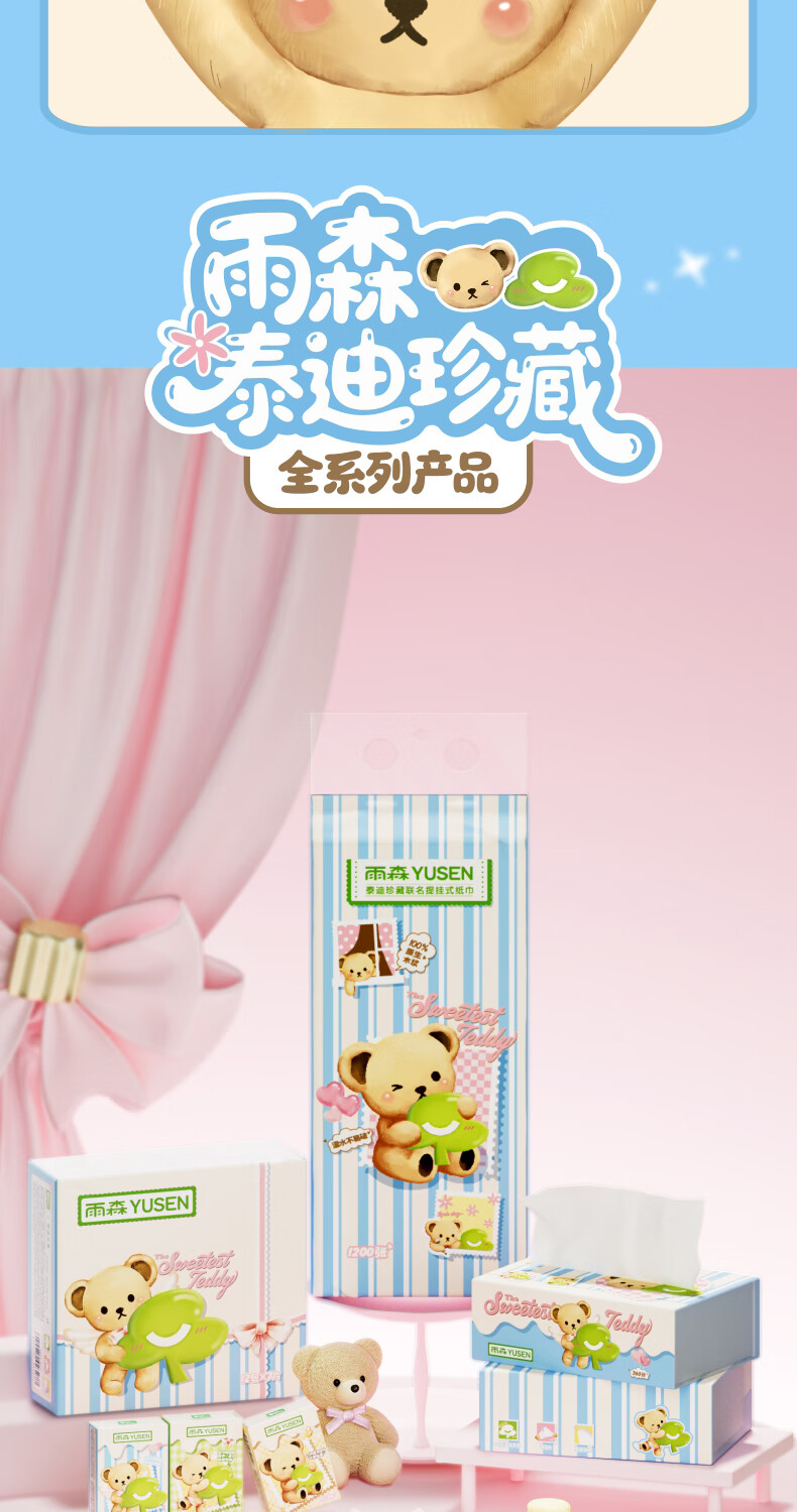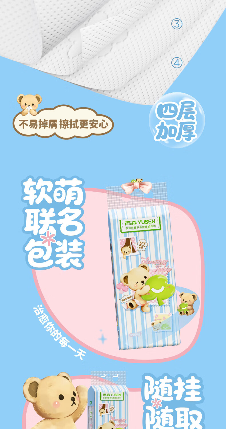 雨森(YUSEN)泰迪熊悬挂式抽纸1200张300抽4层加厚可湿水原生木浆纸抽纸面巾 4层 300抽*4提 【超值新品】