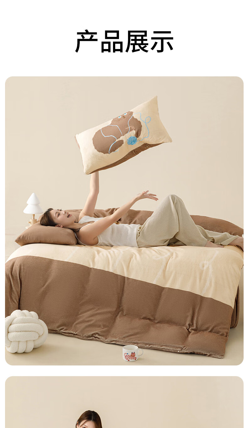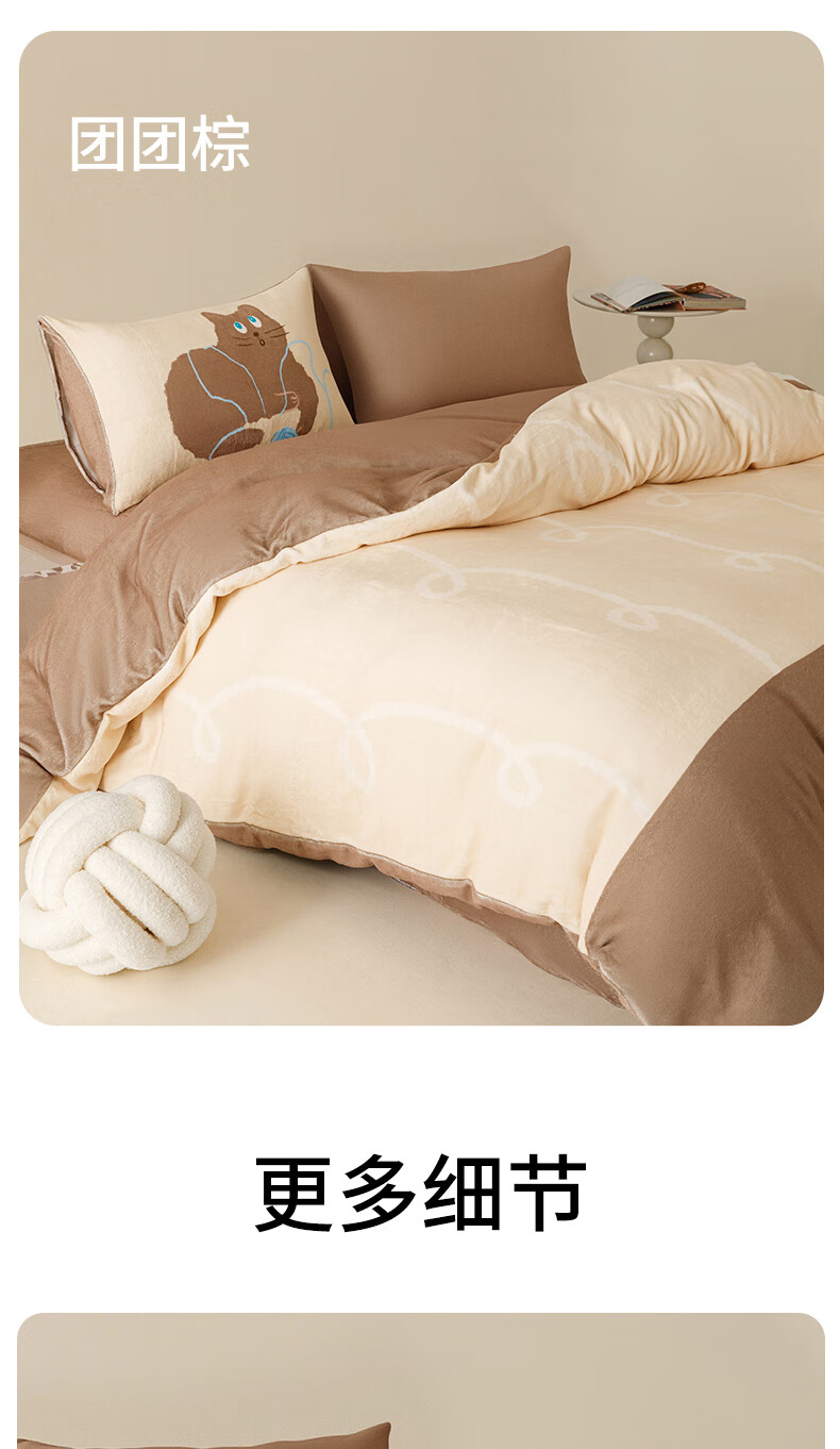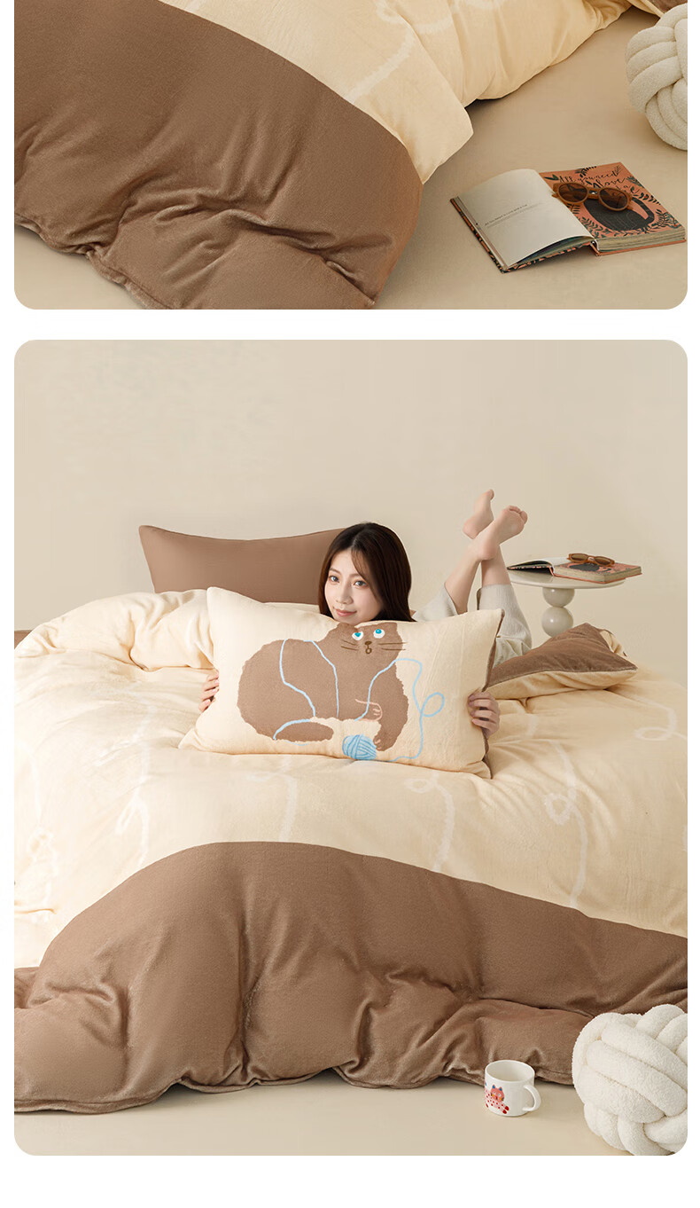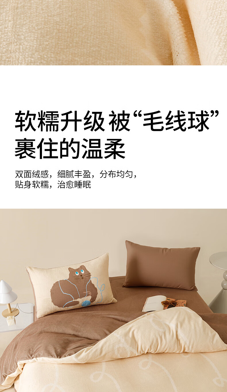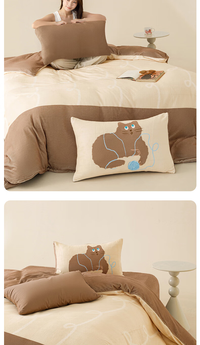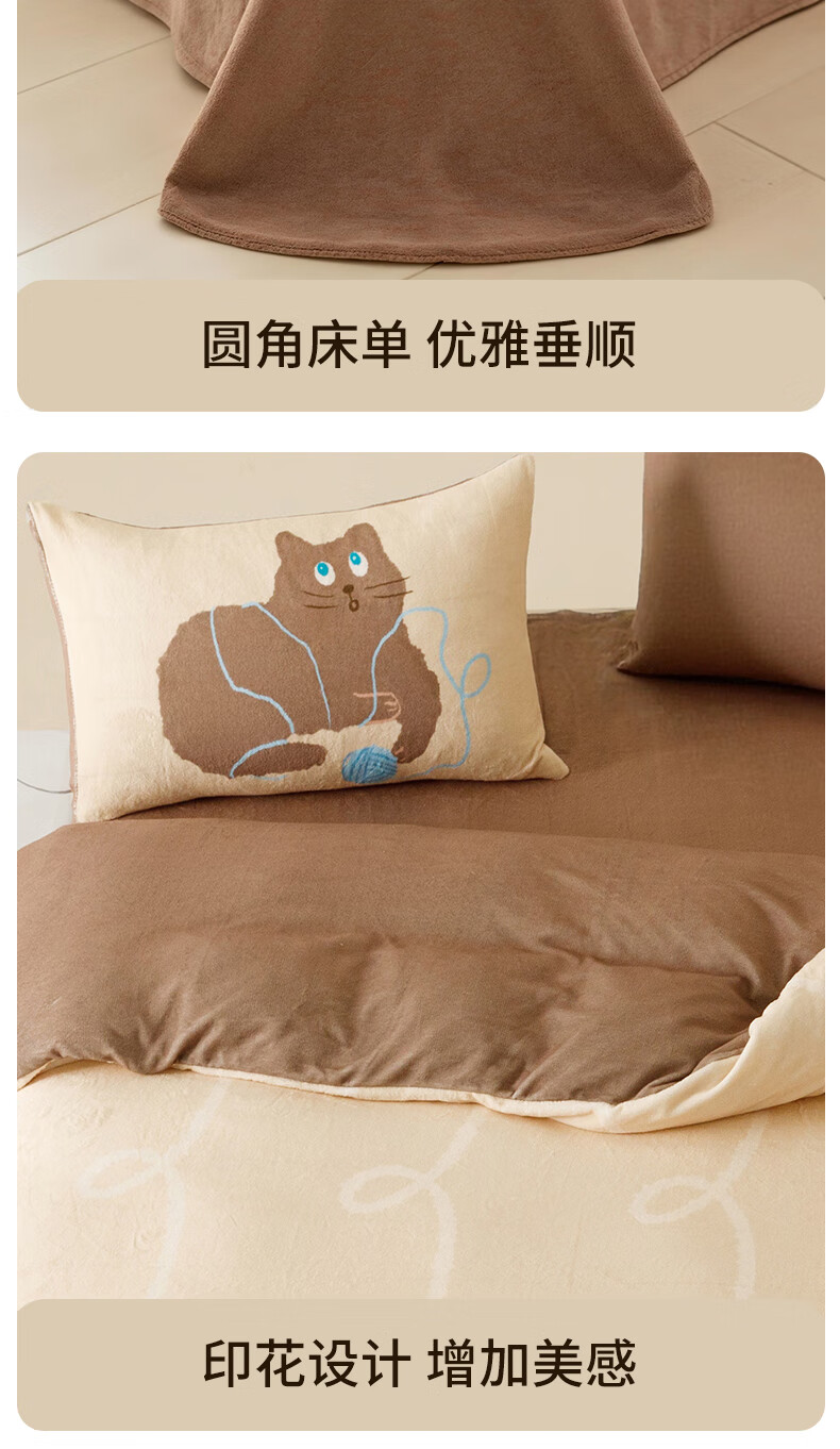 一默四件套冬季被套床单枕套床上用品加厚保暖毛线小猫牛奶绒四件套 毛线小猫 【团团棕】 床单款 (被套200*230cm)