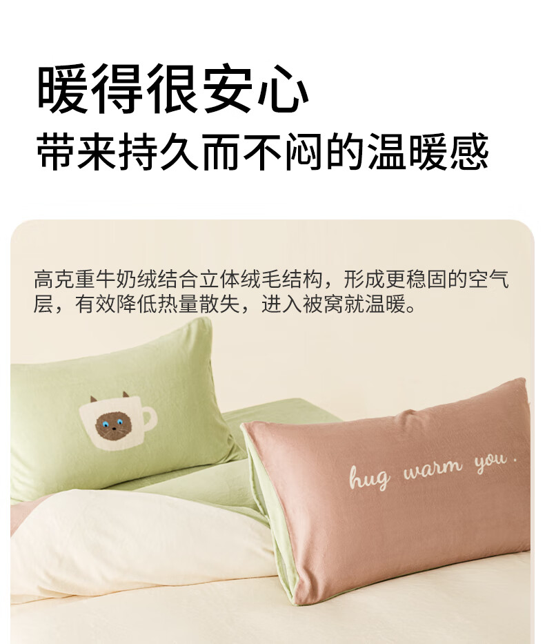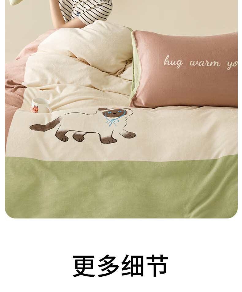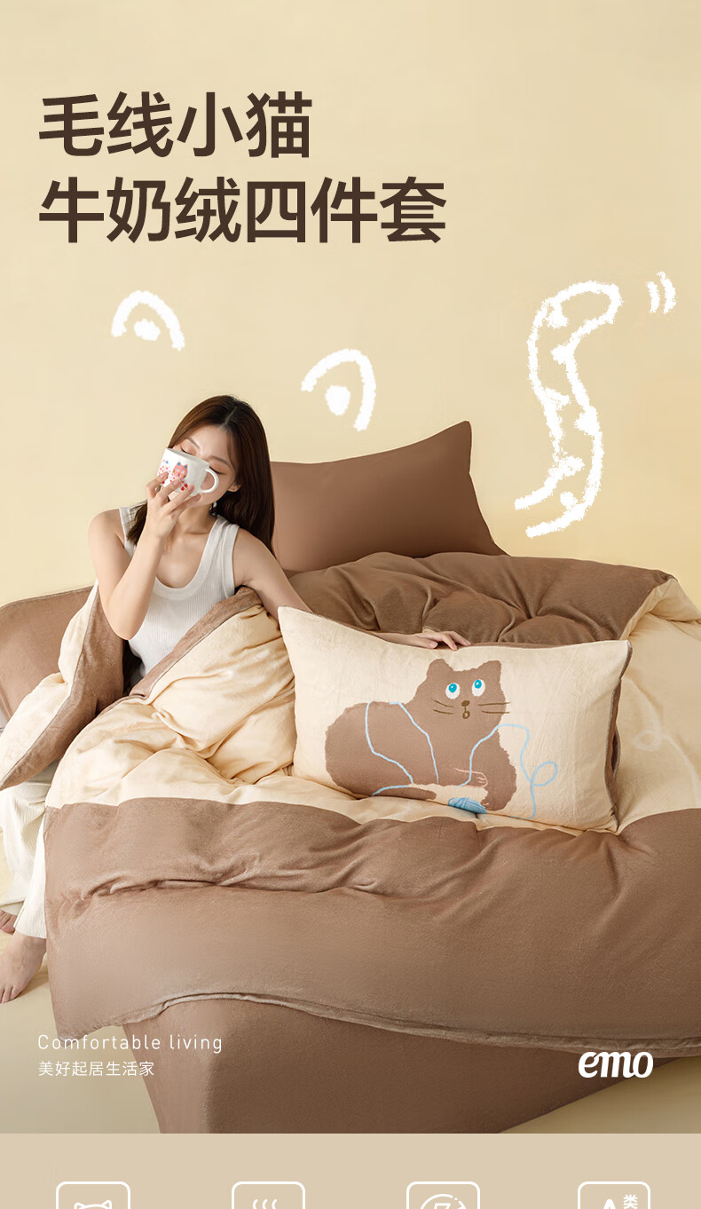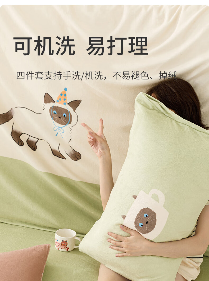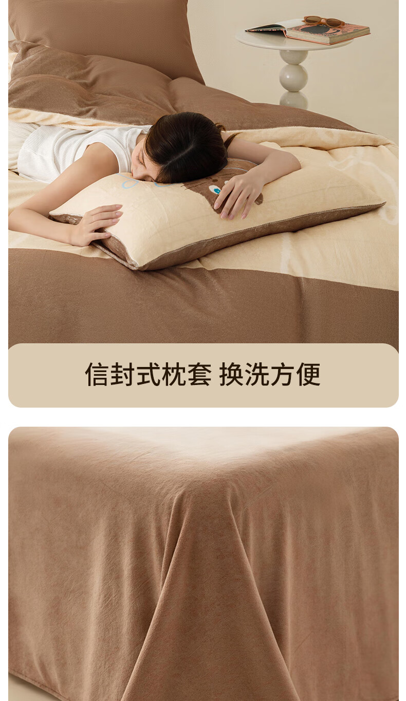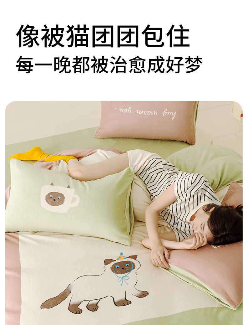 一默四件套冬季被套床单枕套床上用品加厚保暖毛线小猫牛奶绒四件套 毛线小猫 【团团棕】 床单款 (被套200*230cm)
