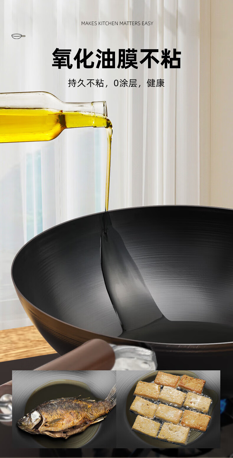 舌尖上的匠人炒菜锅不粘锅家用炒锅无涂层铁锅燃气灶电磁炉专用锅具 34CM加耳圆底锅(无锅盖)