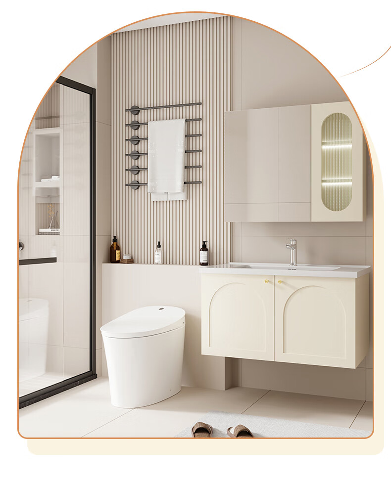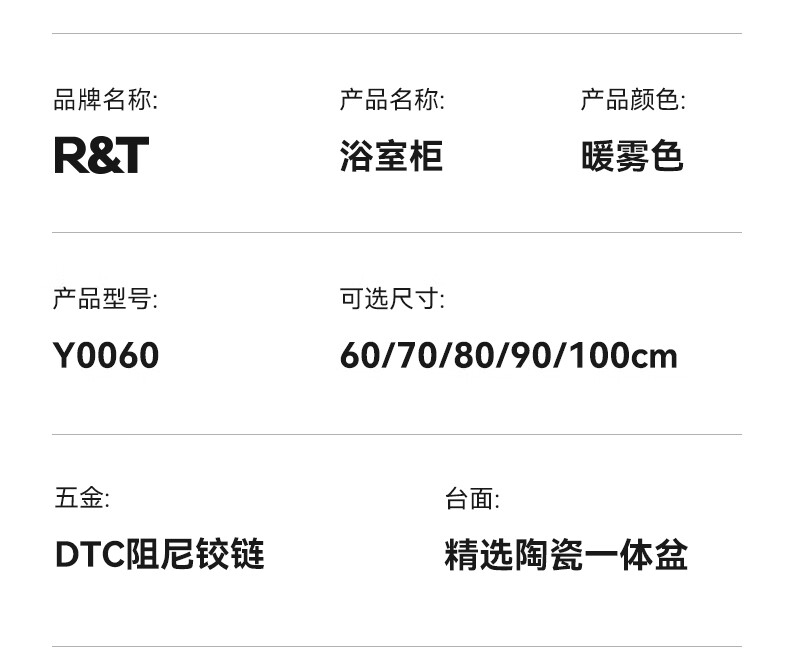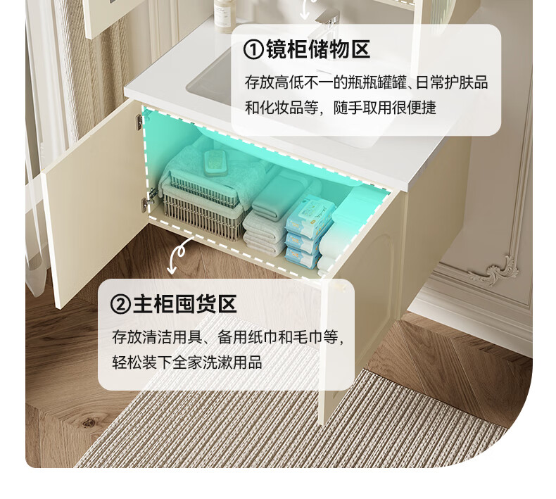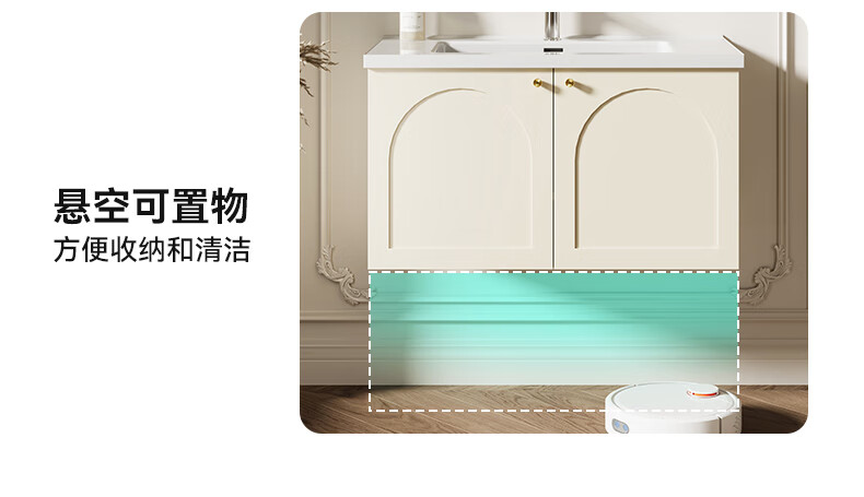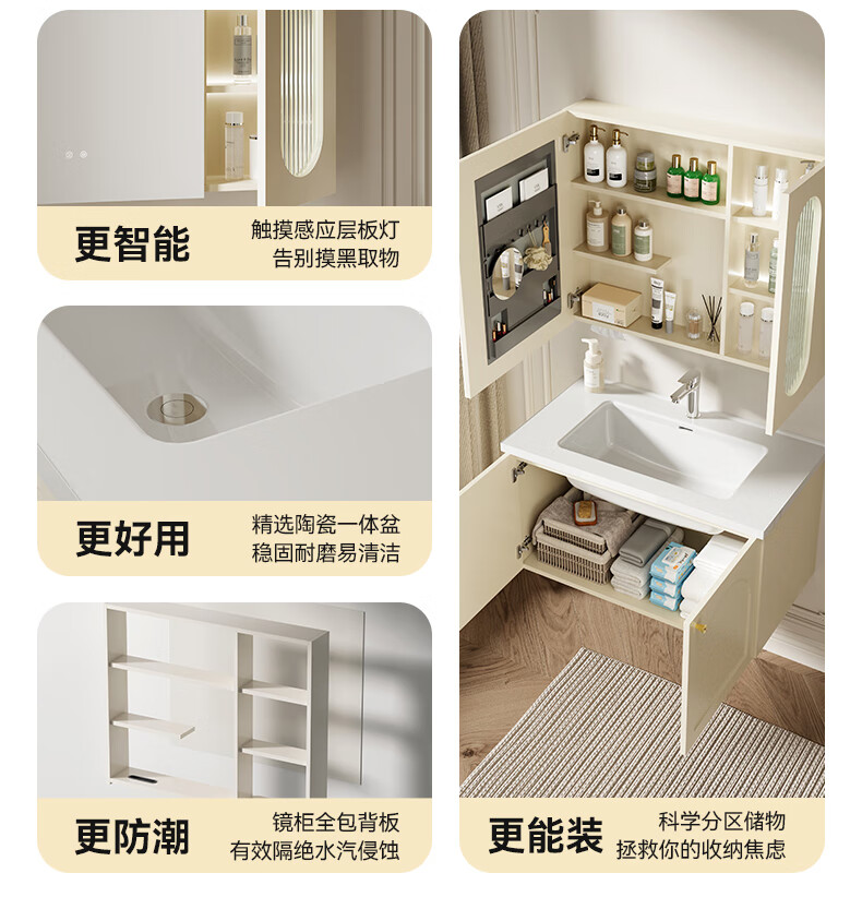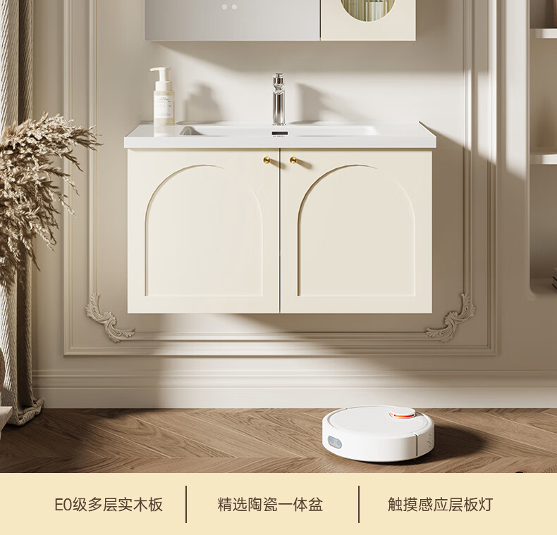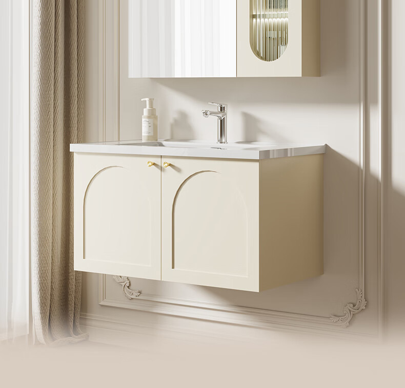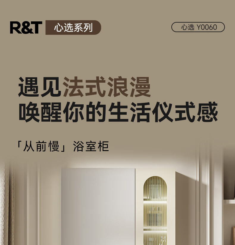 瑞尔特(R&T)2025新款法式浴室柜组合陶瓷一体盆卫生间洗脸洗漱台盆柜 Y0060-80cm【触摸感应板灯+精选陶瓷一体盆+一键除雾】