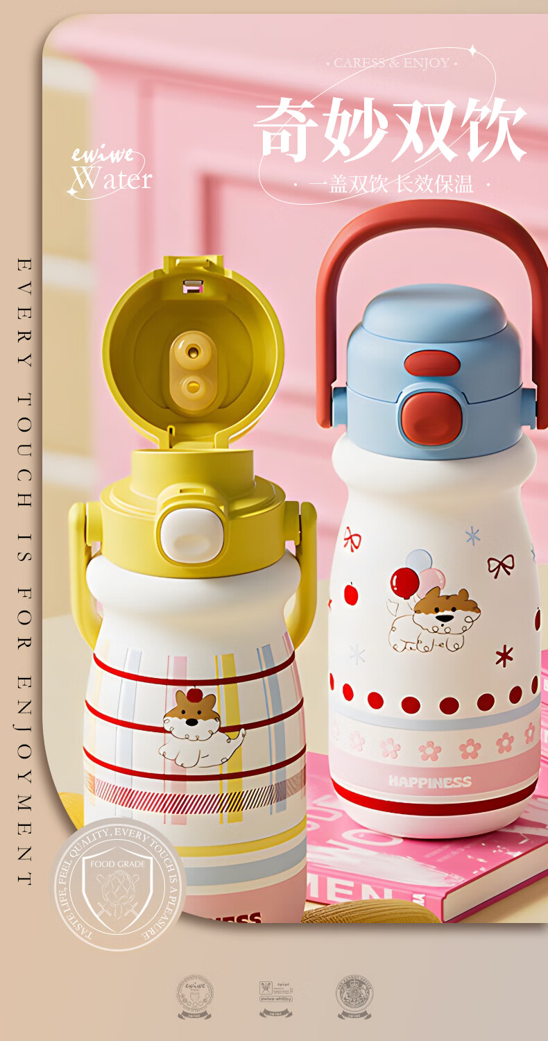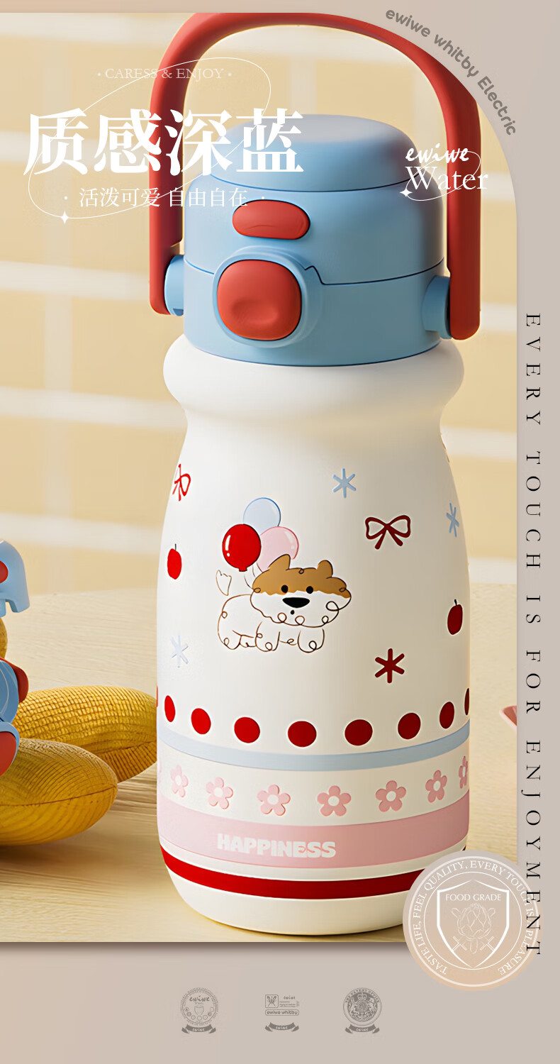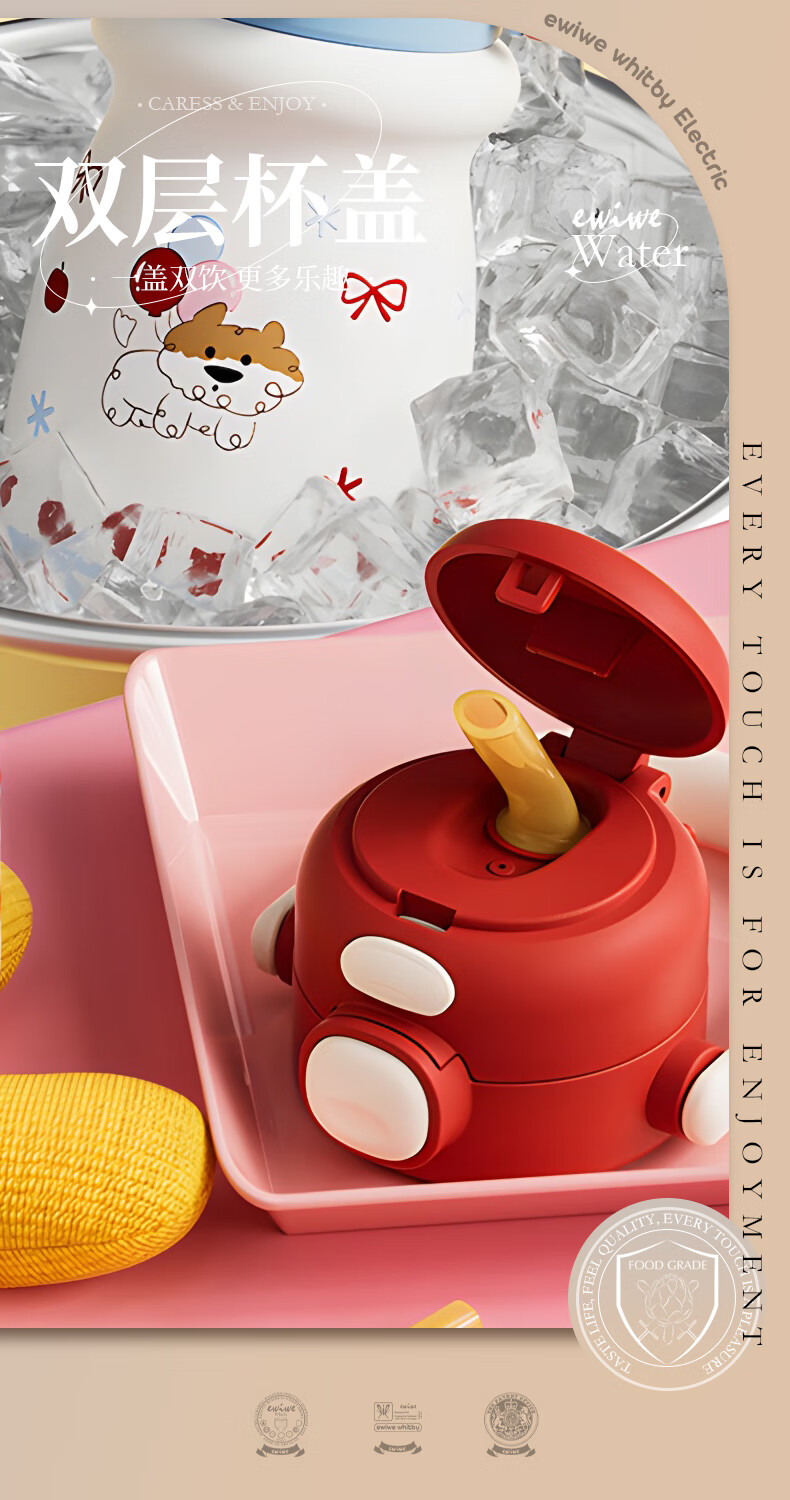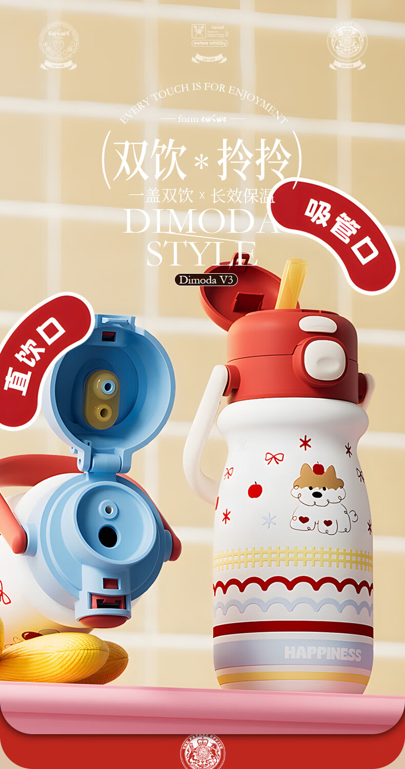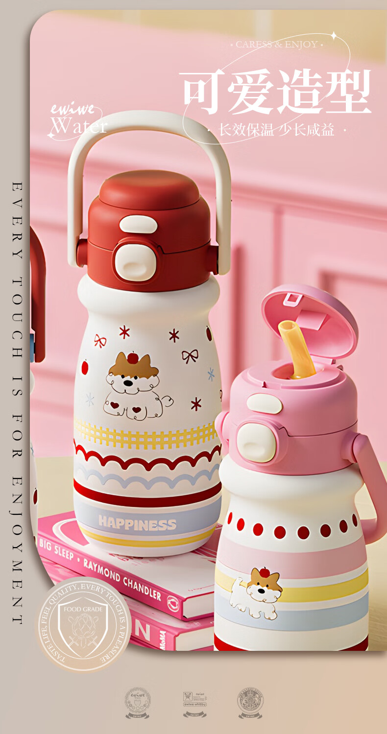 EWIWE新款卡通布拉拉保温杯男女孩防摔一杯双饮大容量便携吸管水杯 红色/食品不锈钢材质/约500ml
