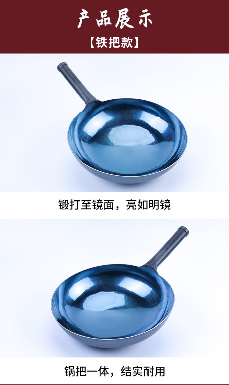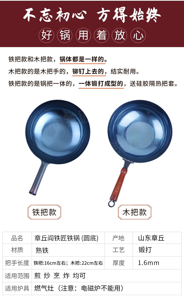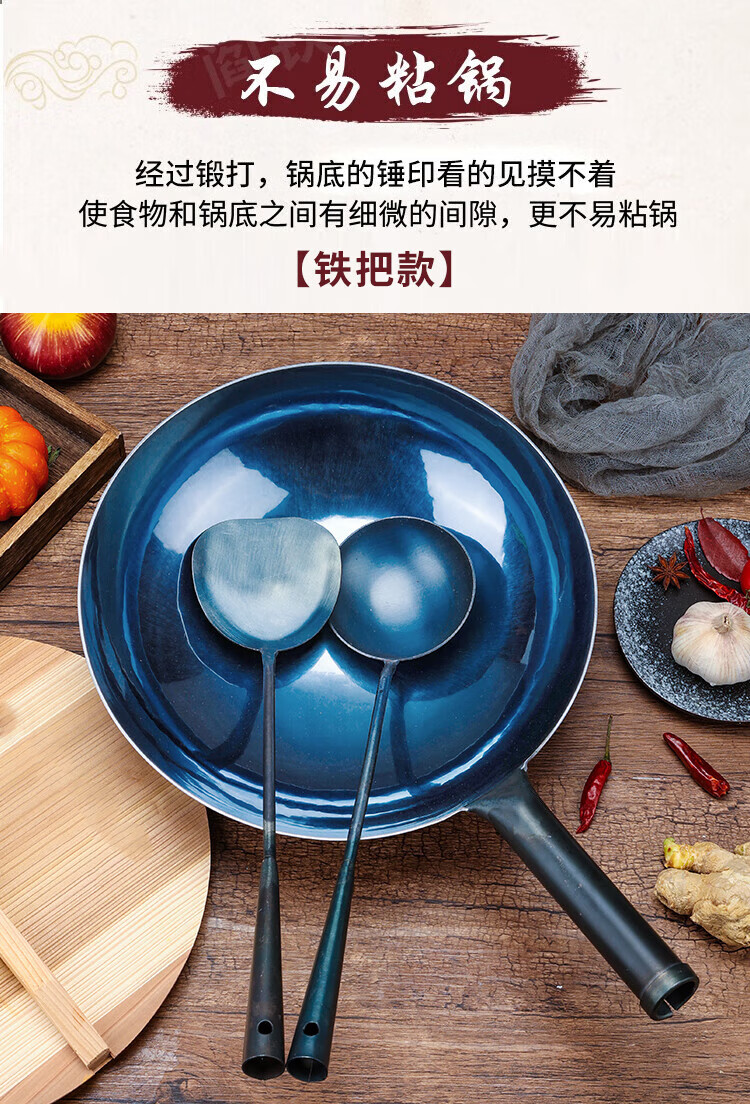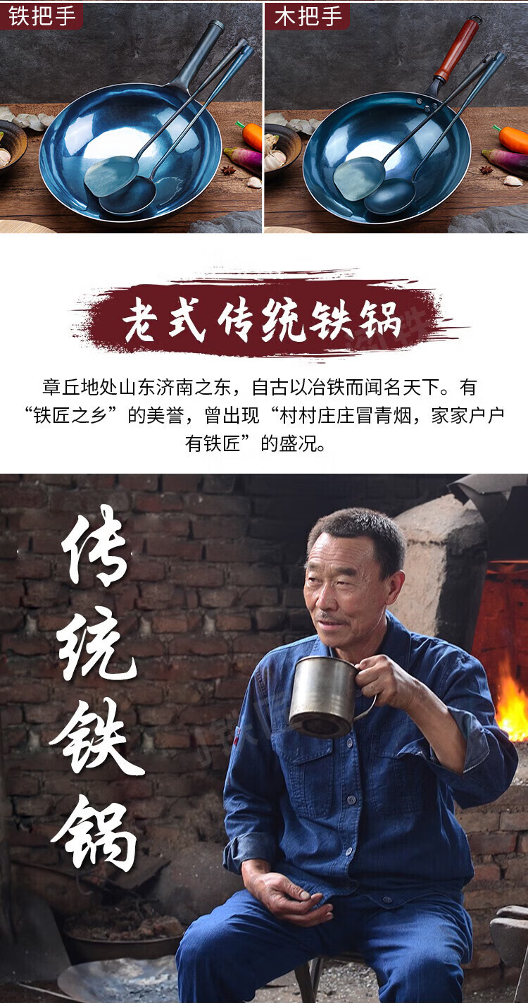 阎铁匠章丘炒锅铁锅轻便锻打炒菜锅无涂层老式物理不粘锅家用炒勺已开锅 轻便镜面木把32厘米 32cm
