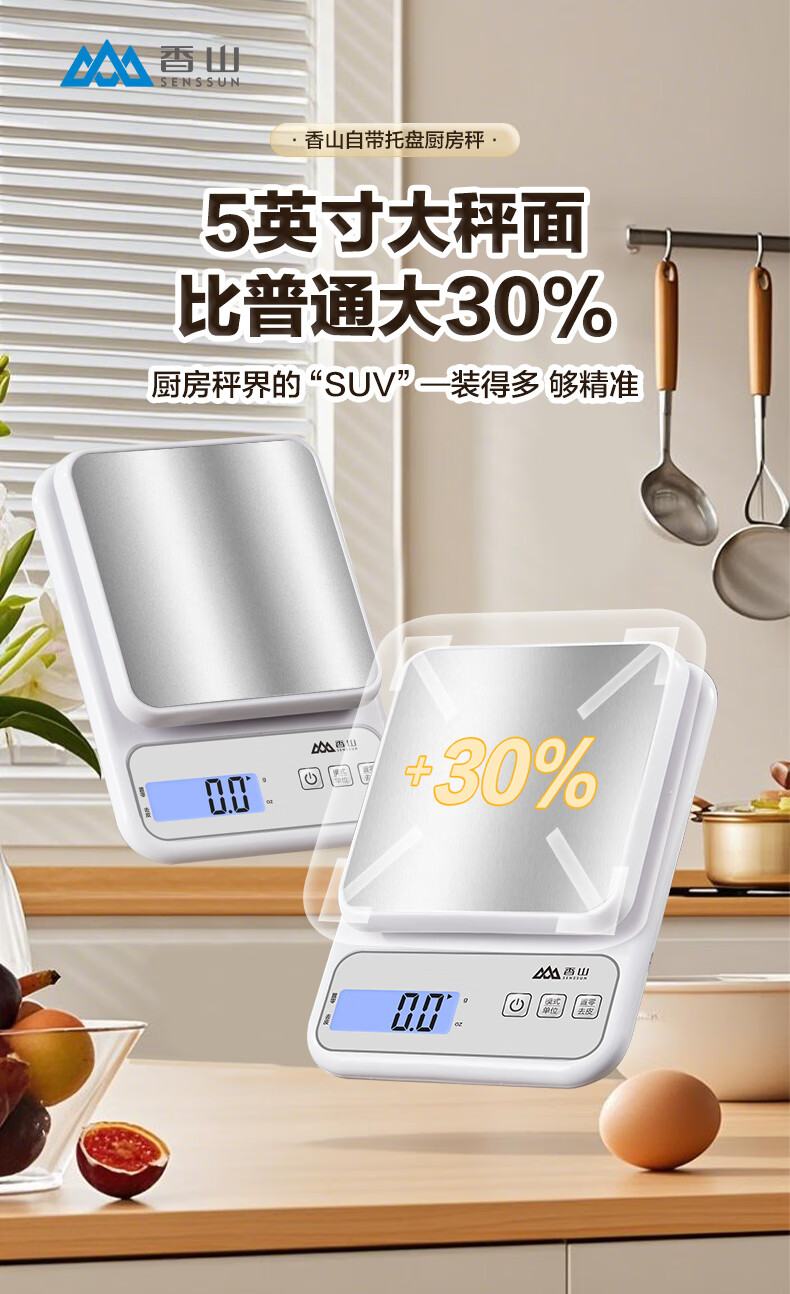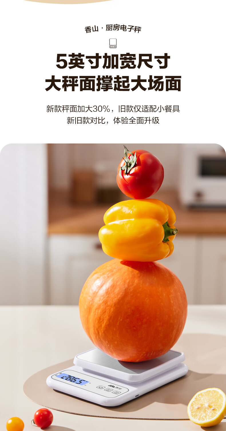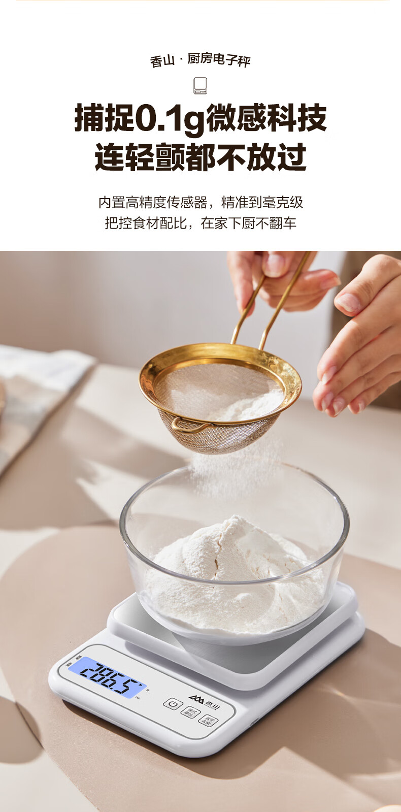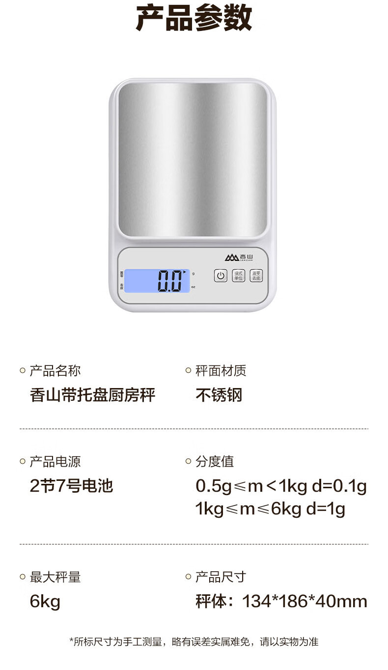 香山电子秤厨房秤 克重称精准0.1g 食物秤 不锈钢加大秤面 6kg电池款