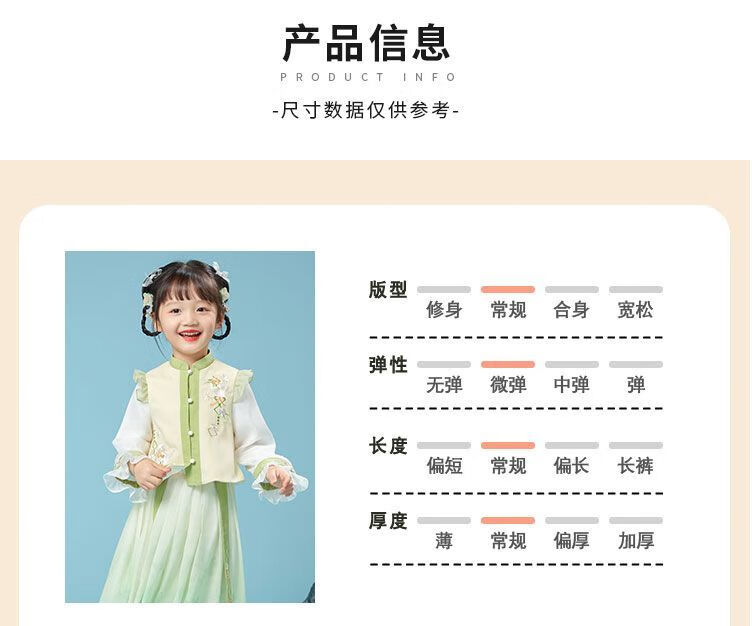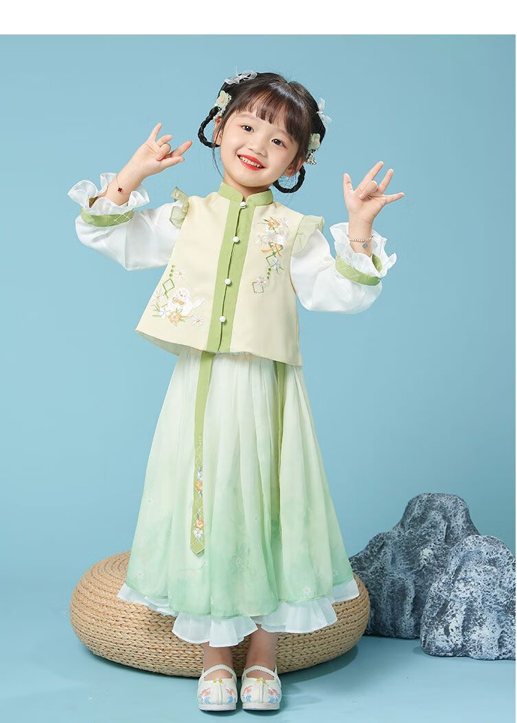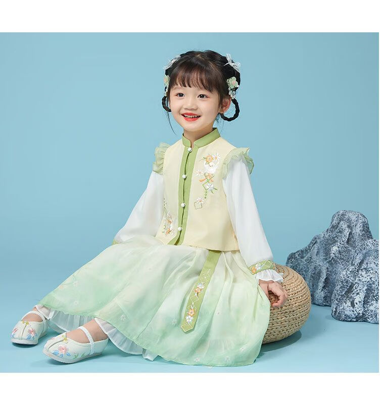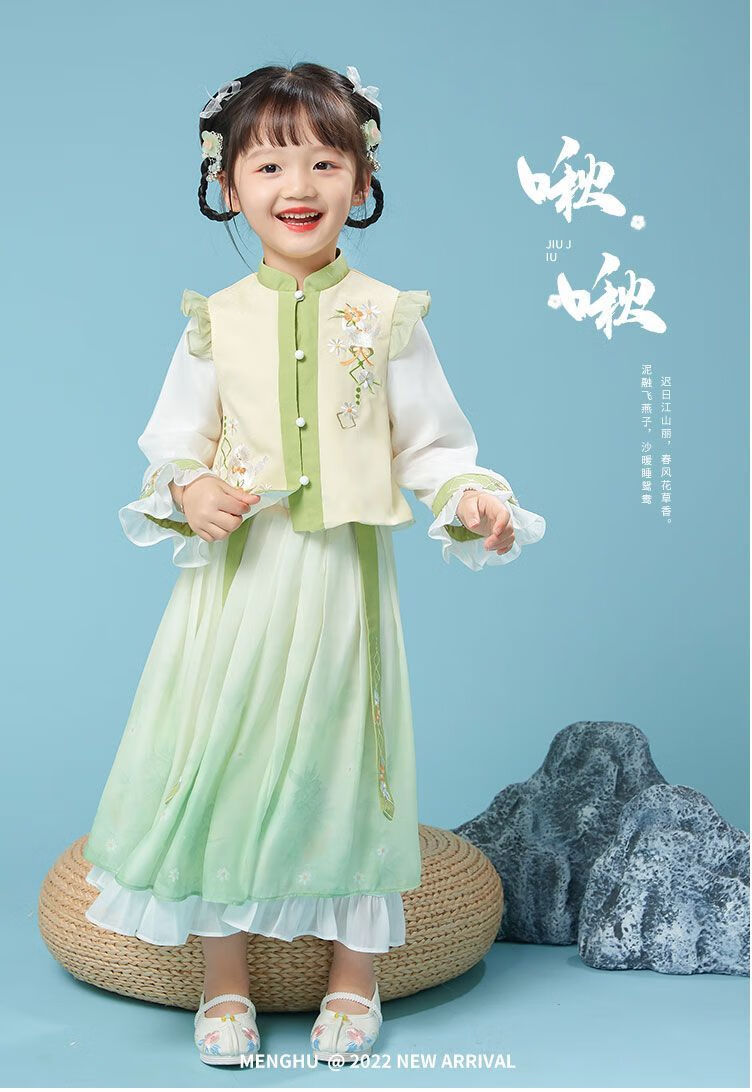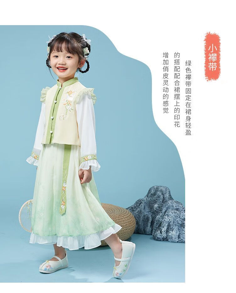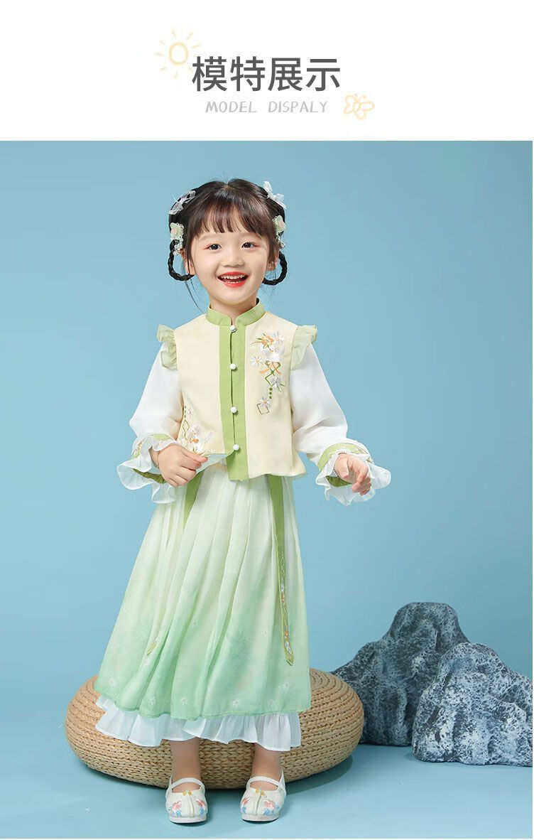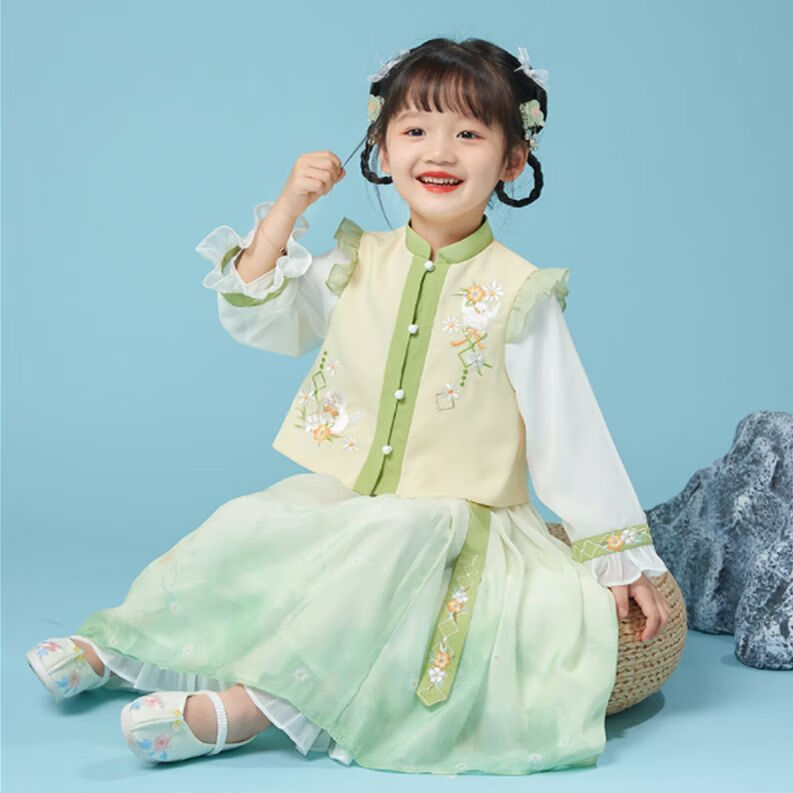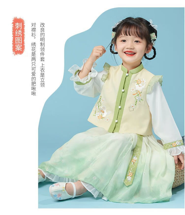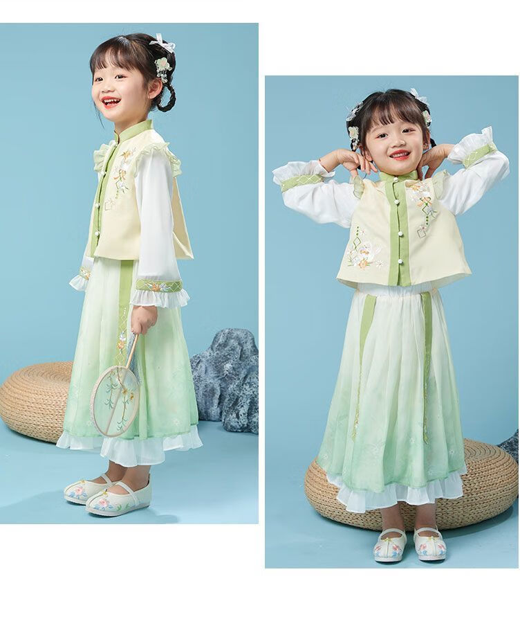 G.duck小黄鸭女童25年改良襦裙春秋季套装上衣长袖衫半身裙中国风汉服 黄绿裙 110 码建议身高100-110cm
