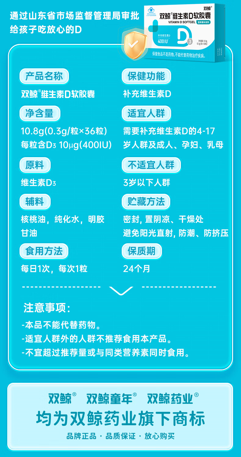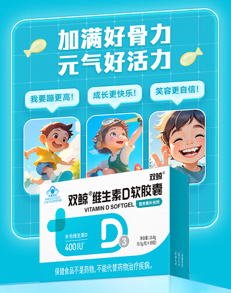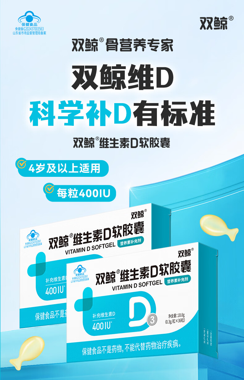 双鲸维生素d3软胶囊400单位36粒补d儿童成人孕妇补钙正品促钙吸收