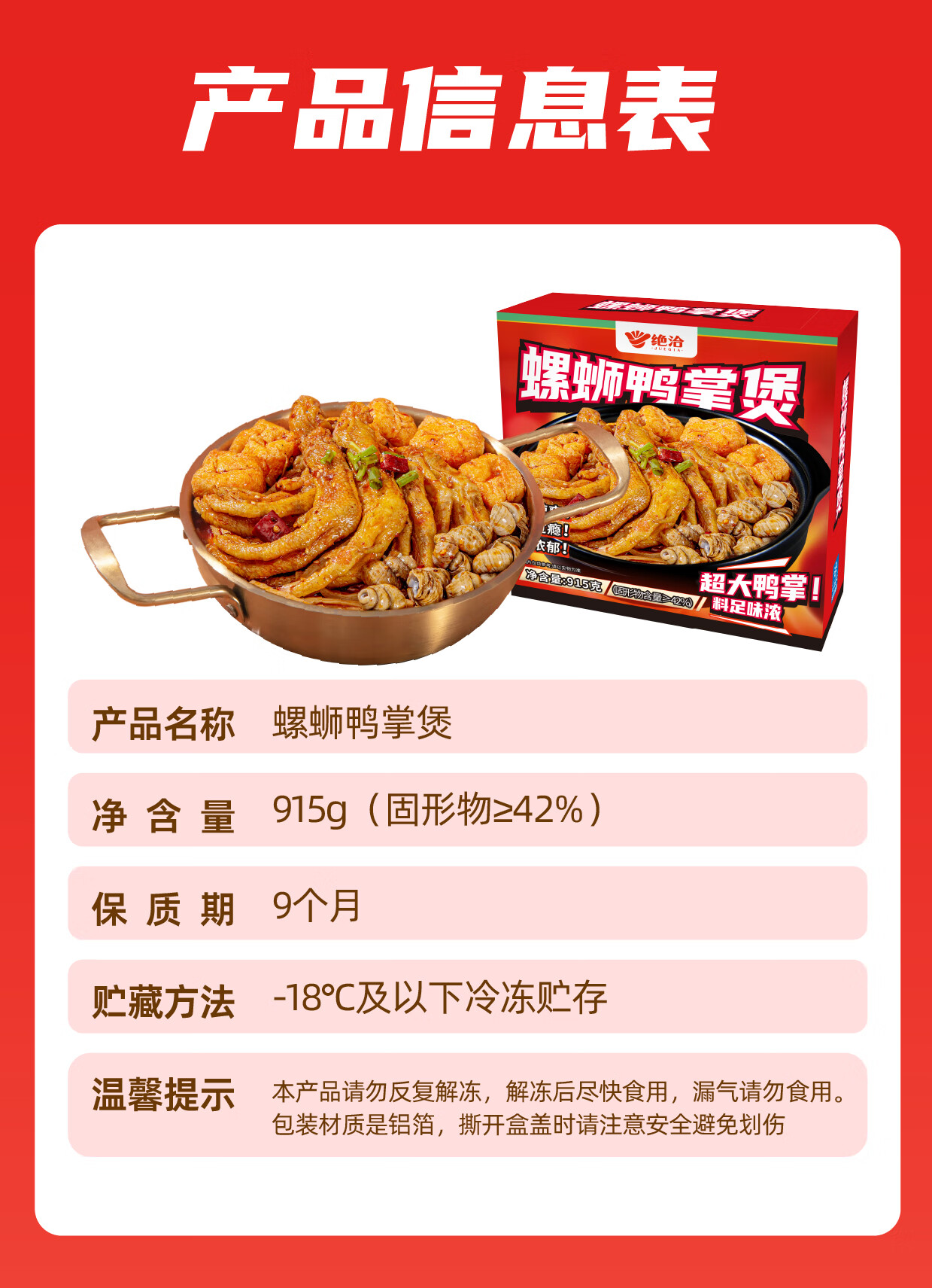 绝洽螺蛳鸭掌煲915g鸭脚煲柳州螺蛳粉火锅酸辣田螺煲门店同款冷链保鲜