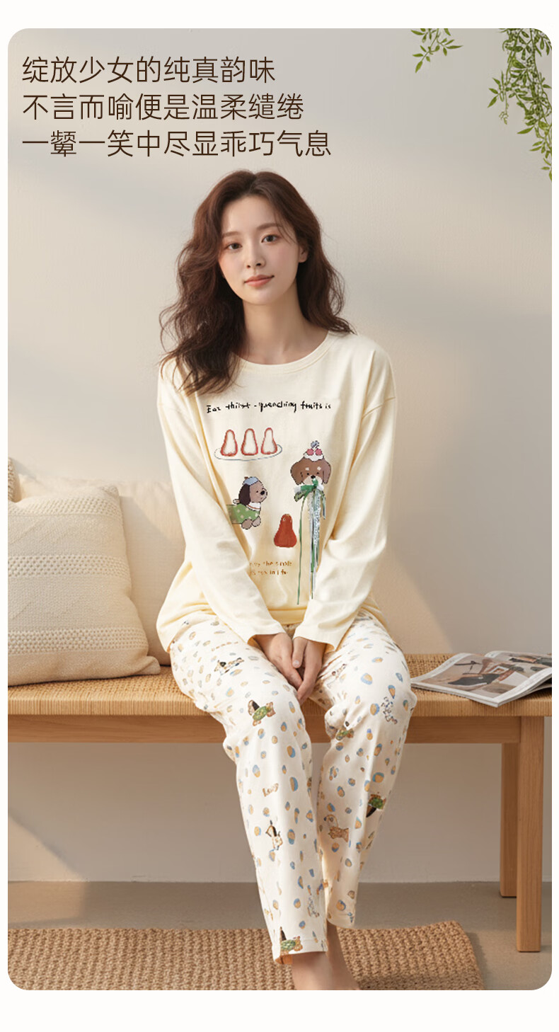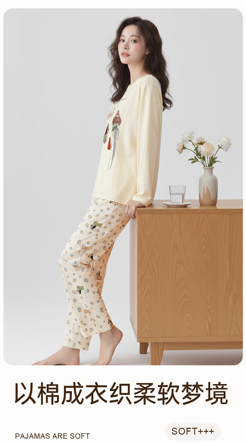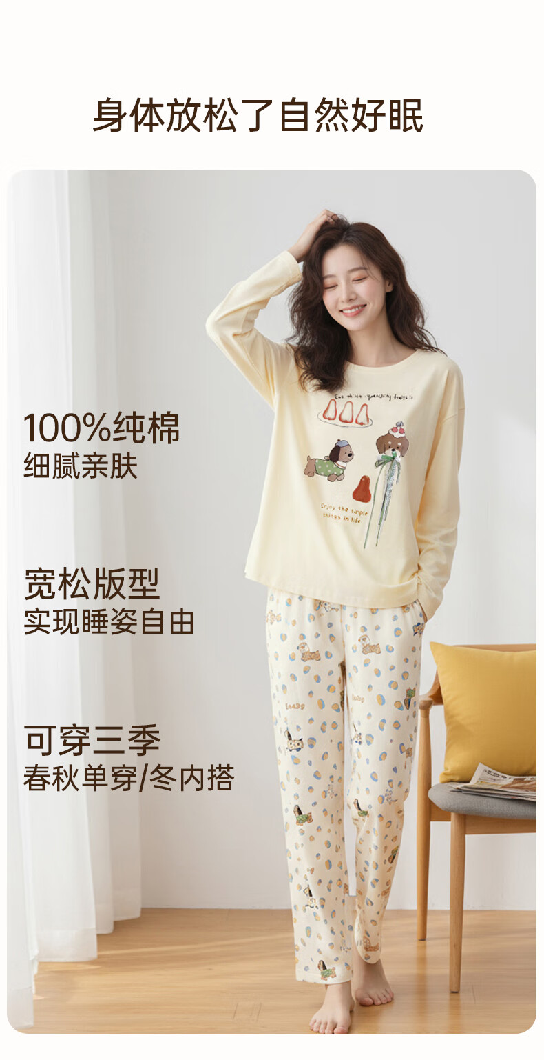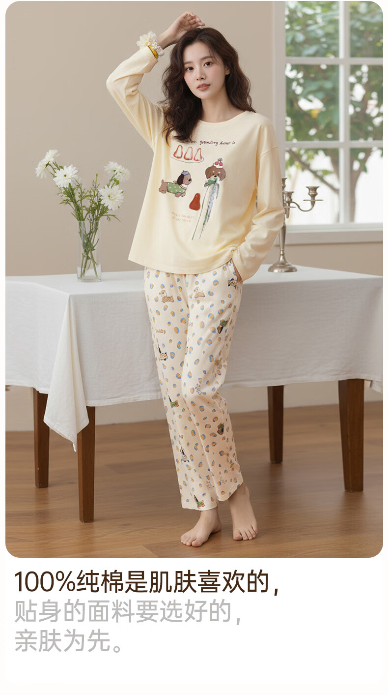 玛伦萨睡衣女100%纯棉春秋季2025新款可外穿长袖长裤套装女士全棉家居服 浅杏 M