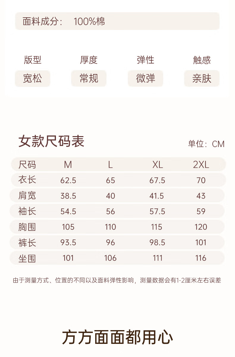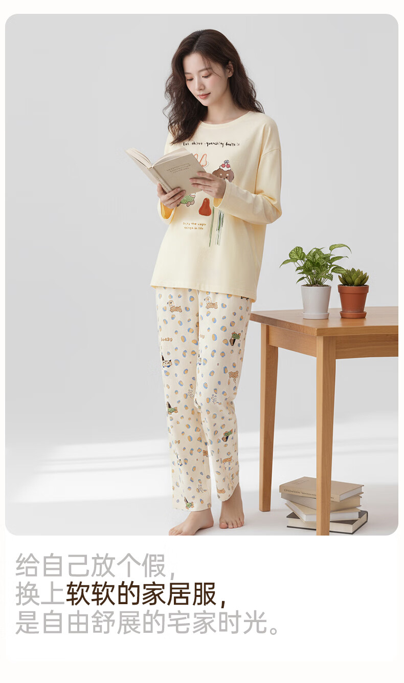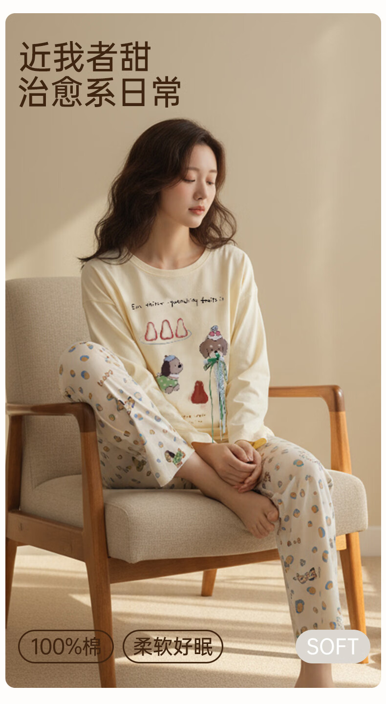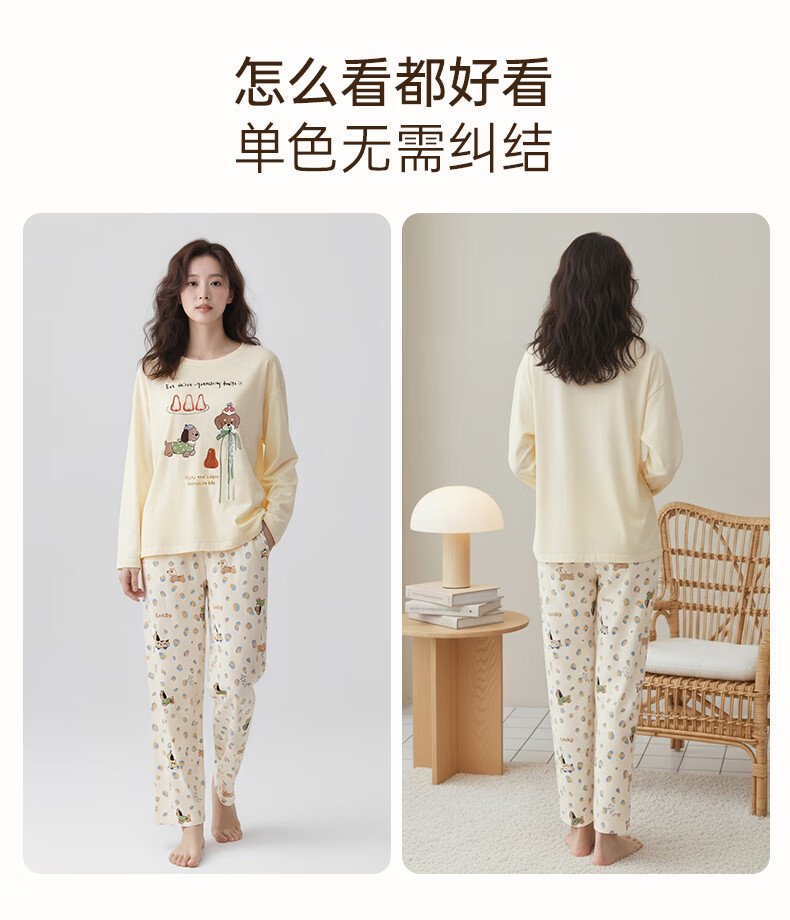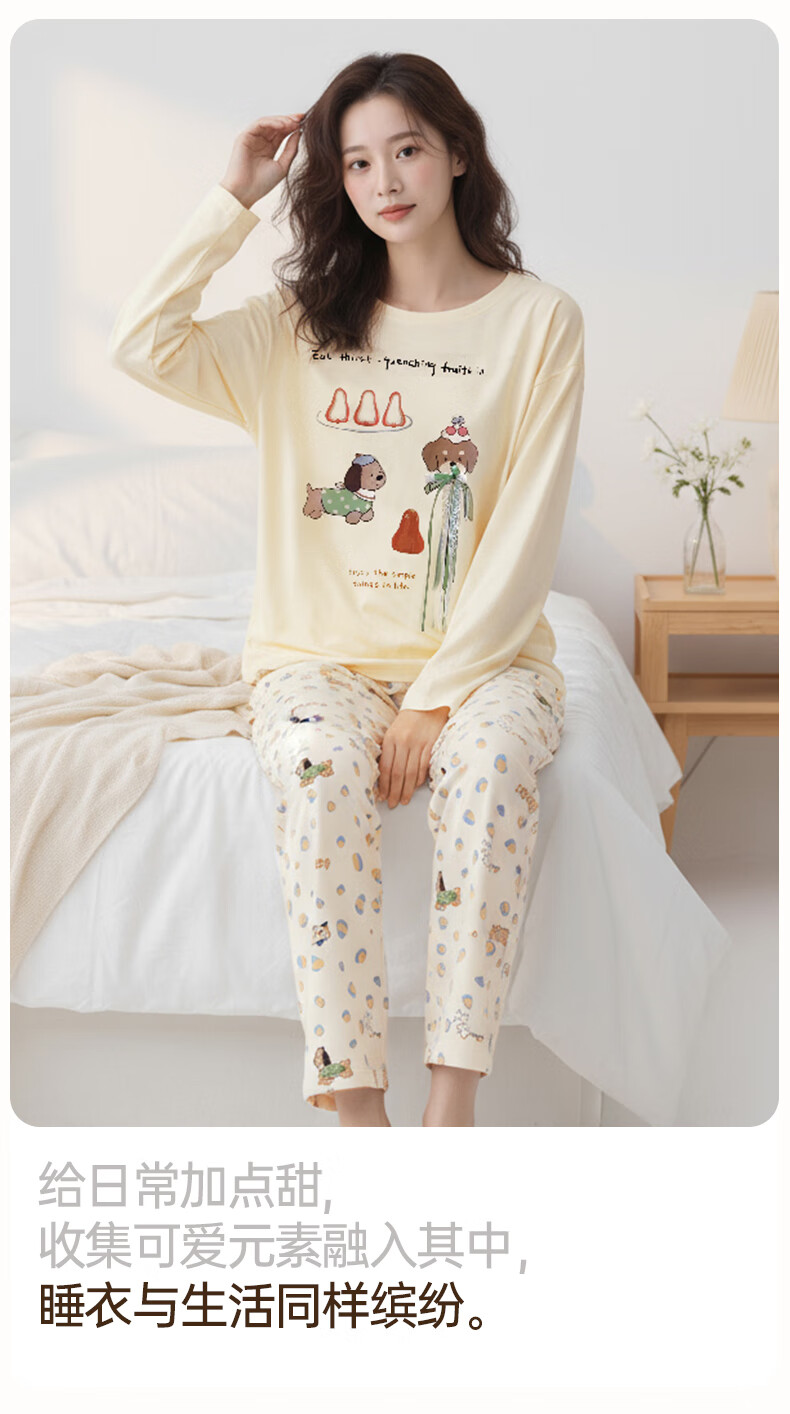 玛伦萨睡衣女100%纯棉春秋季2025新款可外穿长袖长裤套装女士全棉家居服 浅杏 M