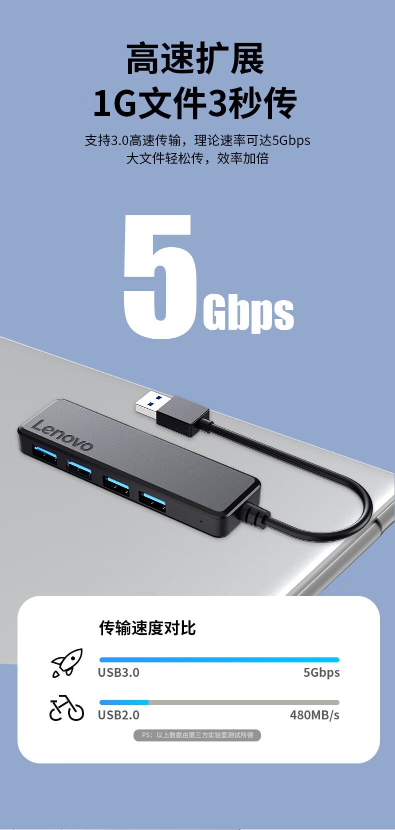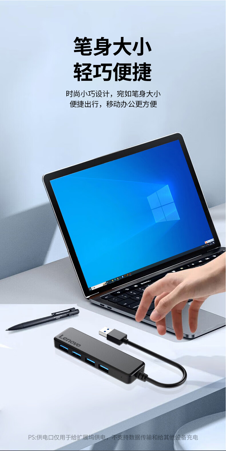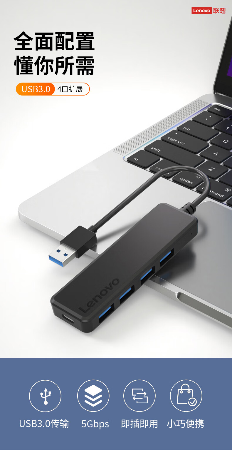 联想(Lenovo)USB分线器3.0接口转换器高速4口USB扩展坞转接头HUB集线器延长线扩展器拓展坞适用笔记本台式机
