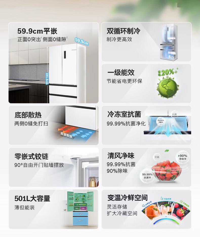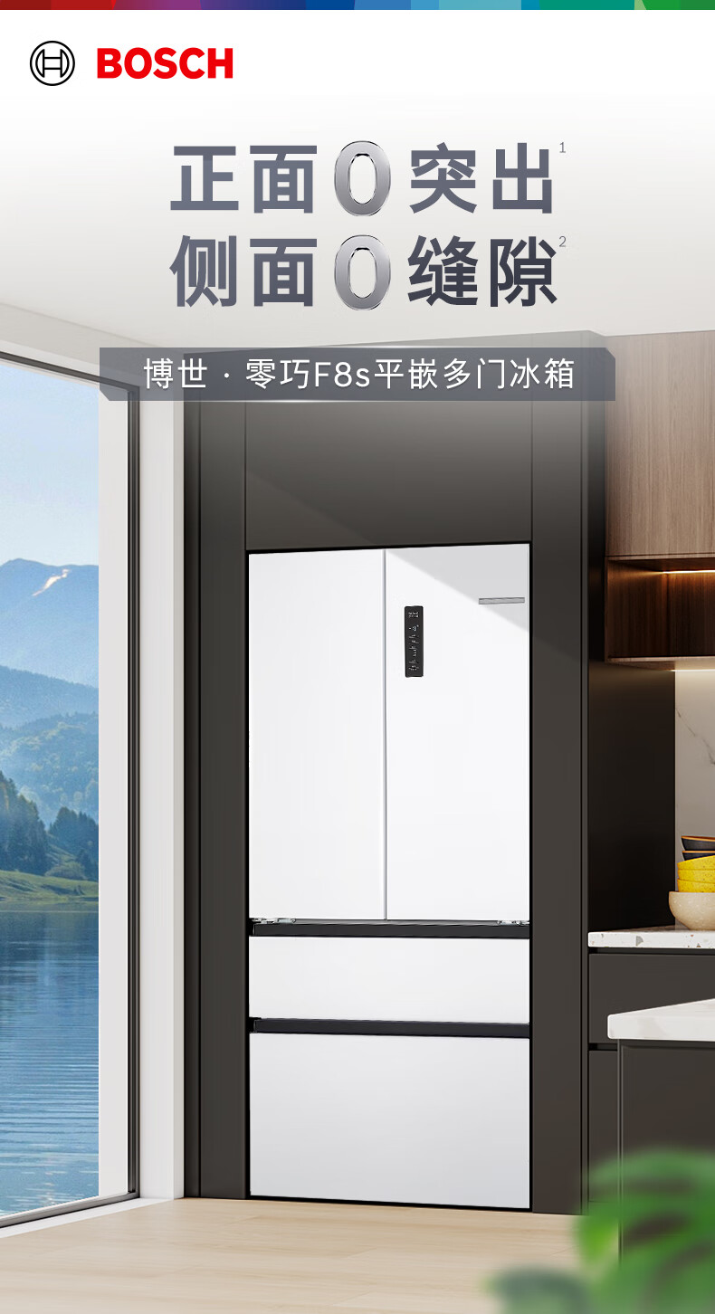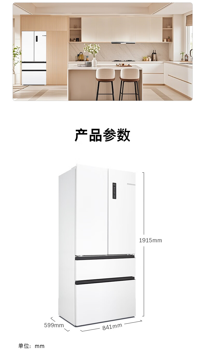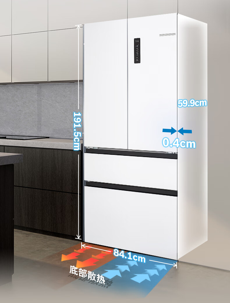 博世(BOSCH)冰箱【59.9cm超薄平嵌】501L法式四开门多门家用变频电冰箱 双循环大容量 清风净味 支持国家补贴 白色KME50A20TI